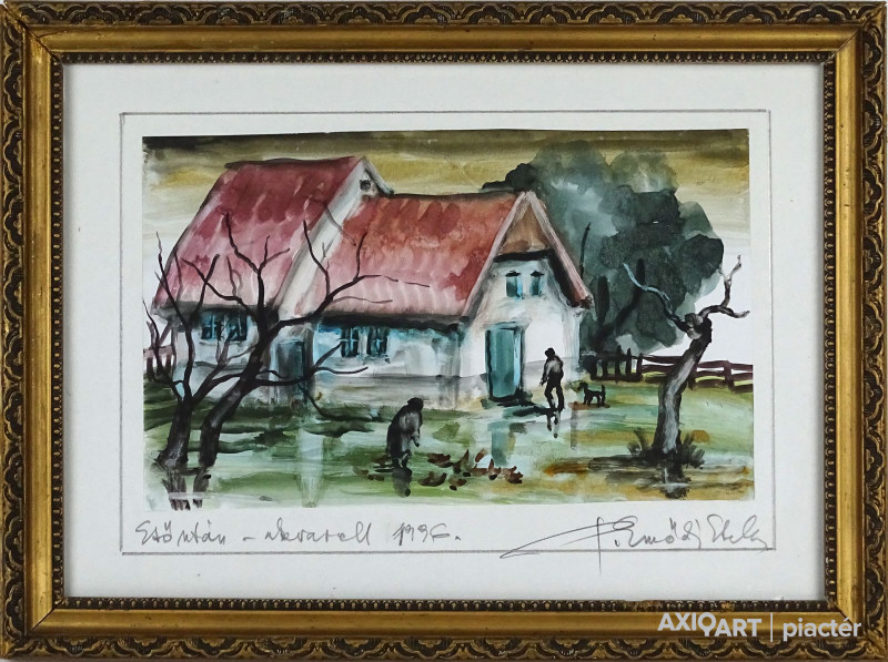 [1N009/081] Papír akvarell üveglap mögött, aranyozott keretben. Akasztási lehetőséggel rendelkezik. Jelzés jobbra lent: P. EMŐDI ETELKA (Péli Emődi Etelka) Balra lent kép címe, technika: ESŐ UTÁN - AKVARELL 1996. Magasság: 23.5 cm Szélesség: 30.3 cm Súly: 0.45 kg Péli Etelka Erzsébet festő, grafikus, keramikus Nagyvárad [Oradea, RO], 1945-07-19 Névváltozat: P. Emődi Etelka 1970: kolozsvári Ion Andeescu Képzőművészeti Főiskola, kerámia szak, mesterei: Márkos András, Balaskó Nándor. 1990-től a Magyar Képzőművészek és Iparművészek Szövetsége, 1997-től az Egyetemes Magyar Képzőművészeti Szövetség tagja. 1970-90 között a nagyváradi Arta Crisana kisipari szövetkezet tervezője volt. 1970-89 között rendszeresen részt vett a nagyváradi őszi és tavaszi tárlatokon. 1990-től Magyarországon él. Kisplasztikák, faliplakettek és használati tárgyak készítése mellett festményeiben, grafikáiban az erdélyi tájat, jellegzetes építészetet mutatja be. Egyéni kiállítások Egyéni kiállítások 1986 • Bábszínház, Nagyvárad 1996 • Volán Elektronikai Rt., Budapest 2000 • Sóskút, Andreetti K. Általános és Művészeti Iskola, Sóskút. Válogatott csoportos kiállítások Válogatott csoportos kiállítások 1999 • TYRESÖ, Stockholm • Iparművészeti Múzeum, Budapest • Királyi Kastély Lovarda, Gödöllő. Művek közgyűjteményekben Művek közgyűjteményekben M. Tárii Crisurilon, Nagyvárad.  Forrás: artportal.hu