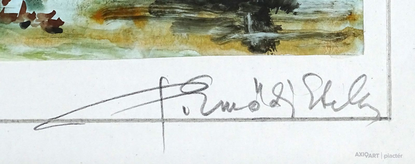 [1Y029/Z018] Olaj farost festmény, üveglap mögött, hibátlan képcsarnokos keretben. Hátoldalán Képcsarnok Vállalat papír címkéje: A művész neve: SCHÉNER MIHÁLY A kép címe: TÁJ Magasság: 66.5 cm Szélesség: 86 cm Súly: 6.54 kg Schéner Mihály festő, grafikus, szobrász, keramikus, bábtervező Medgyesegyháza, 1923-01-9 Elhalálozott: Budapest, 2009. május 11. Honlap: http://www.kormendigaleria.hu/kiadvany.html 1942-1947: Magyar Képzőművészeti Főiskola, tanára: Rudnay Gyula. 1978: Munkácsy-díj; 1984: érdemes művész; 1989: kiváló művész; 1995: Kossuth-díj. 1992-től a Magyar Művészeti Akadémia, 1993-tól a Széchenyi Irodalmi és Művészeti Akadémia tagja. 1956-ig tanított. 1982: Nagyatádi Faszobrász Alkotótelep, 1985: Nemzetközi Acélszobrász Alkotótelep, Dunaújváros. A stílusában felismerhető, mégis sokféle műtárgyat létrehozó ~ gazdag, állandóan alakuló életműve a folyton változó világban helyét kereső, az alkotói szabadságot megvalósító XX. századi képzőművész példázata lehetne. Magát expresszív-szürrealista alkotónak nevezi. Egyaránt dolgozik festékkel, textillel, fával, fémmel. Rajzol, szerkeszt, farag, épít, gyúr, varr és ragaszt, felhasználja a mézesbábok öntőformáit. Festő, rajzoló, textilszobor- és bábkészítő, fazekas, asztalos, esztergályos. Háromlépcsős folyamatban gondolkozik: rajzban tervez, majd fest, szobrot készít, “formába önt”, mindig a végső plasztikai megoldást keresi. Ami állandó és mégis játékosan változékony megjelenésű Schéner művészetében, az a gyermekkori emlékek által meghatározott népi mesterségek iránti tiszteletet kifejező motívumkincs, a tárgyi folklór formakészlete, amely már-már kézjegyként ismétlődik munkáin. Mitologikussá nőtt képzelete új lényeket teremt, pl: a Pigulát, amely disznótestű, emberfejű teremtmény. Schéner festményein a szürrealista motívumokat konstruktív szerkezetbe rendezi, a geometriát és az organikus természeti motívumokat egyaránt beépíti műveibe. A népi, népművészeti formakincsből merített lovas huszárok, betyárok, szegénylegények cifra szűr mentéje, piros csákója, fekete csizmája, az önálló életet élő zsinórdíszek és mézeskalács bábok, a kiskocsik a gyermekkori vásárok, búcsúk színes forgatagába vezet. A primér motívumokat aztán felváltják a vastagon felhordott felületbe karcolt jelek, vonalhálózatok, amelyek a játszó gyermek homokba rajzolt ábráit, a pásztorember fába vésett üzeneteit, az ősember barlang falába rótt mágikus jeleneteit idézik meg. A művész pillanatnyi érdeklődésének megfelelően a színek búvópatakként tűnnek el és jelennek meg ismét. A 60-as években leginkább a formákkal való játék érdekelte, a festmények felülete egyre gazdagodott: a táblaképek felületén applikációk jelentek meg, vagy lemállasztott rétegek hagyták maguk után hiányukat, motívumok nélküli ősformák, archetipikus képzetek bukkantak fel művészetében. A véletlenszerűnek látszó rétegekkel való játék azonban tudatos komponálás eredménye, amely később nyilvánvaló ritmusnak és formai szerkesztettségnek adja át a helyét, mint a Törvénytáblák c. sorozaton. A különböző művészi kifejezési formák egymásra termékenyítő hatással vannak, át- meg áthatják egymást. Textilszobrai, amelyekkel új műfajt teremtett, ugyanazzal az automatikus, expresszív-szürrealista módszerrel készülnek, mint festményei. A hagyományosan a népművészetben alkalmazott anyag, a filc lehetőséget ad a népi formakincs felelevenítésére, amely azonban a művész különös szürrealista átiratában jelenik meg. A szívekkel kivarrt, zsinórdíszes Posztókotlós c. művén mézesbábok lógnak, hátán huszárok lovagolnak. Egész sor textilből készült kéz-plasztikát alkot, amelyeket az ujjakra rávarrt díszekkel öltöztet, személyesít meg. A színes-különös világból aztán ~ újra puritán képi és formai rendbe juttatja el a nézőt, majd nemsokára tépett, gyűrt, vágott, csorgatott, repedezni hagyott szenvedélyesen vonagló képi felületeket hagy hátra. Schéner készített apró gyermekjátékokat, térstruktúra-tereket, mászókákat is. A magyar népi formák mellett szürreális játékaiban gyakran alkalmaz görög mitológiai alakokat, “elkentaurosodott” lovakat, Gorgó-fejeket, sellőket, hárpiákat, Pán-ábrázolásokat. Schéner nemcsak saját művészetéről publikál, hanem művésztársairól is számos írása jelenik meg, elsősorban az Új Auróra c. folyóiratban, amelynek egy ideig főmunkatársa volt. Irodalom kiállítása, Magyar Építőművészet, 1962/4. Húsz év után, Művészet, 1965/4. BOZÓKY M.: ~, Tiszatáj, 1968/5. PERNECZKY G.: Nincs uborkaszezon, Élet és Irodalom, 1969. augusztus 8. BARÁNSZKY-JÓB L.: ~, Művészet, 1969/9. LÁSZLÓ GY.: ~ kaposvári kiállítása, Jelenkor, 1969/4. MAJOR M.: Pásztorok, betyárok, huszárok - kezek, Tükör, 1970. szeptember 15. FRANK J.: Bemutatjuk ~t, Élet és Irodalom, 1972. május 6. ról kiállítása ürügyén, Képzőművészeti Almanach, Budapest, 1972 Sötétkék kokasok, Élet és Irodalom, 1973. szeptember 9. MAJOR M.: ~ játékai, Élet és Irodalom, 1974. július 27. BARTA J.: Egy különös művész, Alföld, 1974/6. VADAS J.: Szárnykészítők, Élet és Irodalom, 1975. október 4. JUHÁSZ F.: A halál ellen játszani, Élet és Irodalom, 1975. május 17. PAP G.: Kincsek és műkincsek, Művészet, 1975/6. P. SZŰCS J.: Az utak kettéválnak, Művészet, 1978/3. Békési művészet, Művészet, 1978/7. SZAMOSI F.: ~ [kismonográfia], Budapest, 1978 VADAS J.: Játék a játékkal, Élet és Irodalom, 1979. augusztus 18. NÉMETH L.: ~ műveiről, Művészet, 1979/4. MIKLÓS P.: Mit akar ez a múzeum?, Művésze