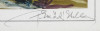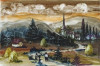 [1Y029/Z018] Olaj farost festmény, üveglap mögött, hibátlan képcsarnokos keretben. Hátoldalán Képcsarnok Vállalat papír címkéje: A művész neve: SCHÉNER MIHÁLY A kép címe: TÁJ Magasság: 66.5 cm Szélesség: 86 cm Súly: 6.54 kg Schéner Mihály festő, grafikus, szobrász, keramikus, bábtervező Medgyesegyháza, 1923-01-9 Elhalálozott: Budapest, 2009. május 11. Honlap: http://www.kormendigaleria.hu/kiadvany.html 1942-1947: Magyar Képzőművészeti Főiskola, tanára: Rudnay Gyula. 1978: Munkácsy-díj; 1984: érdemes művész; 1989: kiváló művész; 1995: Kossuth-díj. 1992-től a Magyar Művészeti Akadémia, 1993-tól a Széchenyi Irodalmi és Művészeti Akadémia tagja. 1956-ig tanított. 1982: Nagyatádi Faszobrász Alkotótelep, 1985: Nemzetközi Acélszobrász Alkotótelep, Dunaújváros. A stílusában felismerhető, mégis sokféle műtárgyat létrehozó ~ gazdag, állandóan alakuló életműve a folyton változó világban helyét kereső, az alkotói szabadságot megvalósító XX. századi képzőművész példázata lehetne. Magát expresszív-szürrealista alkotónak nevezi. Egyaránt dolgozik festékkel, textillel, fával, fémmel. Rajzol, szerkeszt, farag, épít, gyúr, varr és ragaszt, felhasználja a mézesbábok öntőformáit. Festő, rajzoló, textilszobor- és bábkészítő, fazekas, asztalos, esztergályos. Háromlépcsős folyamatban gondolkozik: rajzban tervez, majd fest, szobrot készít, “formába önt”, mindig a végső plasztikai megoldást keresi. Ami állandó és mégis játékosan változékony megjelenésű Schéner művészetében, az a gyermekkori emlékek által meghatározott népi mesterségek iránti tiszteletet kifejező motívumkincs, a tárgyi folklór formakészlete, amely már-már kézjegyként ismétlődik munkáin. Mitologikussá nőtt képzelete új lényeket teremt, pl: a Pigulát, amely disznótestű, emberfejű teremtmény. Schéner festményein a szürrealista motívumokat konstruktív szerkezetbe rendezi, a geometriát és az organikus természeti motívumokat egyaránt beépíti műveibe. A népi, népművészeti formakincsből merített lovas huszárok, betyárok, szegénylegények cifra szűr mentéje, piros csákója, fekete csizmája, az önálló életet élő zsinórdíszek és mézeskalács bábok, a kiskocsik a gyermekkori vásárok, búcsúk színes forgatagába vezet. A primér motívumokat aztán felváltják a vastagon felhordott felületbe karcolt jelek, vonalhálózatok, amelyek a játszó gyermek homokba rajzolt ábráit, a pásztorember fába vésett üzeneteit, az ősember barlang falába rótt mágikus jeleneteit idézik meg. A művész pillanatnyi érdeklődésének megfelelően a színek búvópatakként tűnnek el és jelennek meg ismét. A 60-as években leginkább a formákkal való játék érdekelte, a festmények felülete egyre gazdagodott: a táblaképek felületén applikációk jelentek meg, vagy lemállasztott rétegek hagyták maguk után hiányukat, motívumok nélküli ősformák, archetipikus képzetek bukkantak fel művészetében. A véletlenszerűnek látszó rétegekkel való játék azonban tudatos komponálás eredménye, amely később nyilvánvaló ritmusnak és formai szerkesztettségnek adja át a helyét, mint a Törvénytáblák c. sorozaton. A különböző művészi kifejezési formák egymásra termékenyítő hatással vannak, át- meg áthatják egymást. Textilszobrai, amelyekkel új műfajt teremtett, ugyanazzal az automatikus, expresszív-szürrealista módszerrel készülnek, mint festményei. A hagyományosan a népművészetben alkalmazott anyag, a filc lehetőséget ad a népi formakincs felelevenítésére, amely azonban a művész különös szürrealista átiratában jelenik meg. A szívekkel kivarrt, zsinórdíszes Posztókotlós c. művén mézesbábok lógnak, hátán huszárok lovagolnak. Egész sor textilből készült kéz-plasztikát alkot, amelyeket az ujjakra rávarrt díszekkel öltöztet, személyesít meg. A színes-különös világból aztán ~ újra puritán képi és formai rendbe juttatja el a nézőt, majd nemsokára tépett, gyűrt, vágott, csorgatott, repedezni hagyott szenvedélyesen vonagló képi felületeket hagy hátra. Schéner készített apró gyermekjátékokat, térstruktúra-tereket, mászókákat is. A magyar népi formák mellett szürreális játékaiban gyakran alkalmaz görög mitológiai alakokat, “elkentaurosodott” lovakat, Gorgó-fejeket, sellőket, hárpiákat, Pán-ábrázolásokat. Schéner nemcsak saját művészetéről publikál, hanem művésztársairól is számos írása jelenik meg, elsősorban az Új Auróra c. folyóiratban, amelynek egy ideig főmunkatársa volt. Irodalom kiállítása, Magyar Építőművészet, 1962/4. Húsz év után, Művészet, 1965/4. BOZÓKY M.: ~, Tiszatáj, 1968/5. PERNECZKY G.: Nincs uborkaszezon, Élet és Irodalom, 1969. augusztus 8. BARÁNSZKY-JÓB L.: ~, Művészet, 1969/9. LÁSZLÓ GY.: ~ kaposvári kiállítása, Jelenkor, 1969/4. MAJOR M.: Pásztorok, betyárok, huszárok - kezek, Tükör, 1970. szeptember 15. FRANK J.: Bemutatjuk ~t, Élet és Irodalom, 1972. május 6. ról kiállítása ürügyén, Képzőművészeti Almanach, Budapest, 1972 Sötétkék kokasok, Élet és Irodalom, 1973. szeptember 9. MAJOR M.: ~ játékai, Élet és Irodalom, 1974. július 27. BARTA J.: Egy különös művész, Alföld, 1974/6. VADAS J.: Szárnykészítők, Élet és Irodalom, 1975. október 4. JUHÁSZ F.: A halál ellen játszani, Élet és Irodalom, 1975. május 17. PAP G.: Kincsek és műkincsek, Művészet, 1975/6. P. SZŰCS J.: Az utak kettéválnak, Művészet, 1978/3. Békési művészet, Művészet, 1978/7. SZAMOSI F.: ~ [kismonográfia], Budapest, 1978 VADAS J.: Játék a játékkal, Élet és Irodalom, 1979. augusztus 18. NÉMETH L.: ~ műveiről, Művészet, 1979/4. MIKLÓS P.: Mit akar ez a múzeum?, Művésze
