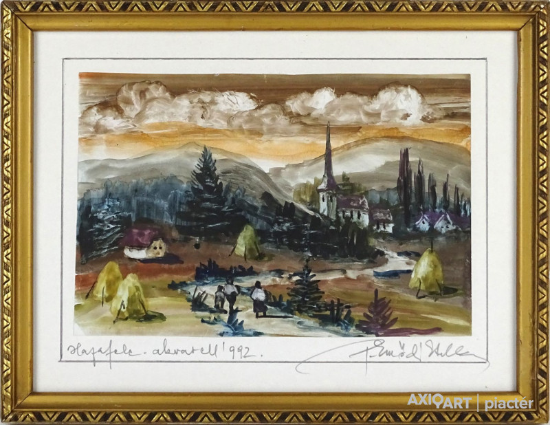 [1N008/091] 25% ÁRENGEDMÉNY MINDEN TERMÉKÜNKRE Dec. 17-ig Papír akvarell üveglap mögött, aranyozott keretben. Akasztási lehetőséggel rendelkezik. Jelzés jobbra lent: P. EMŐDI ETELKA (Péli Emődi Etelka) Balra lent kép címe, technika: HAZAFELE - AKVARELL 992. Magasság: 23.5 cm Szélesség: 30.3 cm Súly: 0.45 kg Péli Etelka Erzsébet festő, grafikus, keramikus Nagyvárad [Oradea, RO], 1945-07-19 Névváltozat: P. Emődi Etelka 1970: kolozsvári Ion Andeescu Képzőművészeti Főiskola, kerámia szak, mesterei: Márkos András, Balaskó Nándor. 1990-től a Magyar Képzőművészek és Iparművészek Szövetsége, 1997-től az Egyetemes Magyar Képzőművészeti Szövetség tagja. 1970-90 között a nagyváradi Arta Crisana kisipari szövetkezet tervezője volt. 1970-89 között rendszeresen részt vett a nagyváradi őszi és tavaszi tárlatokon. 1990-től Magyarországon él. Kisplasztikák, faliplakettek és használati tárgyak készítése mellett festményeiben, grafikáiban az erdélyi tájat, jellegzetes építészetet mutatja be. Egyéni kiállítások Egyéni kiállítások 1986 • Bábszínház, Nagyvárad 1996 • Volán Elektronikai Rt., Budapest 2000 • Sóskút, Andreetti K. Általános és Művészeti Iskola, Sóskút. Válogatott csoportos kiállítások Válogatott csoportos kiállítások 1999 • TYRESÖ, Stockholm • Iparművészeti Múzeum, Budapest • Királyi Kastély Lovarda, Gödöllő. Művek közgyűjteményekben Művek közgyűjteményekben M. Tárii Crisurilon, Nagyvárad.  Forrás: artportal.hu