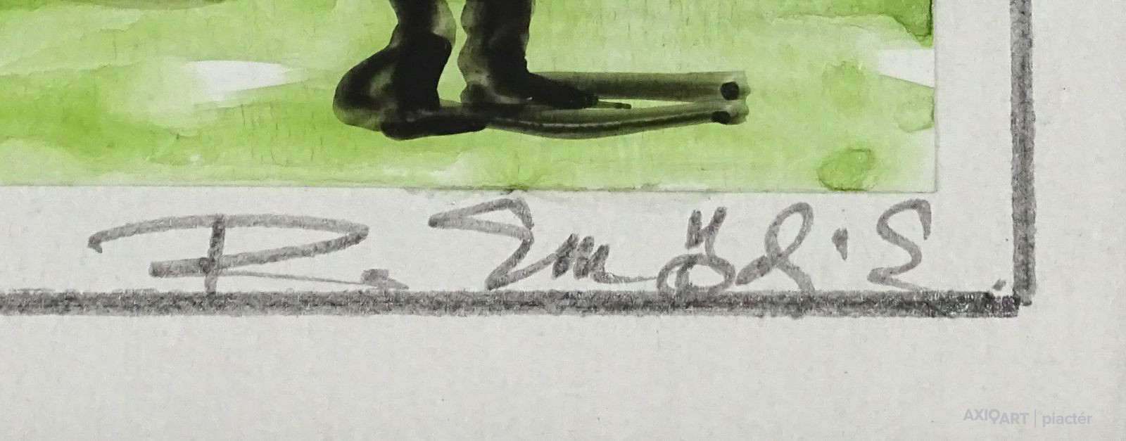 [FK1845/Z24/18] A kép mérete: 50 x 66 cm keret nélkül. Készült: pasztell, tempera, Papír A kép Kéri László (Budapest, 1949) alkotása. Jelezve Jobbra lent "Kéri László 76" A festmény jó állapotban van. Keret: Új A festmény hátoldalán a Képcsarnokvállalat raglapja látható. Magyar festők és grafikusok életrajzi lexikona I-II. Festő, grafikus. Tanulmányait a budapesti Képzőművészeti Főiskola festőszakán végezte 1976-ban. Sarkantyu Simon festőművész útmutatásai mellett képezte magát, de mesterének tartja Svády Lajost is. Évekig Szentesen dolgozott, majd Hódmezővásárhelyen telepedett le. 1977-ben tartotta első tárlatát. Ezt számos csoportos és egyéni bemutató követte. 1998-ban a Szegedi Táblaképfestészeti Biennálén szerepelt sikerrel. A Vásárhelyi Őszi Tárlatokon, valamint a békéscsabai Alföldi Tárlatokon nagyszámú díjat nyert el. Nem alföldi születésű, de tárgyi, valamint képi elemekkel kapcsolódik az alföldi hagyományokhoz. Rajzai, tusrajzai elementáris grafikusi tehetségről árulkodnak. Emberi viszonyokat, meghökkentő - alkalmasint - megdöbbentő emberi helyzeteket ábrázolnak rajzai. Festészetét illletően, pályakezdő korában erőteljesen érződött képein választott mesterének hatása, valamint a kései manierizimus és a korai barokk gomolygó, dinamikus rajzossága, erőteljes színvilága. A '80-as évek elején színei egyszerűbbek, tisztábbak lesznek. A '80-as, '90-es évtizedfordulón újból zaklatottan fest, diszharmonikus szín és tónuskontrasztokat használ. Az évtized vége felé újra higgadtabb megoldásokkat próbálkozik. Akvarellben és pasztellben is elismert művész, díszletterveket is készít. Számos köztéri munkája ismert (többnyire pannók). Alkotásai a Magyar Nemzeti Galéria és a hódmezővásárhelyi Tornyai J. Múzeum őrzi. (Pogány Gábor, MÉ, N.I.: Új Műv, 1992/5, Sz.P.: Új Műv. 1998/10) Magyar festők és grafikusok életrajzi lexikona I-II. Műgyűjtők és kereskedők kézikönyve Festő. Tanulmányait a bp.-i Képzőművészeti Főiskolán végezte, majd egy ideig Szentesen, később Hódmezővásárhelyen működött, ahol 1977-ben tartotta első tárlatát. Festészetének meghatározója az Alföld, de tárgyi és képi elemekkel kapcsolódik az alföldi hagyományokhoz. (MÉ) Magyar festők és grafikusok adattára Tanulmányait 1976-ban a Képzőművészeti Főiskolán végezte, a még ebben az évben Szentesre költözött. Jelenleg Hódmezővásárhelyen él, ahol 1977-ben tartotta első kiállítását. Festészetének meghatározója választott szűkebb hazája, az Alföld. Bár nem közvetlenül,inkább áttételesen, tárgyi és képi elemekkel kapcsolódik az alföldi hagyományokhoz. - Irod.: P. Sz. T.: Művész életrajzok. Bp. 1985. Művész életrajzok kortárs magyar képzőművészek 1976-ban végzett a Képzőművészeti Főiskolán, s még ez évben Szentesre költözött. Jelenleg Hódmezővásárhelyen él; első kiállítása e városban volt 1977-ben. - Festészetének meghatározója választott szűkebb pátriája, az Alföld; bár nem közvetlenül, inkább áttételesen, tárgyi és képi elemekkel kapcsolódik az alföldi festészeti hagyományokhoz. Kortárs magyar művészeti lexikon I-III. 1976: MKF, festő szak, mestere: Sarkanyú Simon, de Sváby Lajost is mesterének tartja. 1976-84-ig Szentesen él, azóta Hmvhelyen. A Vásárhelyi Őszi Tárlatokon és a bcsabai Alföldi Tárlatokon nagyszámú díjat nyert; 1980: PIM, József A.-pályázat HNF díja; 1978, 1984, 1986: Szegedi Nyári Tárlat díja; 1987: Tornyai Plakett; 1992: Akvarell B: Eger város Önkormányzat díja; 1998: Zene szemeimnek, MATÁV festészeti pályázat II. díja. Pályakezdő korában erőteljesen érződött képein választott mesterének hatása, valamint a kései manierizmus, és a korai barokk gomolygó, dinamikus rajzossága, erőteljes színvilága. A 80-as évek elején a színek egyszerűbbek, tisztábbak lesznek és előszeretettel alkalmaz a képen belső fényforrást. A 80-as, 90-es évtizedfordulón újból zaklatottaan fest, diszharmonikus szín és tónuskontrasztokat használ, szimbolikája áttételesebbé válik, majd kisméretű vásznakból sorozatokat készít, egy keretben álllítva ki azokat. Az évtized vége felé újra higgadtabb megoldásokat választ. Kéri László festészete mindvégig emberközpontú, figurális, az erőteljes emberi érzelmek közvetítője. Akvarellben és pasztellben is elismert művész, díszletterveket is készít. Ek: 1977: Medgyessy T., Hmvhely; 1979: Kisg. Szentes; 1981: Horváth E. G., Bgyarmat; 1983: Móra F. M. Képtára, Szeged; 1985: Vaszary T., Kaposvár; Gyöngyösi G., Gyöngyös; 1988: M. Historii, Lódz (PL); Magyar Int. Varsó; 1989: Art Service G., Párizs (kat.); 1990: Chateau d' Eguilly, Pouilly en Auxois (FR); 1991: Coll. Hung., Bécs; Műv. Közp., Nagykanizsa; 1993: Art Service G., Párizs; 1995: Wesselényi 70 G.; Tornyai J. M., Hmvhely; Bartók G., Szeged; 1996: G. de Meerse, Haarelmmermeer (NL); Hódtói Ált. Isk., Hmvhely; 1997: Tiszai G., Csongrád Vcsk: 1977-től Vásárhelyi Őszi Tárlatok, Szegedi Nyári Tárlatok, Alföldi Tárlatok, Bcsaba; 1981: Az út elején? Közben? Nyolc fiatal művész, Bartók 32 G.; 1982: I. Orsz. Rajzb., Salgótarján, Festőművészek a XI. kerületben, Bartók 32 G.; 1984: Vásárhelyi művészek, Zentai M. (Senta, YU), Vallomások az emberről, Juhász Gy. Műv. Közp., Szeged; 1987: Nközi Művésztelep, Iserlohn (NSZK); 1988: Görög Templom, Vác; Wilhelmshafen (D); 1994: Európa elrablása, Vigadó G.; 1997: Szimbiózis, Pest Center G.; 1998: Mednyánszky Társaság, S. Andrea G., Párma (OL); Belső rajz, Nádor G.; Kollázs, Vigadó G.; Zene szemeinknek, MATÁV pályázat, Pécs, Győr, Miskolc, Debrecen, Bp.; 1999: Ne vakolj a freskóra, Móra F. M. Képtára, Szeged; Mednyánszky Társaság, Koller G.; S