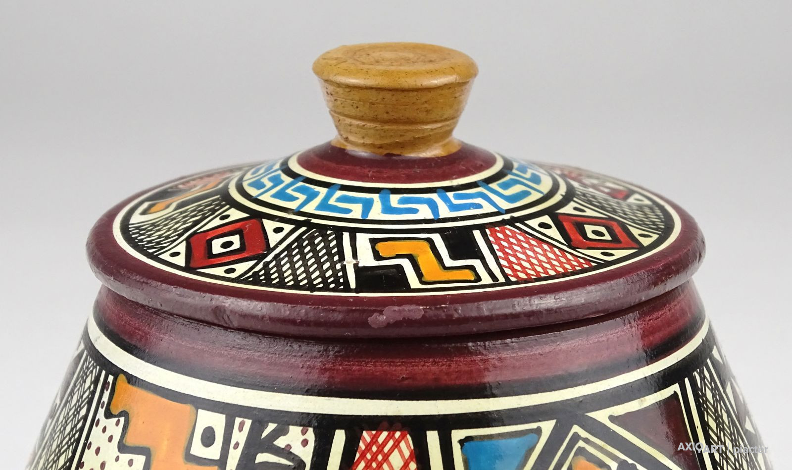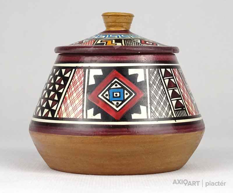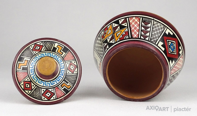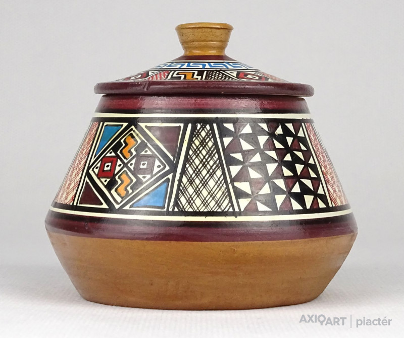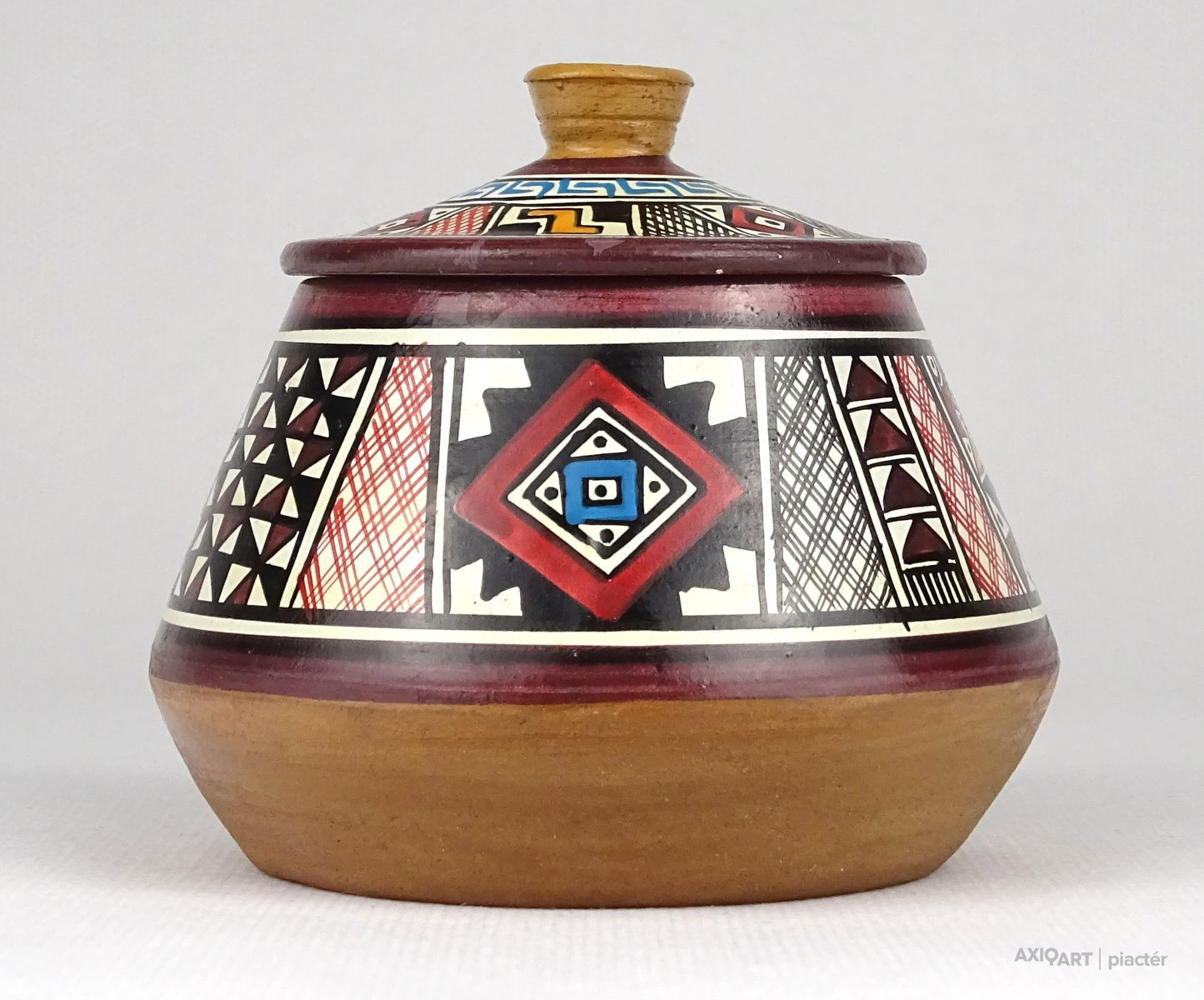 [1N159/X156] Szép állapotú, kis méretű, kézzel festett perui fedeles kerámia bonbonier. Oldalán láma díszítés. Magasság: 8 cm Szélesség: 9 cm Súly: 0.135 kg