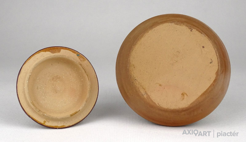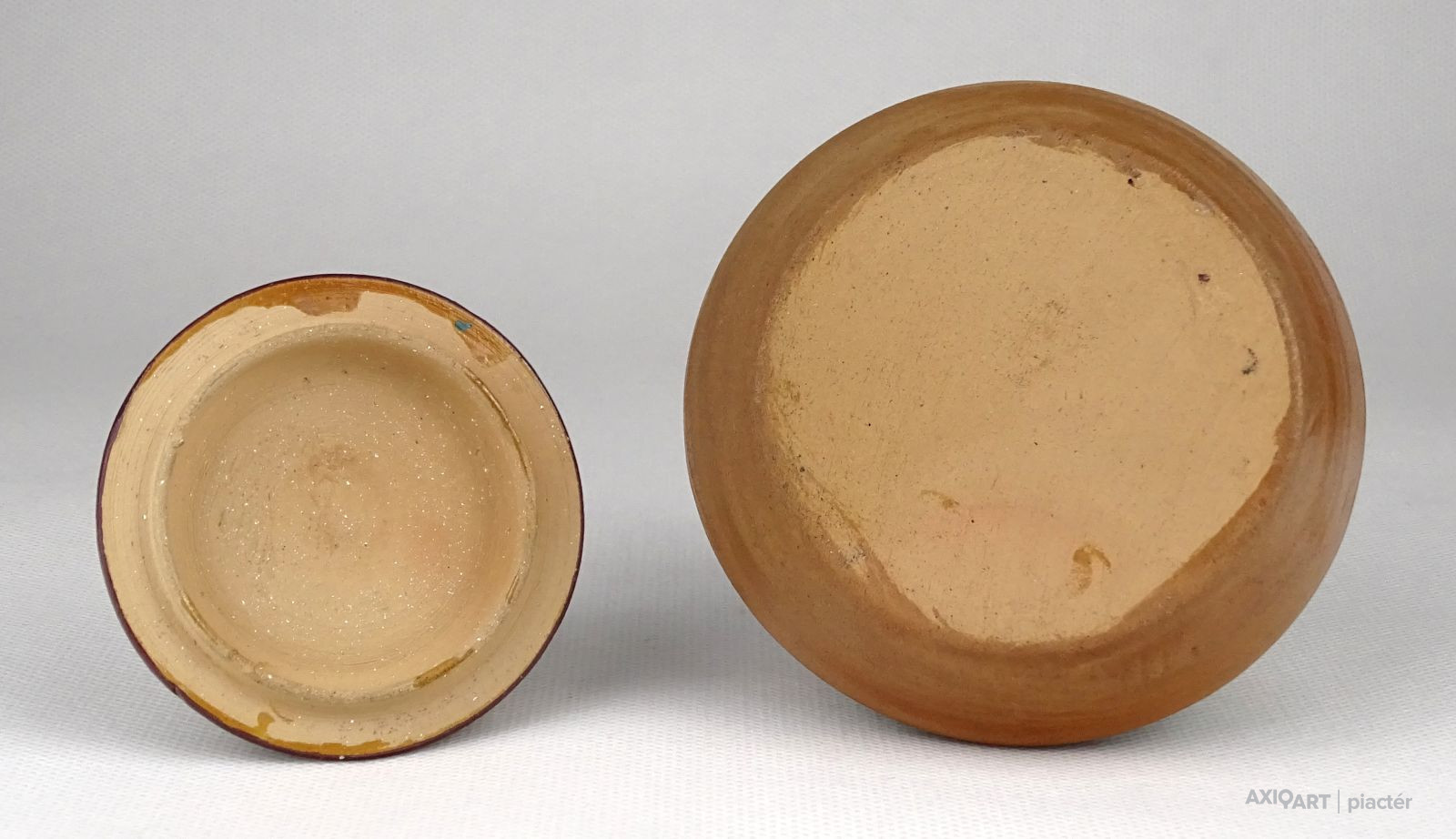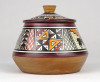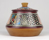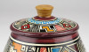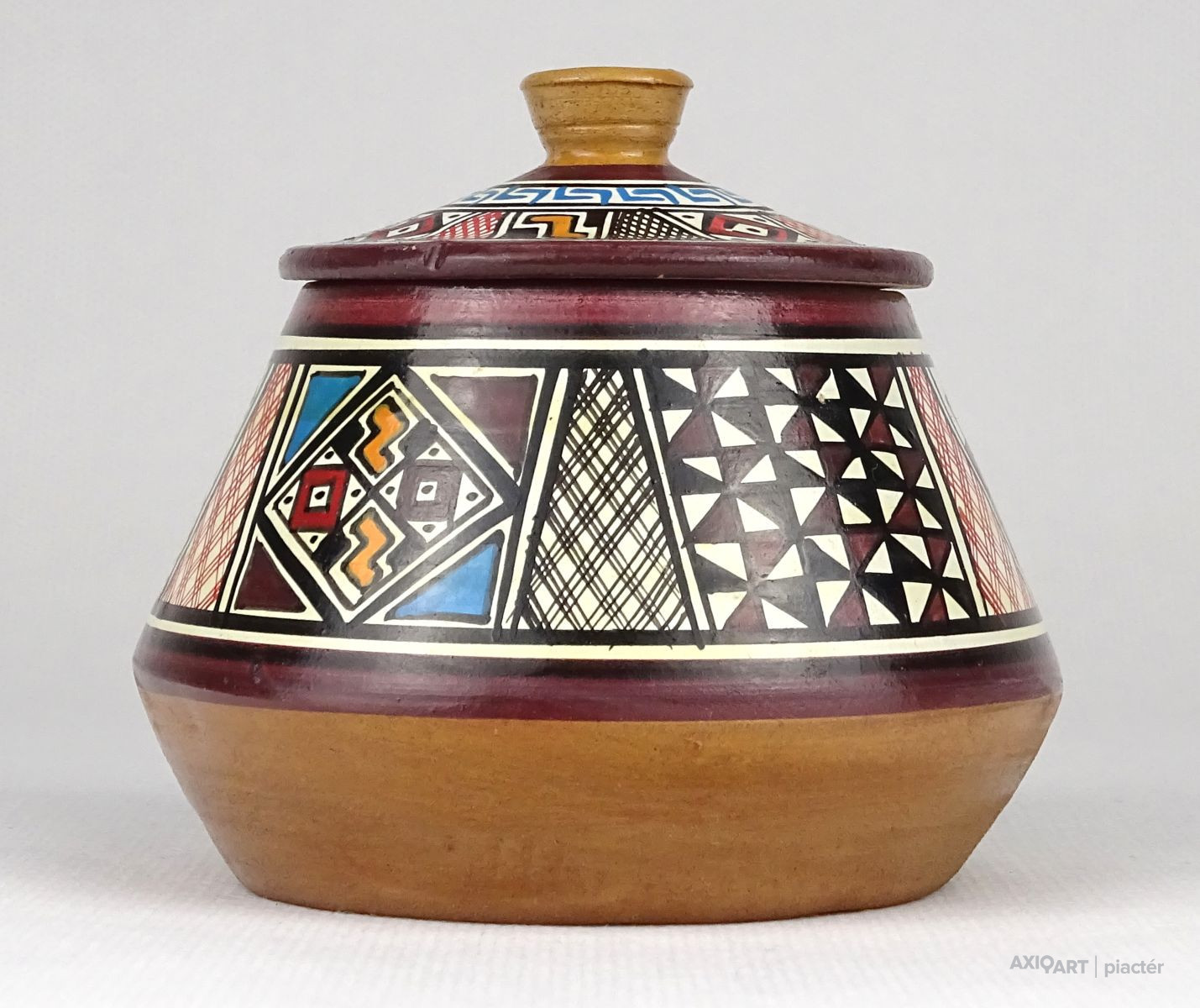 [1N159/X156] Szép állapotú, kis méretű, kézzel festett perui fedeles kerámia bonbonier. Oldalán láma díszítés. Magasság: 8 cm Szélesség: 9 cm Súly: 0.135 kg