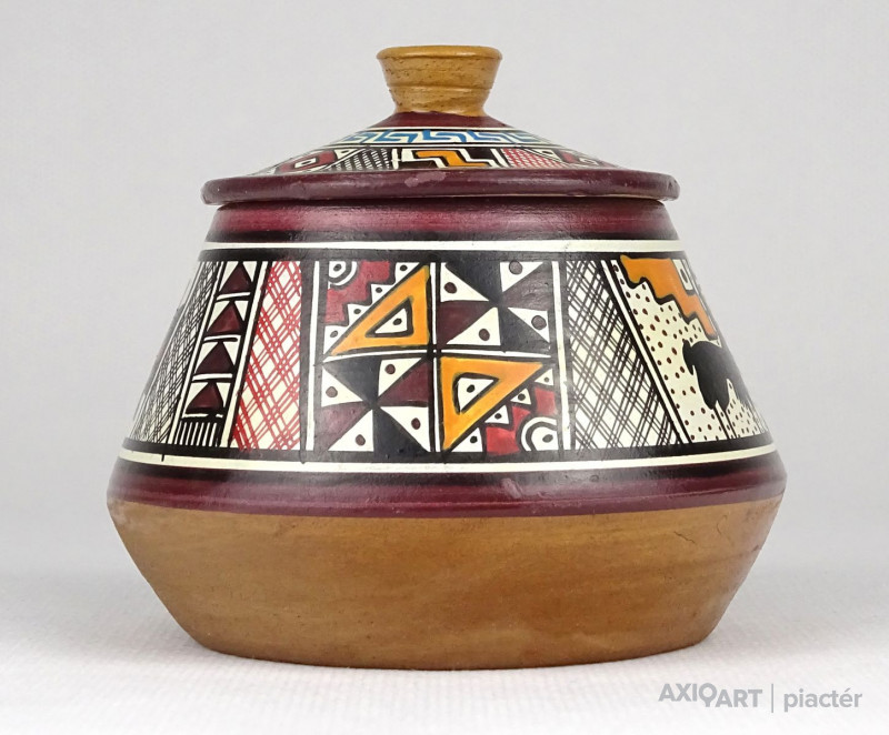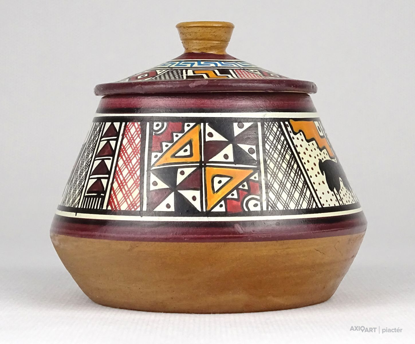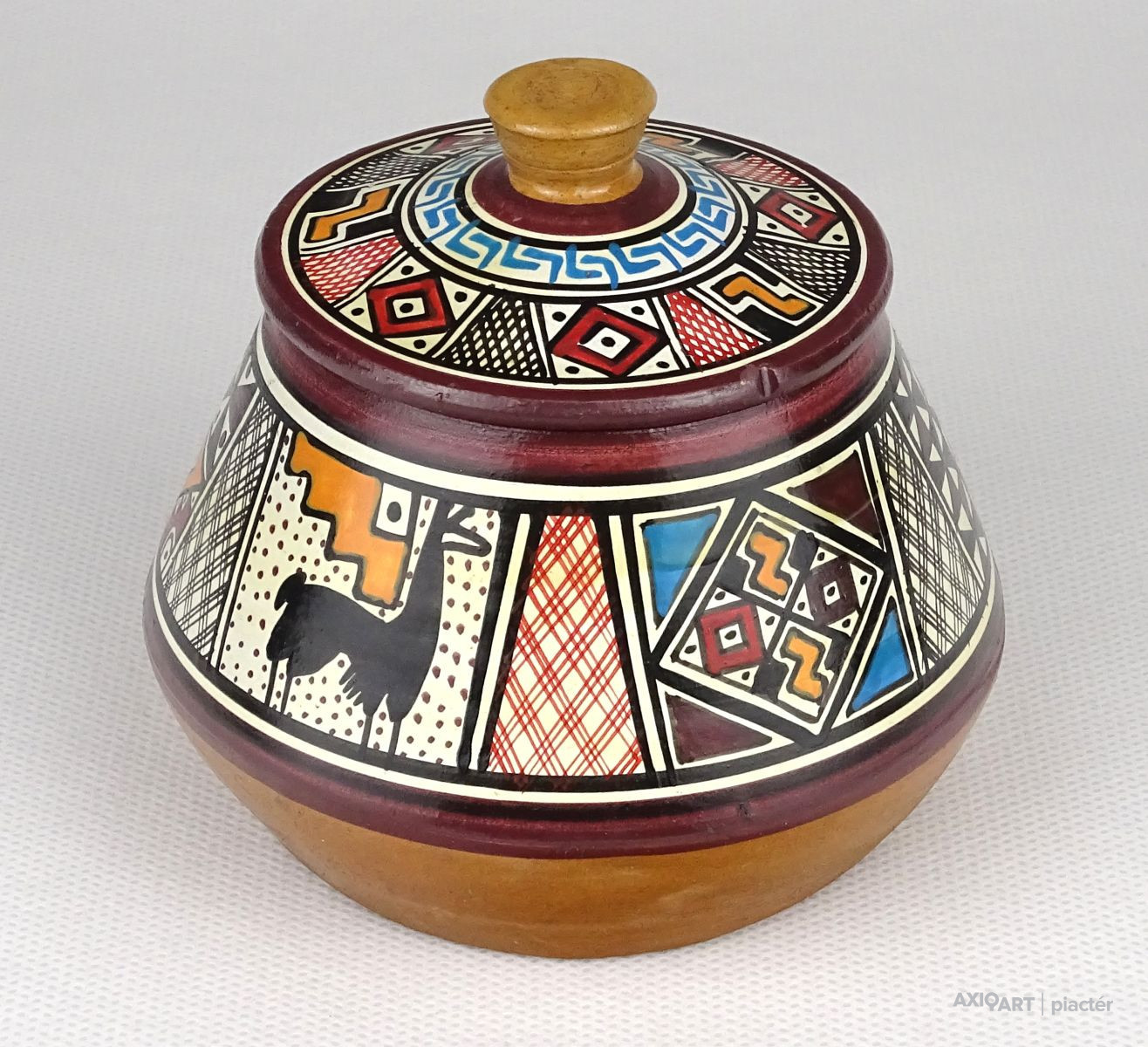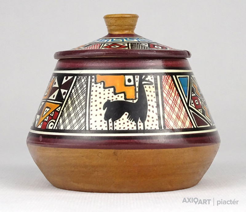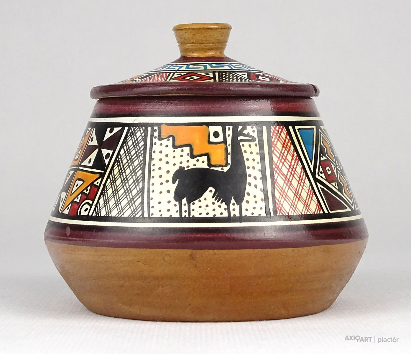 Szép állapotú, kis méretű, kézzel festett perui fedeles kerámia bonbonier. Oldalán láma díszítés.