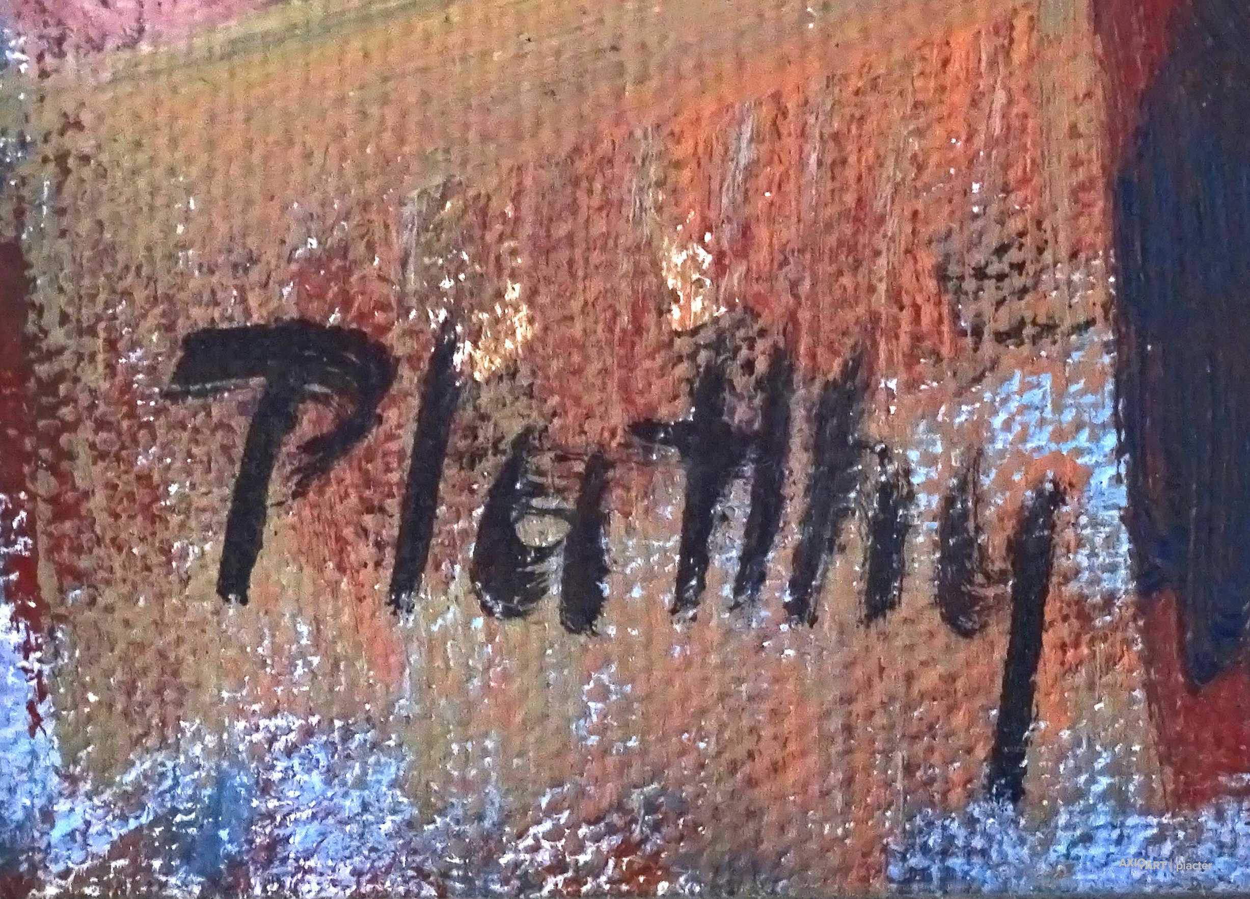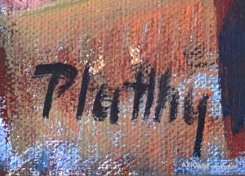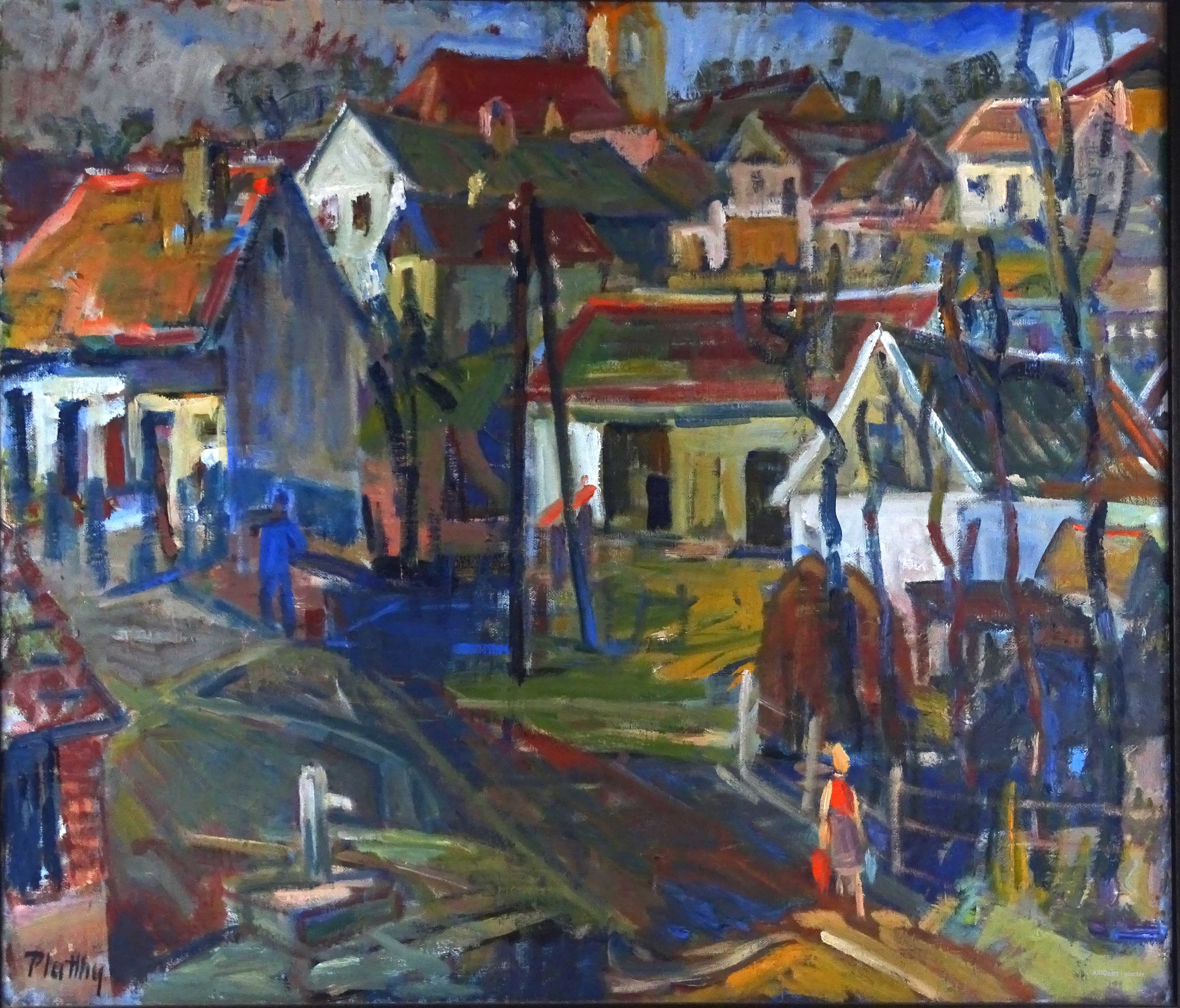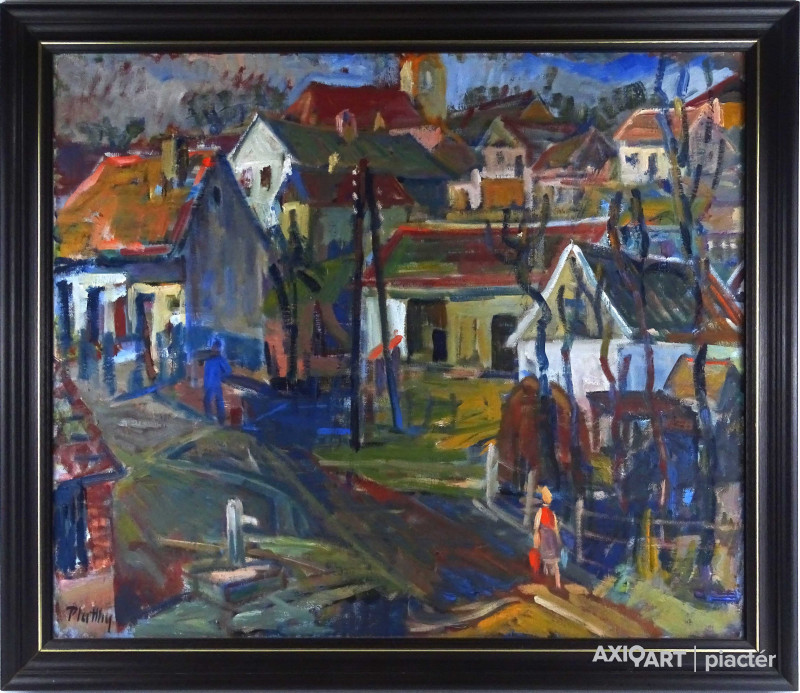 [1Z189/131] Olaj vászon festmény, hibátlan állapotú, barna színű modern keretben. Jelzés balra lent: PLATTHY Hátoldalán a feszítőkereten képcsarnokos címke töredék. Magasság: 70 cm Szélesség: 80.5 cm Súly: 2.78 kg Platthy György Ungvár, 1908 - Pécs, 2003 Festő. Tanulmányait a budapesti Képzőművészeti Főiskolán végezte 1933-ban. Mesterei: Réti István és Glatz Oszkár. Tanulmányúton Ausztriában járt 1933-ban. Majd Glatz Oszkár soproni művésztelepét vezette. 1934-35 között minisztériumi tisztviselő volt. 1941-49 között különböző iskolákban rajztanárként dolgozott. 1953-59 között szakfelügyelő volt Egerben és Pécsett. Majd a pécsi tanárképző főiskola tanszékvezetőjeként ment nyugdíjba 1972-ben. Tanulmányúton Egyiptomban és több európai országban járt. 1932 óta kiállító művész. Műveit őrzi a Magyar Nemzeti Galéria, a pécsi Janus Pannonius Múzeum és a komlói Bányászati Múzeum.   Forrás: kieselbach.hu