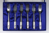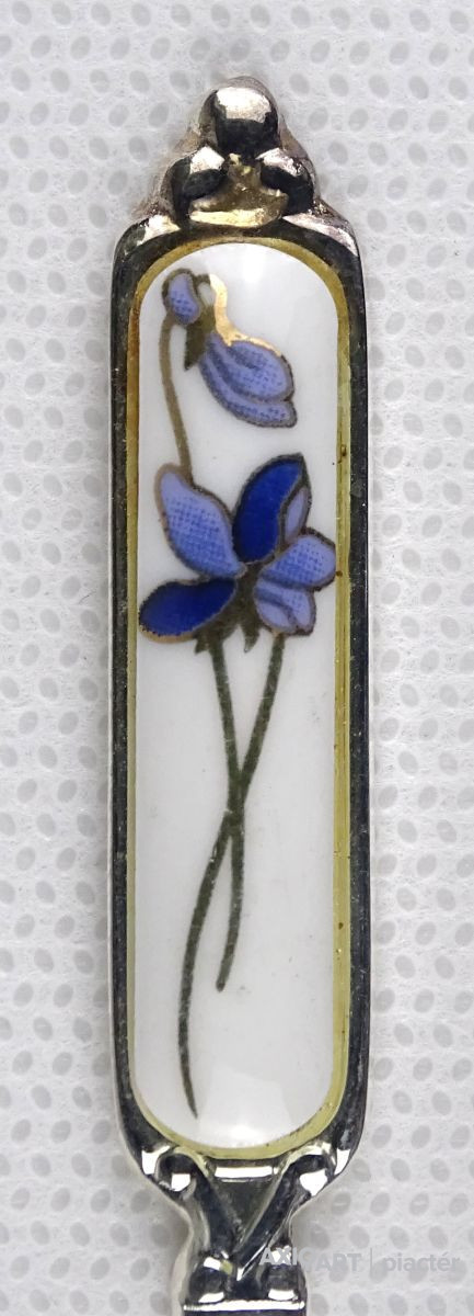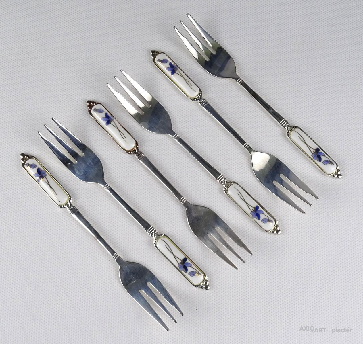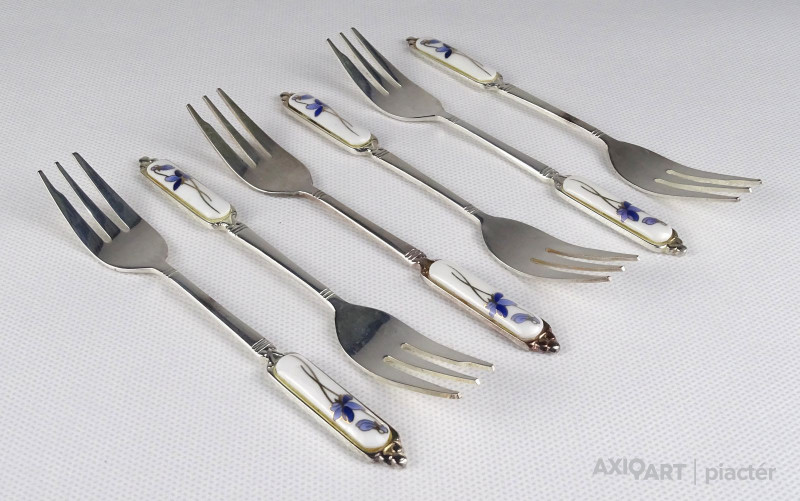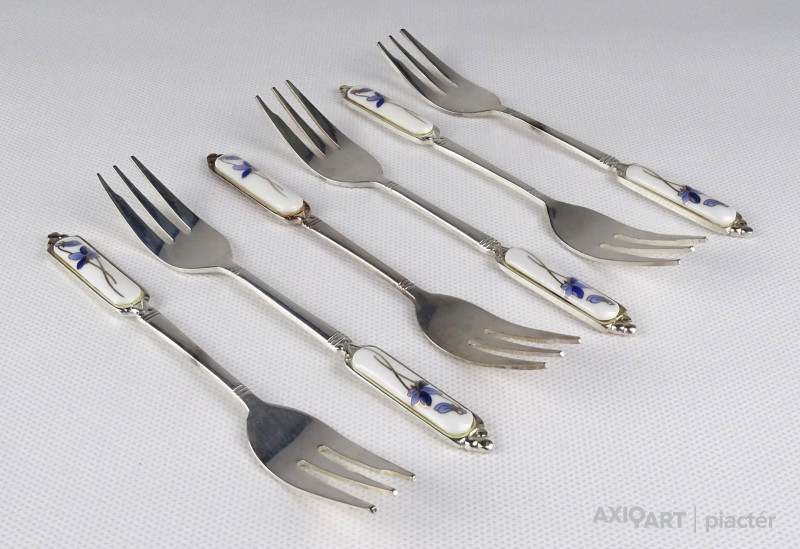 Régi, hibátlan állapotú, evőeszköz készlet eredeti díszdobozában. Hat darabos villa készlet, süteményes villa készlet. A villákon kézzel festett, aranyozott virágdíszes porcelánbetét található.