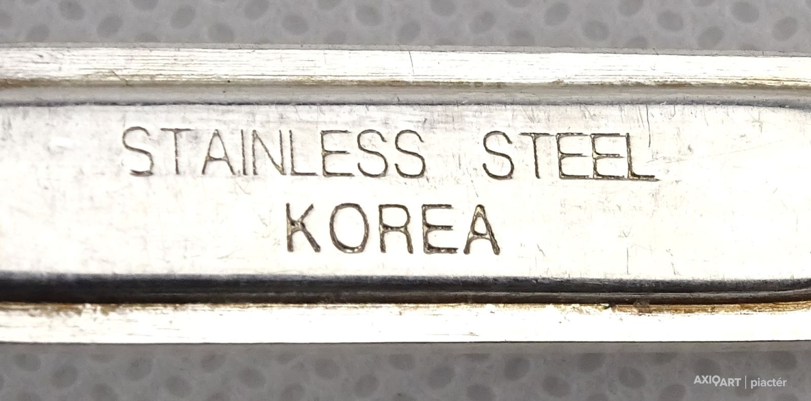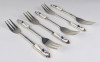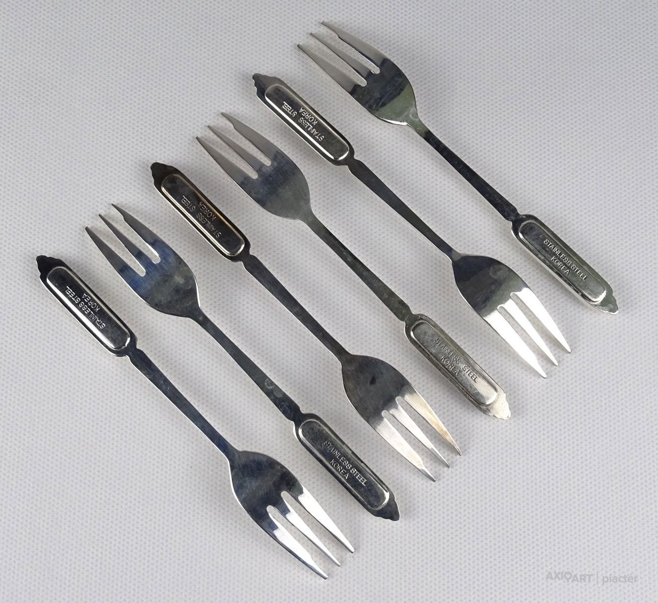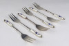 [1R016/Y003] Régi, hibátlan állapotú, evőeszköz készlet eredeti díszdobozában. Hat darabos villa készlet, süteményes villa készlet. A villákon kézzel festett, aranyozott virágdíszes porcelánbetét található. Rajtuk jelzés: STAINLESS STEEL KOREA Súly: 0.25 kg