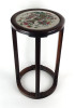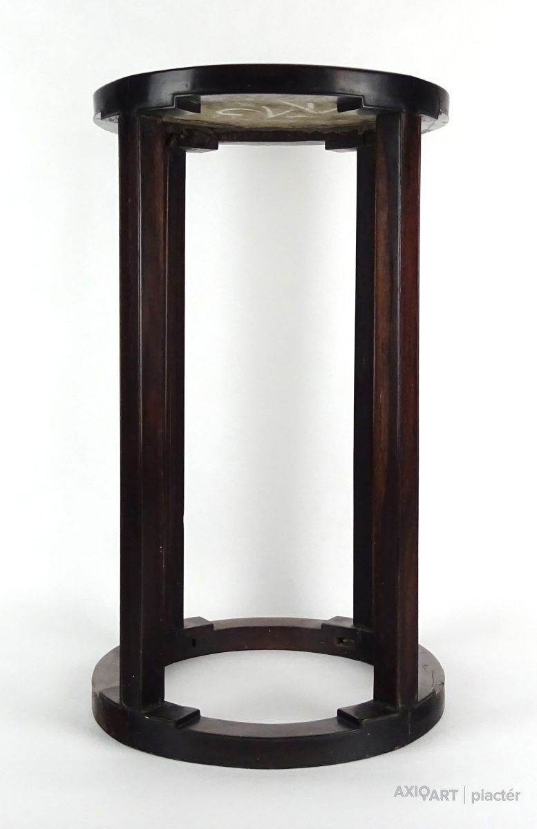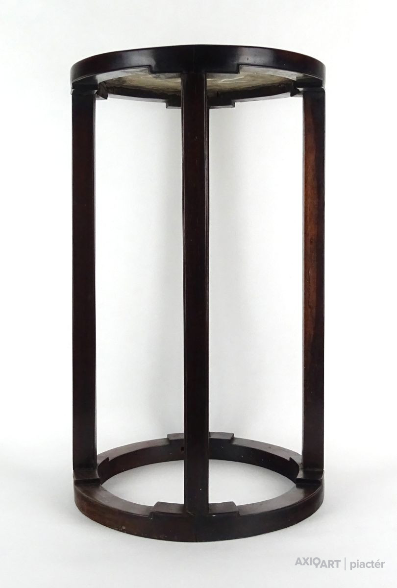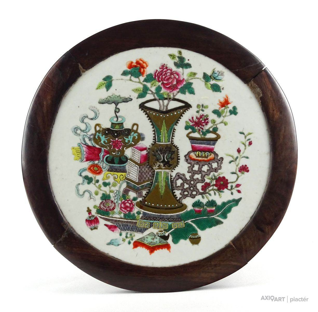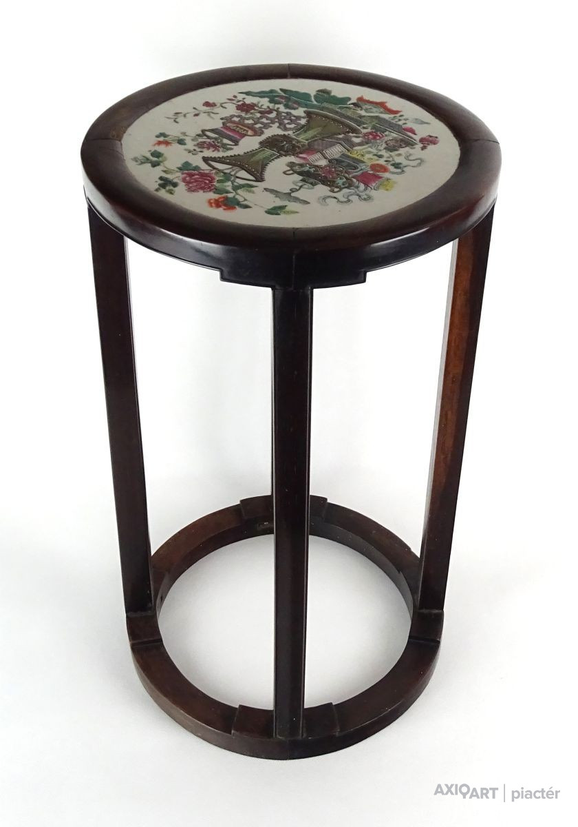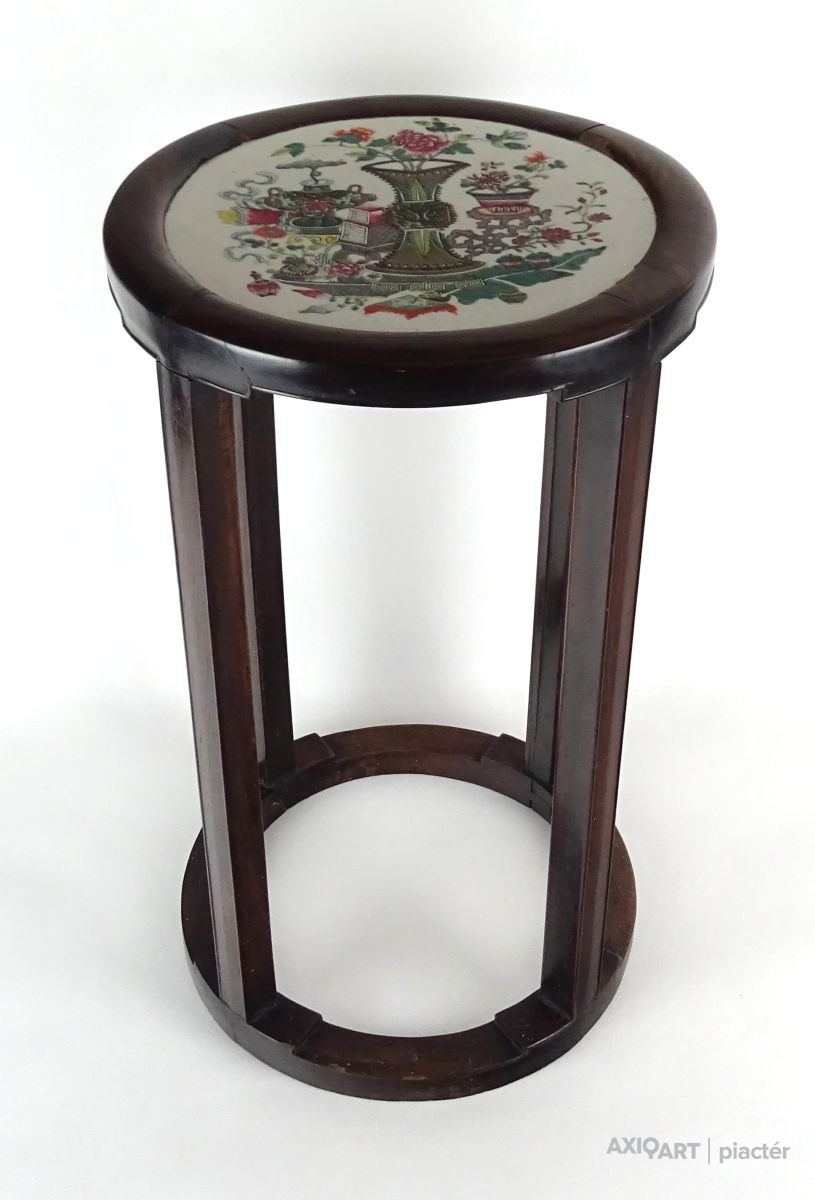 Alacsony porcelánbetétes virágtartó állvány, posztamens. A porcelán felülete kézzel festett keleti motívumokkal díszített.