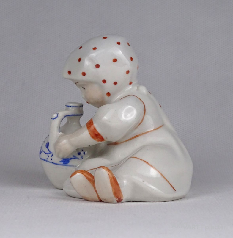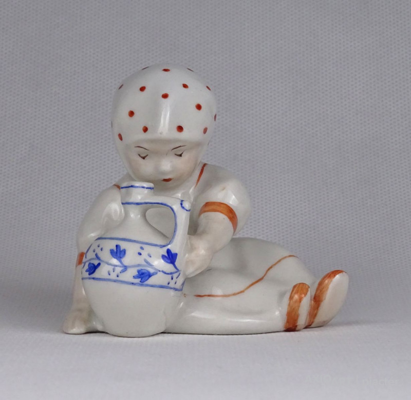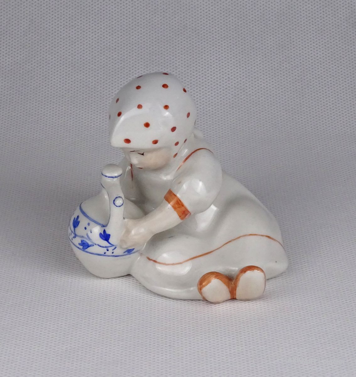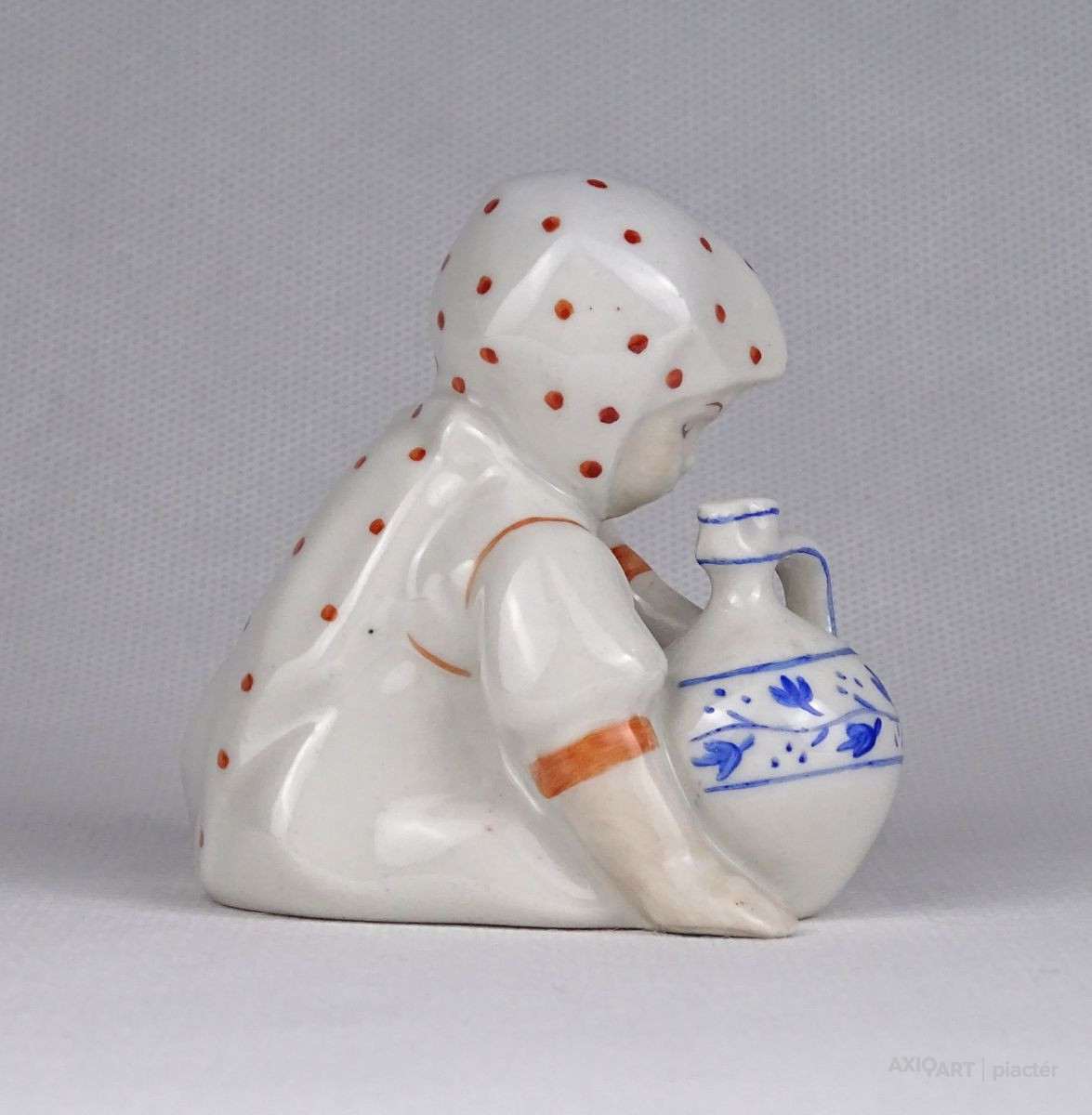 Hibátlan állapotú Zsolnay kislány figura, kezében csöcsös korsó, fején piros pöttyös kendő.