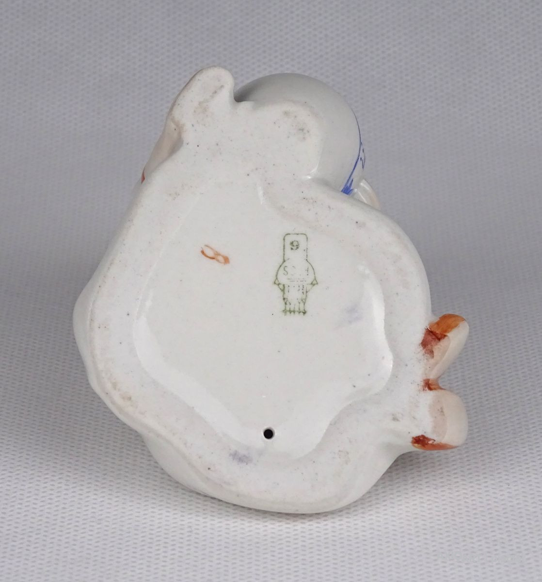 [1T335/X075] Hibátlan állapotú Zsolnay kislány figura, kezében csöcsös korsó, fején piros pöttyös kendő. Alján zöld Zsolnay öttornyú márkajelzés: PÉCS Magasság: 7.3 cm Szélesség: 8 cm Súly: 0.11 kg