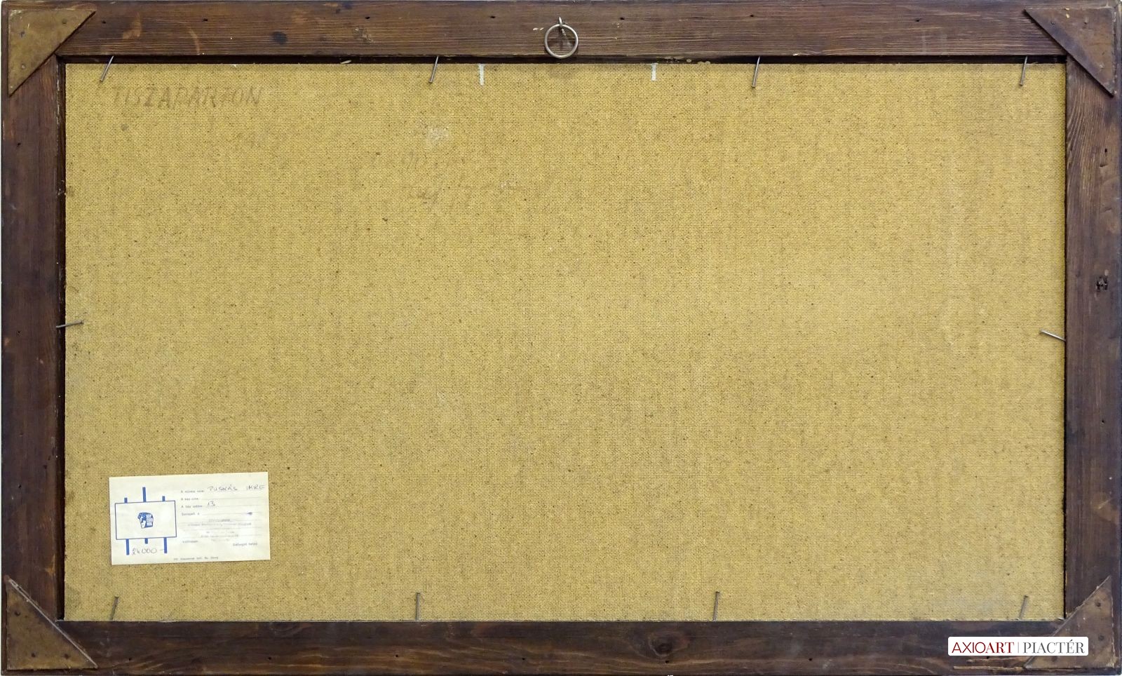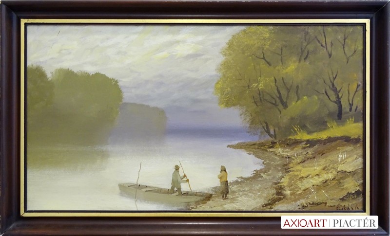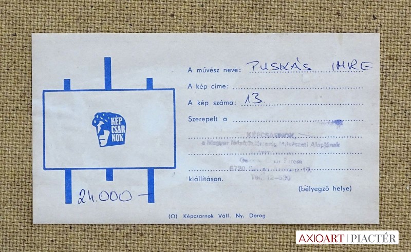 [0G541/Z081] Jelezve jobbra lent PUSKÁS I. Olaj farost festmény szép keretben. Hátoldalán képcsarnokos papírvignetta, rajta felirat: PUSKÁS IMRE A KÉP SZÁMA 13 A vignettán a Képcsarnok tintabélyegzője. Eredeti ára: 24000 ft. Magasság: 50 cm Szélesség: 90 cm Puskás Imre festő, textiltervező Születési hely: Szeged Születési dátum: 1933 Honlap: Kiállítások az adatbázisban: Mesterei: Z. Gács György, Rákosi Zoltán, Molnár Béla, Dudás Jenő. 1952-58: Magyar Iparművészeti Főiskola (textiltervező szak), mesterei: Z. Gács György, Rákosi Zoltán, Molnár Béla, Dudás Jenő. Pályája első mintegy másfél évtizedében textiltervezéssel foglalkozott. Csőtűs technikával készített, ősi óceániai és kelet-európai motívumokat felhasználó faliszőnyegeket, faliképeket, valamint kötött-anyag és női ruhanemű-terveket alkotott. Igazi kifejezőeszköze azonban a festészet, amellyel a 70-es évek vége óta foglalkozik. Rendszeresen szerepelnek képei a Japánban rendezett csoportos kiállításokon. Képeinek fő témáit a Szeged környéki tanyák házacskáinak ábrázolásai, valamint a Tisza-parti táj sajátos hangulatát megragadó művei adják. Szívesen fest portékat jellegzetes paraszti karakterekről. Egyéni kiállítások 1981 • Művelődési Központ, Bonyhád 1983 • Művelődési Ház, Tiszalúc Válogatott csoportos kiállítások 1959 • 4. Országos Iparművészeti Kiállítás, Műcsarnok, Budapest 1961 • Az Iparművészeti Vállalat Komplex Stúdiójának I. Textil Kiállítása, Csók István Galéria 1967 • A Kör iparművész csoport kiállítása, Szőnyi István Terem, Miskolc 1968 • Textil falikép, Ernst Múzeum, Budapest • A Kör iparművész csoport kiállítása, Ferencvárosi Pincetárlat, Budapest 1970 • I. Fal- és Tértextil Biennálé, Savaria Múzeum, Szombathely 1972 • Textil- és Ötvösbemutató, Csontváry Terem, Budapest 1998 • Tokió. Irodalom Gyulai Gergely Forrás: Artportal.hu