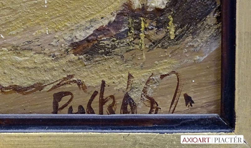 [FK0037/Z018] A kép mérete: 50 x 70 cm keret nélkül. Készült: Olaj, Vászon A kép Paizs László (Szentpéterúr, 1935) alkotása. Jelezve Jobbra lent "P. L." A festmény jó állapotban van. Keret: Ép A festmény hátoldalán a Képcsarnokvállalat címkéje található. Magyar festők és grafikusok életrajzi lexikona I-II. Festő. Tanulmányait a budapesti Iparművészeti Főiskolán végezte 1959-ben. Z. Gács György, Rákosy Zoltán és Szentiványi Lajos növendéke volt. A '60-as évek első felében hagyományosabb felfogású olajképeket festett, mozaikokat, freskókat, utóbb a pop-art körébe tartozó, a francia Arman munkáival rokon műveket alkotott. 1961 óta kiállító művész. Egyéni (Fényes Adolf Terem, Csók Galéria, Műcsarnok, Magyar Nemzeti Galéria, Halászbástya, Bástya Galéria, Vigadó Galéria, Budapest Galéria, Győr, Szombathely, Szeged, Zalaegerszeg, Duisburg, Aix-en-Provence, stb). és vegyes (Ernst Múzeum, Műcsarnok, Óbuda Galéria, Magyar Nemzeti Galéria, Csók Galéria, Vigadó Galéria, Székesfehérvár, Kaposvár, Pécs, Hódmezővásárhely, Firenze, Milano, Padova, Nápoly, Velence, Düsseldorf, Aachen, Genf, stb) tárlatokon vett részt. 1980-ban Munkácsy-díjjal jutalmazták, 1988-ban Érdemes Művész kitüntető elismerésben részesült. Munkáit őrzi a Magyar Nemzeti Galéria, a Fővárosi Képtár, a szombathelyi képtár, a pécsi Janus P. Múzeum, a székesfehérvári István Király Múzeum és a dunaszerdahelyi Kortárs Magyar Galéria. (H.B.: Műv, 1972/4, K.Gy.: Műv. 1977/2, K.G.: Műv. 1978/10, M.L.: Műv, 1983/5, R.G.: Műv, 1987/9, Sz.Gy.: Új Műv. 1995/4, MK) Magyar festők és grafikusok életrajzi lexikona I-II. Műgyűjtők és kereskedők kézikönyve Festő. Tanulmányait a bp.-i Iparművészeti Főiskolán végezte. Mozaikokat ferskókat, utóbb a pop-art körébe tartozó, a francia Arman műveivel rokon műveket alkotott. Mozaikok: a Szegedi Megyei Tanács, a Pécsi Óvoda, a Gödöllői Agrártudományi Egyetem. Freskók: Budapest - Csatárka úti Gyermekotthon. 1971-ben a Fényes Adolf Teremben volt kiállítása, 1983-ban pedig a szegedi Móra Ferenc Múzeumban nagyszabású tárlatokon mutatta be munkáit. 1988-ban érdemes művész kitüntető elismerésben részesült. (MK) Magyar festők és grafikusok adattára Az Iparművészeti Főiskolán végzett 1959-ben. Mozaikokat (Szeged, Megyei Tanács; Pécs, Óvoda; Gödöllő, Agrártudományi Egyetem), freskókat (Budapest, Csatárka úti Gyermekotthon), újabban a pop art körébe tartozó, a francia Arman műveivel rokon műveket alkotott. 1971-ben a Fényes Adolf Teremben nyílt kiállítása. 1983 februárjában a szegedi Móra Ferenc Múzeumban megrendezett nagyszabású tárlaton mutatta be alkotásait. 1988-ban érdemes művész kitüntető elismerésben részesült. - MK Művészeti lexikon I-IV. (Szentpéterur, 1935. dec. 26.- ): festő. Az Iparművészeti Főiskolán 1959-ben végzett Rákosy Zoltán, Z. Gách György és Szentiványi Lajos növendékeként. Épületdiszítő mozaikokat, (Szeged, Megyei Tanács, 1961; Pécs, Óvoda, 1964), műanyagfreskókat (Bp., Csatárka úti Gyermekotthon, 1964) és gobelinterveket készít. Kortárs magyar művészeti lexikon I-III. Festő, szobrász, grafikus. 1959: MIF, mesterei: Z. Gács György, Rákosy Zoltán, Szentiványi Lajos. 1980: Munkácsy-díj; 1988: érdemes művész. Főiskolás éveinek második felében, majd azt követően számos murális munka kivitelezésében vett részt, Fónyi Géza, Konecsni György, Z. Gács György, Rákosi Zoltán és Domanovszky Endre mellett dolgozva. A 60-as évek első felének hagyományosabb fölfogású olajképeket festett. 1964-ben a Velencei B.-n megismerkedett az amerikai pavilonban a pop art Európában akkor még újnak számító törekvésével, és részben ez inspirálta, hogy 1967-ben textil, fém, bőr anyagú "varrottas" képeket küldjön az FKS éves tárlatára; a megnyitó előtt többek között az ő munkáit is eltávolították a falról. A 70-es években pop art-os objekteket (A trónörököspár politikai gyilkosság áldozata lett, 1970, plexiüveg, újság, szarvasbogarak), majd konstruktív, átlátszó plexiüveg plasztikákat készített belső fénytörő határfelületekkel. A 80-as években készültek az anyagában színezett, konstruktív, nagyméretű poliészter szobrai, majd színes poliészter táblaképeket alkotott, mesterségesen roncsolt felületekkel, mintha régészeti leletek vagy atomtámadás utáni festmény-szurrogátumok lennének. Ekkor kezdett organikus plaszikájú bronzszobrokat is mintázni. A 90-es években, a táblaképek és szobrok mellett nagyméretű, egyedi grafikákat készített, formavilágában némileg a roncsolt táblaképekből kiindulva, de szinte kizárólag az emberi alakból elvonatkoztatott torzókat megjelenítve. Ek: 1966: Művészklub, Győr; 1971: Fényes A. T.; 1972: Bercsényi 28-30 G.; 1973: BME B-épület; 1976: Csók G.; 1977: G. Hildebrandt, Duisburg (NSZK); 1979: Bástya G., Halászbástya; Helyőrségi Műv. H., Nagyatád; József A. Műv. Közp., Szeged; Göcsej M., Zalaegerszeg; 1982: Bezzegh G., Küsnacht (CH); 1983: Móra F. M., Szeged; 1987: Műcsarnok (kat.); MNG; 1988: Pandora G., Badacsonytomaj; 1989: Parktheatter, Iserlohn (NSZK); Qualitas G.; Hevesi S. Színház, Zalaegerszeg; 1990: Vasarely Fondation (Ferdinánd Judittal, Fóth Ernővel), Aix-en-Provence (FR); 1994: Vigadó G.; 1997: Pest Center G.; 1998: Budapest G. (kat.); 1999: Pest Center G. (kat); G. Arcis, Sárvár; MMA, Bp.; 2001: SZK, Szhely; Ernst M. (kat.) Vcsk: 1961, 1964, 1966: FKS, Ernst M.; 1962: 9. Magyar Képzőműv. kiállítás, Műcsarnok; 1967: Mai magyar festészet, Új-Delhi; 1969: Vas megyei művészek, Savaria M., Szhely; V. Orsz. Grafikai B., Miskolc; 1971: Új művek, Műcsarnok; 1972: Fiatal művészek Budapestről. Likovni Salon, Újvidék (YU); 1972, 1973: Balatonboglár