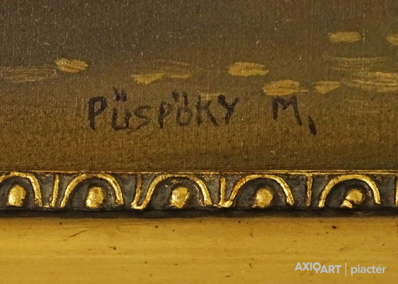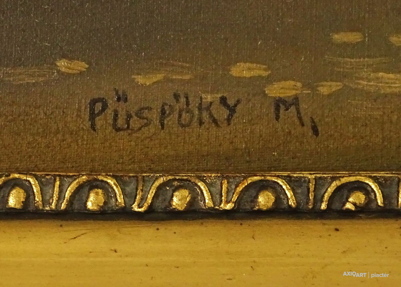 [1I545/045] Olaj vászon festmény, régi aranyozott keretben. Akasztási lehetőséggel rendelkezik. Jelezve balra lent: PÜSPÖKY M. Magasság: 55.5 cm Szélesség: 80.5 cm Súly: 2.455 kg