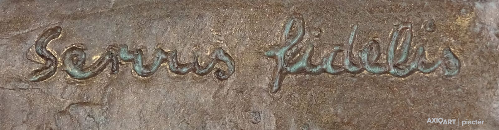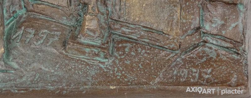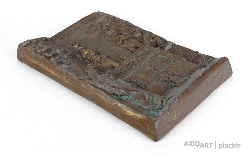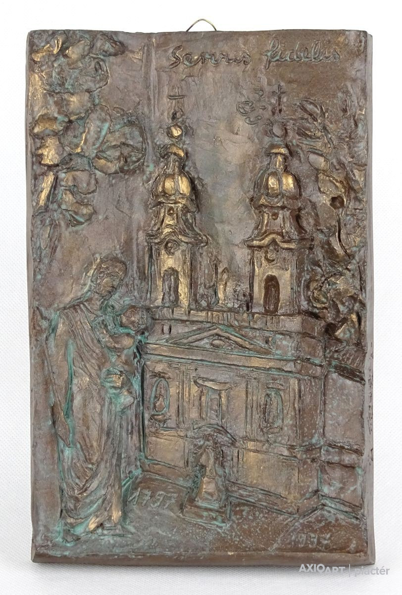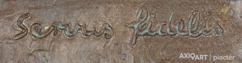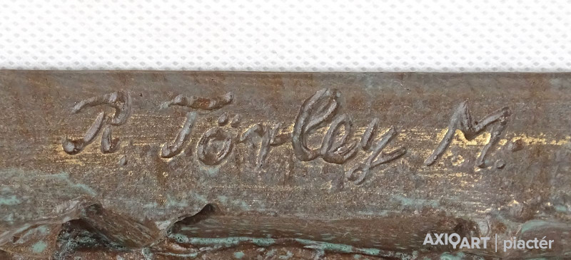 [1A741/X314] Hibátlan állapotú, jelzett, bronzírozott samott fali dombormű. Falra akasztási lehetőséggel rendelkezik. Oldalán jelzés: R. TÖRLEY M. Felirat: SEVUS FIDELIS 1797-1997 Magasság: 25.3 cm Szélesség: 16.5 cm Súly: 1.05 kg Törley Mária, R. Szobrász Budapest, 1950-05-12 hirdetés Szerző: Szolláth György-Wehner Tibor 1974-től 77-ig Andrássy-Kurta János magántanítványa volt, majd 1977-81 között Somogyi József növendékeként elvégezte a Magyar Képzőművészeti Főiskolát. 1981: Herman Lipót-díj; 1985, 1996: Nemzetközi Dante Biennálé díja, Ravenna; 1994: Molnár G. Pál centenáriumi díj; 1996: Budapest, XVI. ker., Millecentenáriumi díj; 1998: Budapest XVI. ker., Pro Budapest díj. 1982 óta rendez önálló kiállításokat; művészete a tér és az ember viszonylatát kutatja, de kimeríthetetlen témája az emberi arc, alak is. Sorozatokban, variációkban gondolkodik, ezek a plasztikai nyelv új fordulatait teremtik meg. Jól példázza mindezt Dante-sorozata és a Papageno-Papagéna kompozíciók. Természetelvű munkáinak jelentős része vallásos tárgyú (Madonna a kis Jézussal,1985; Patrona Hungariae, 1991; Istenes Szent János, 1995 és 1997; Boldog Apor Vilmos, 1998). Expresszív erejű portréiba néha ironikus felhang vegyül (Gyurkovics Tibor, Rácz Aladár, 1995). Szobrait hagyománytisztelet, belső rend jellemzi. Irodalom KOÓS J.: ~ kiállítása (kat. bev., Adalbertinum, Budapest, 1990)  ~ művészete képekben, Budapest, 1997 CSÉFALVAY P.: (kat. bev., Budapest, 1999). Egyéni kiállítások Egyéni kiállítások 1983 • Arany János Művelődési Ház, Nagykőrös 1987 • Sportkórház Kultúrterme, Budapest 1990 • Adalbertinum, Budapest 1991 • Mozart-kiállítás, Bécs 1995 • Pannonia Galéria, Sopron [Mihály Gáborral, Várady Sándorral] 1998 • Corvin Galéria, Budapest 1998 • Art-x Galéria, Budapest • Mestereit köszönti a tanítvány, Pannonia Galéria, Sopron 1999 • Keresztény Múzeum, Esztergom. Válogatott csoportos kiállítások Válogatott csoportos kiállítások 1985, 1988, 1990 • Dante Biennálé, Ravenna 1997 • Mester és tanítványai, Hadtörténeti Múzeum, Budapest 1998 • egyházművészeti kiállítás, Római Magyar Intézet 2001 • Szobrászaton innen és túl, Műcsarnok, Budapest. Forrás: artportal.hu