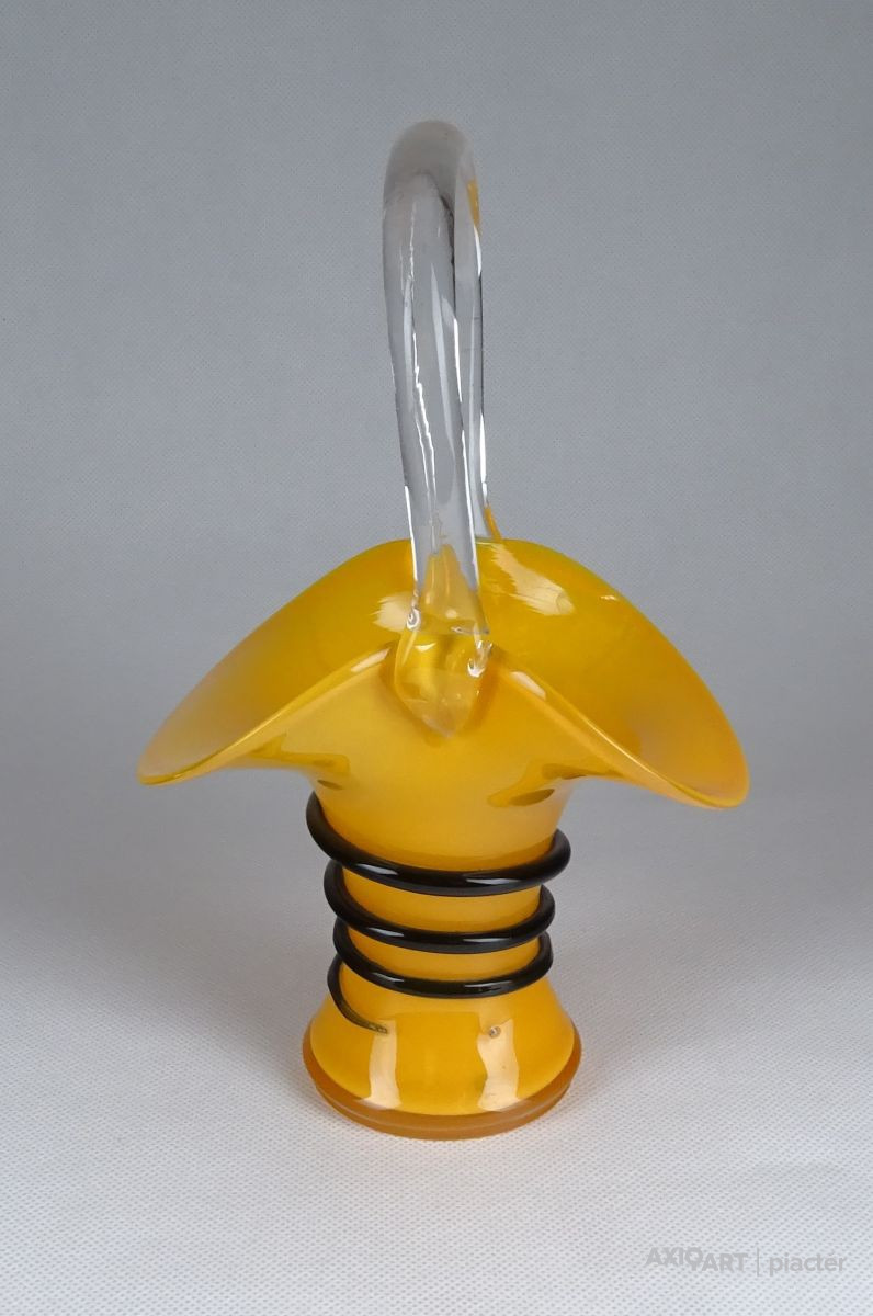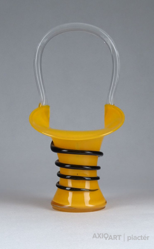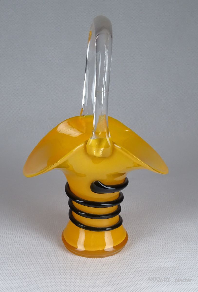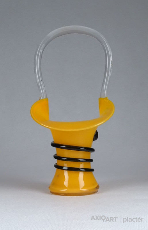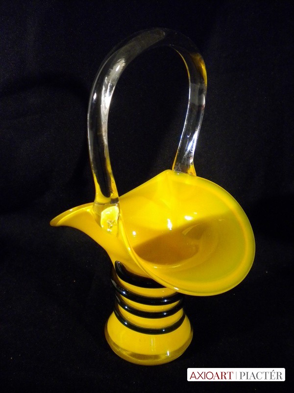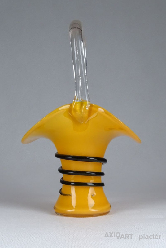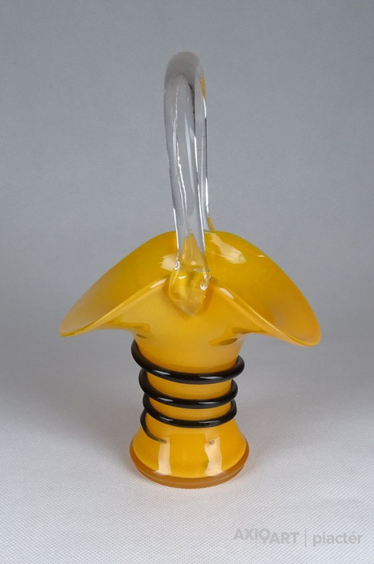 [P180/UZ-N] Állapot: Ép, hibátlan Régi art deco vitrintárgy, fújt színes rétegelt üvegkosár, rajta fekete plasztikus üvegcsík díszítéssel. Alján nem szakított üveg, hanem megcsiszolták. Magasság: 20 cm Súly: 0.285 kg