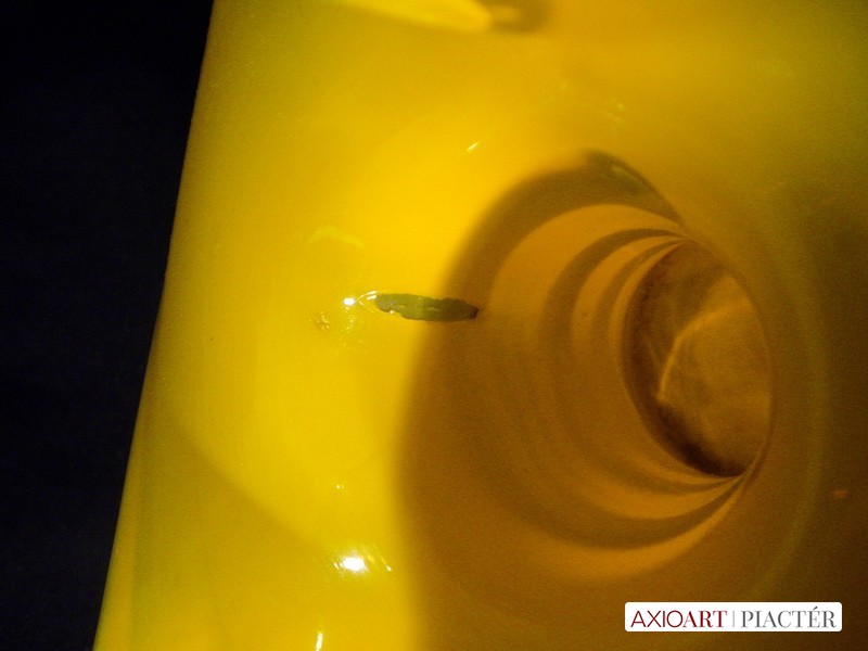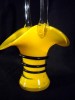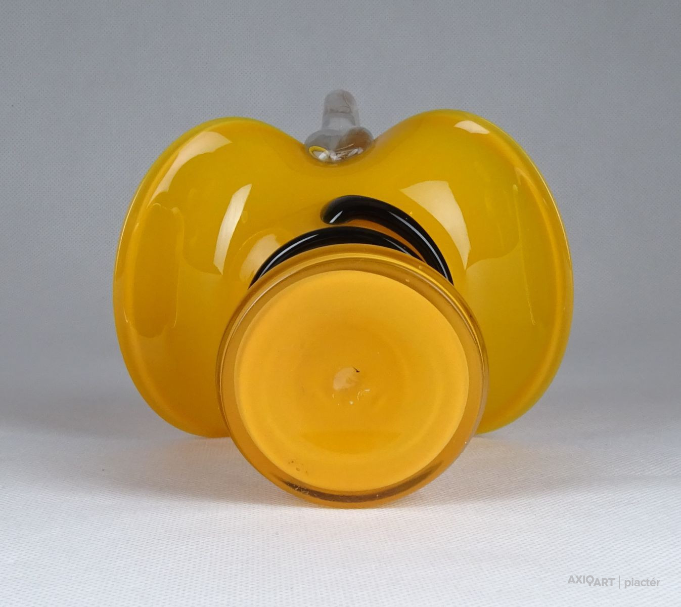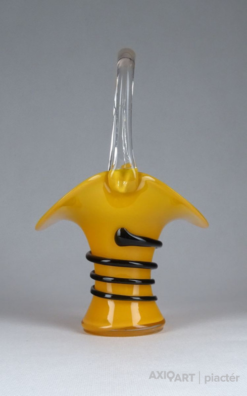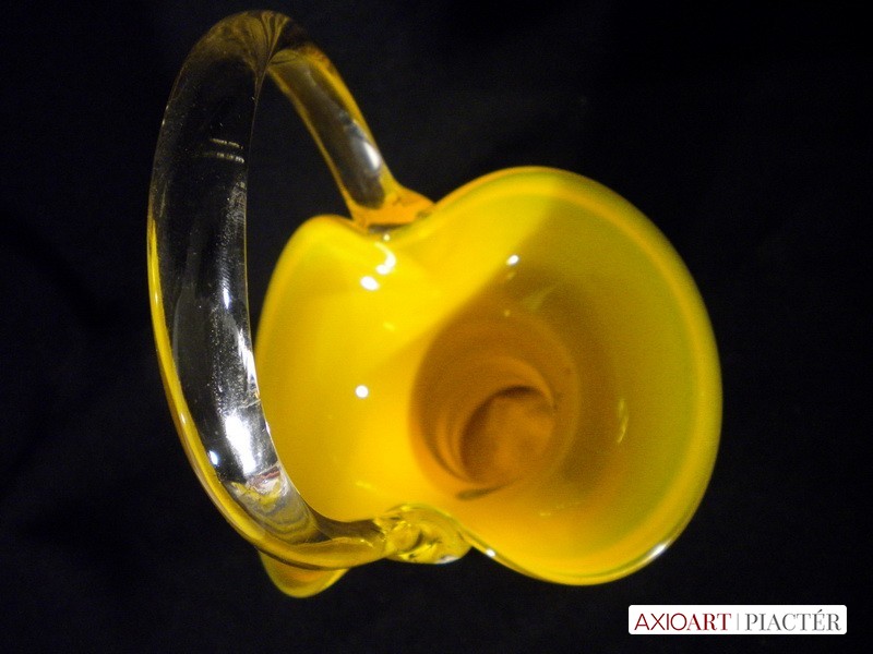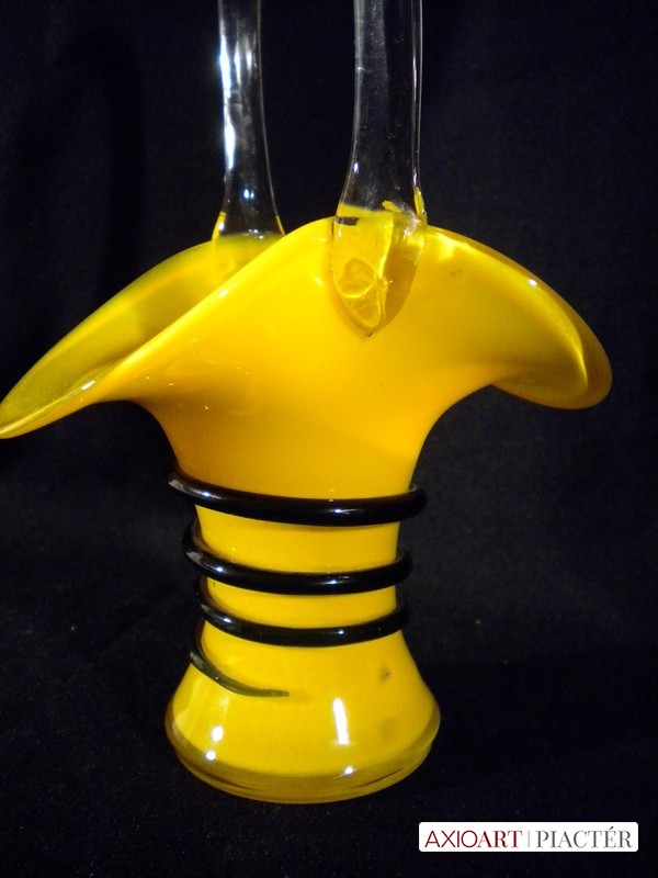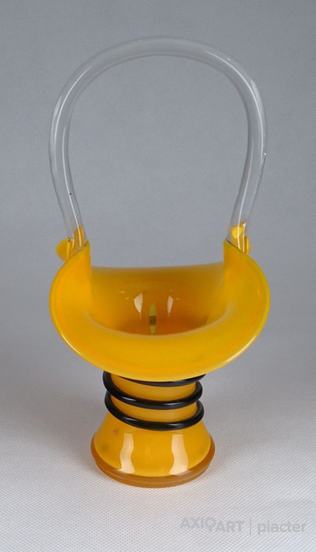 [P180/UZ-N] Állapot: Ép, hibátlan Régi art deco vitrintárgy, fújt színes rétegelt üvegkosár, rajta fekete plasztikus üvegcsík díszítéssel. Alján nem szakított üveg, hanem megcsiszolták. Magasság: 20 cm Súly: 0.285 kg