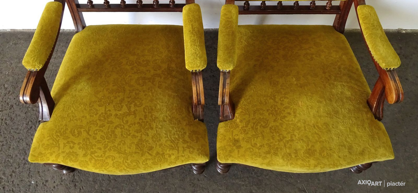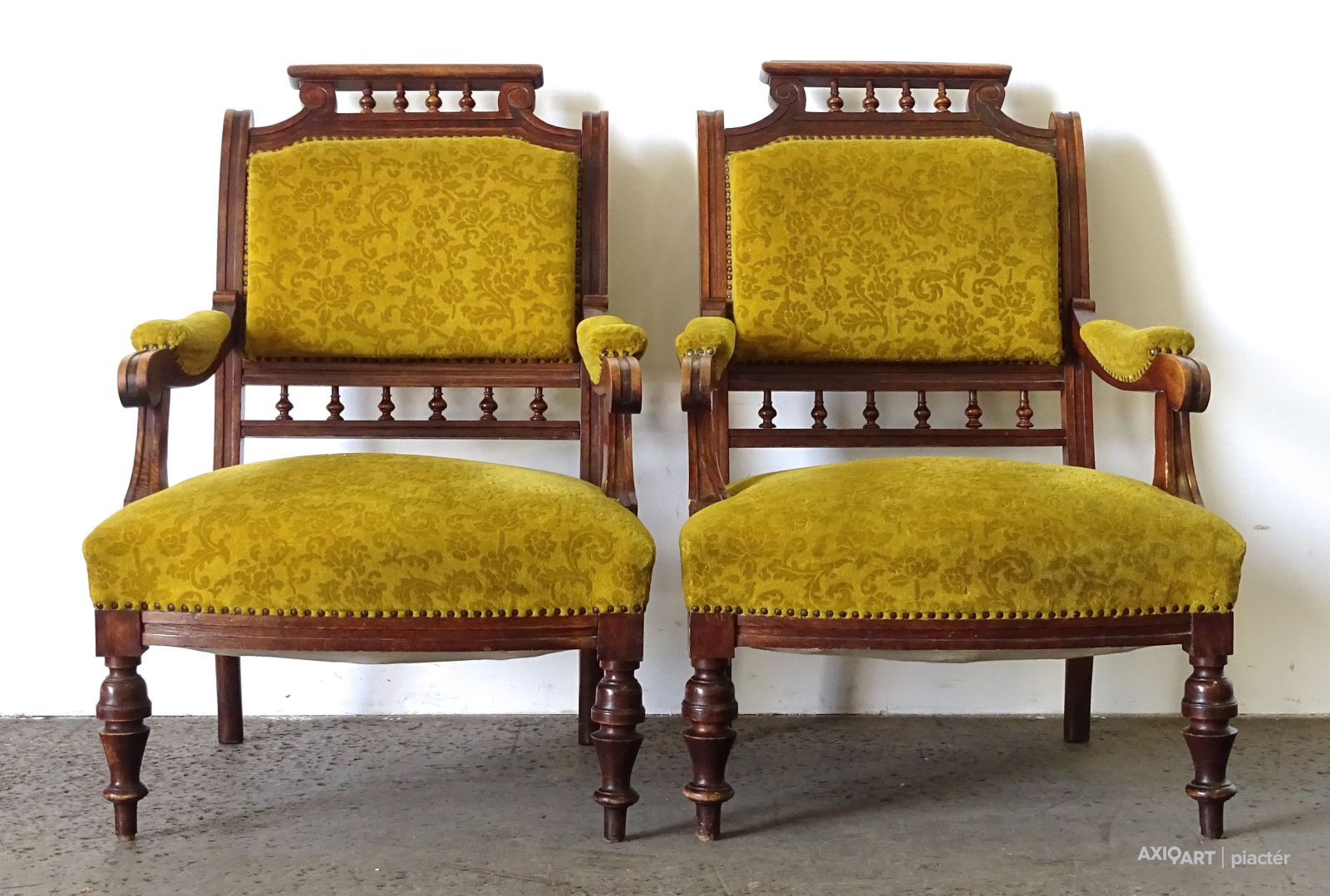 Régi, alacsony, karfás ónémet fotel, párban. Mustár sárga kárpit alatt rugós ülőfelület. Támlája tetején áttört, faragott díszítés. A kárpiton kisebb foltok találhatók, lásd fotó.