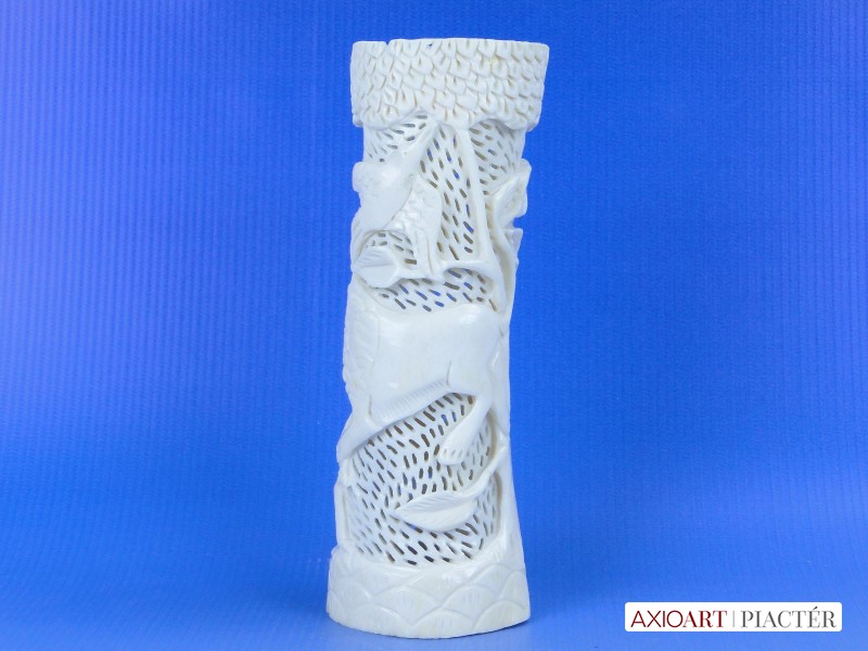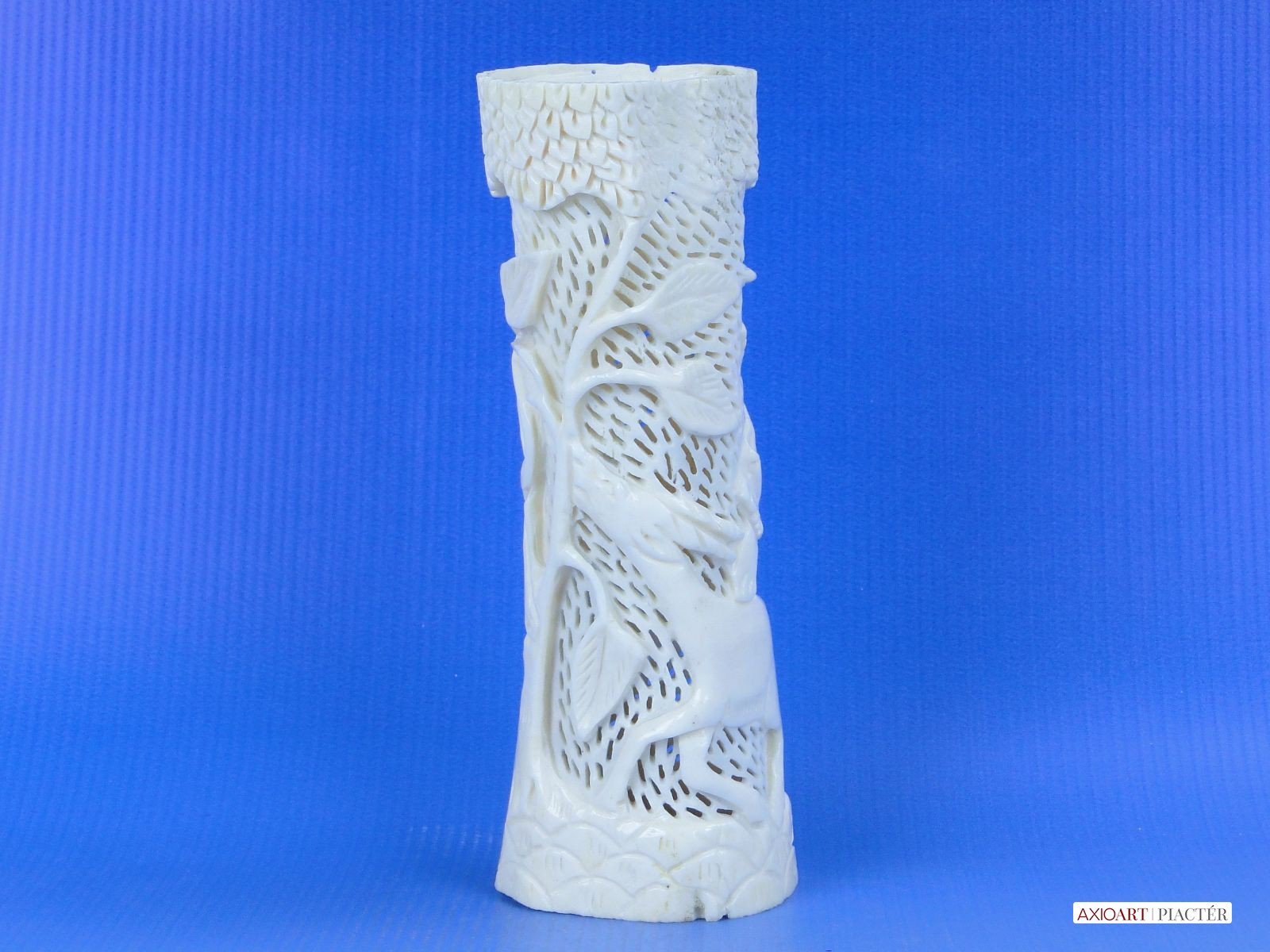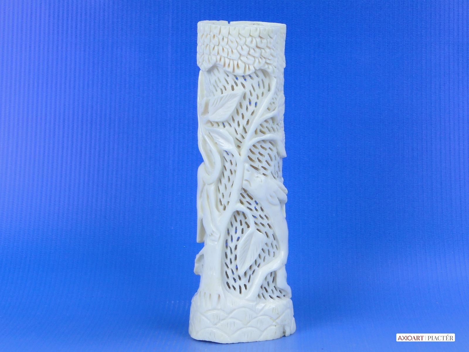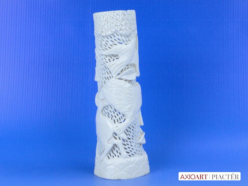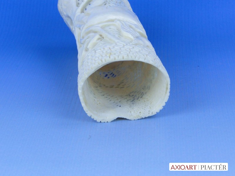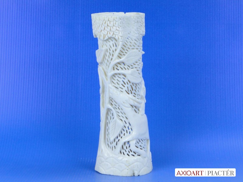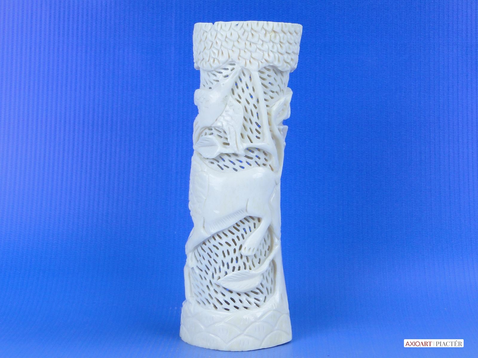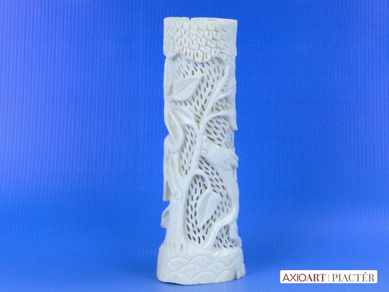 [0D396/Bx-2] Szép állapotú, gazdagon, részletdúsan faragott csontból készült dísztárgy. Rajta vadászó oroszlán, madár, fa és levél díszítéssel. Magasság: 15 cm Szélesség: 5.5 cm Súly: 0.111 kg