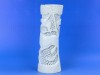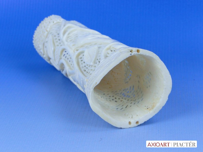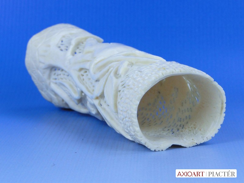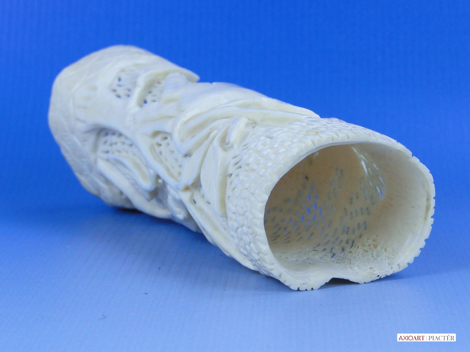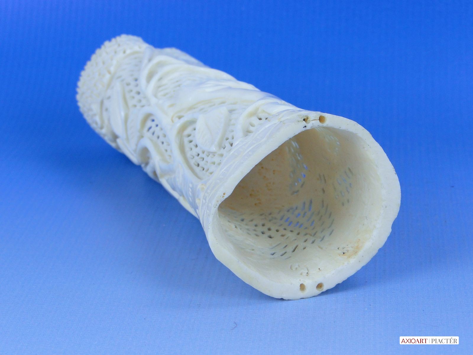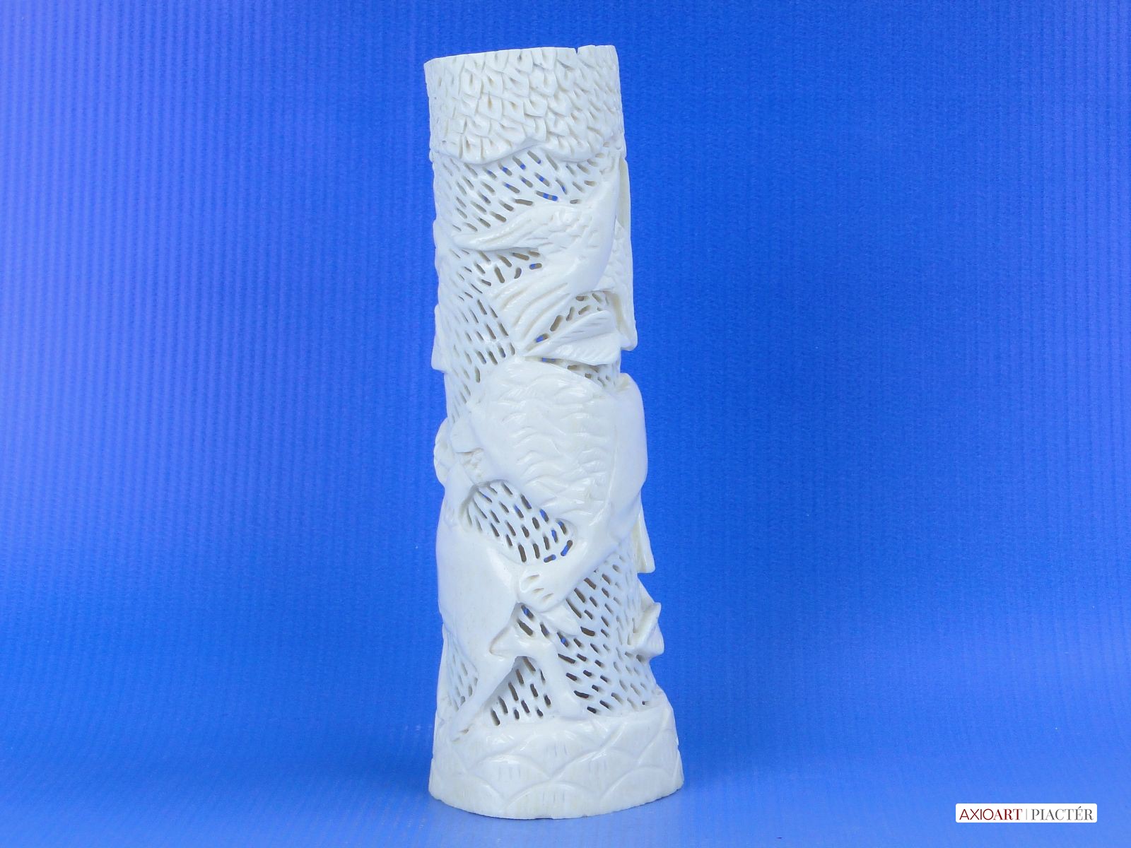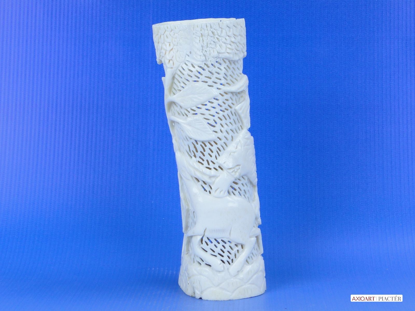 [0D396/Bx-2] Szép állapotú, gazdagon, részletdúsan faragott csontból készült dísztárgy. Rajta vadászó oroszlán, madár, fa és levél díszítéssel. Magasság: 15 cm Szélesség: 5.5 cm Súly: 0.111 kg