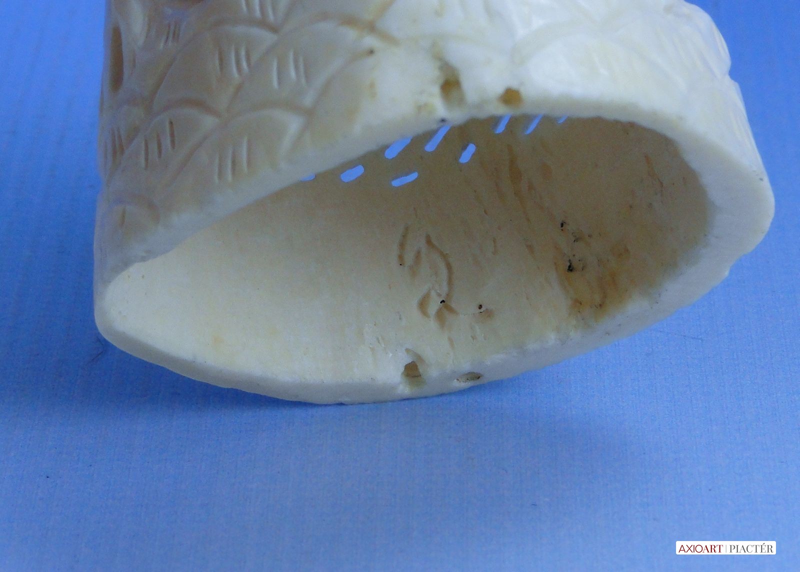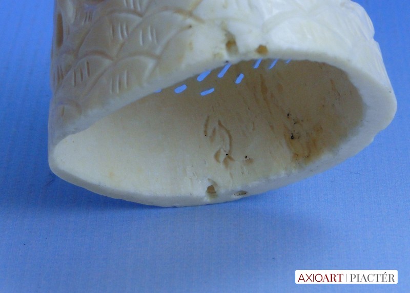 Szép állapotú, gazdagon, részletdúsan faragott csontból készült dísztárgy. Rajta vadászó oroszlán, madár, fa és levél díszítéssel.