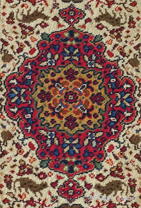 Arab mintás ritka farkas, róka díszes szőnyeg. Közepén 8 farkas vagy sakál díszítéssel. Rojtjai szépek, hosszúak. Kézi szövésű.