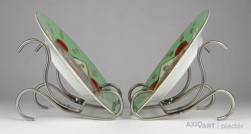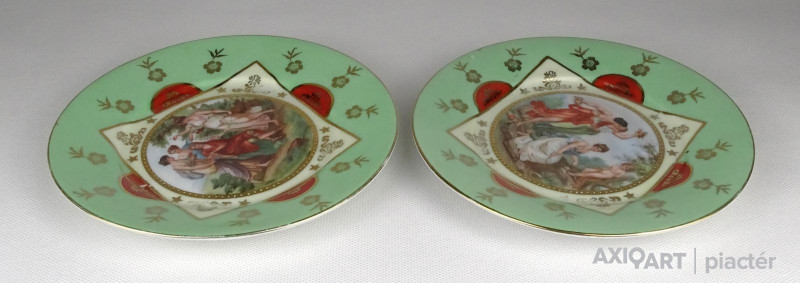 Régi, gyönyörű porcelán dísztányér, dísztál párban. Körben aranyozás és zöld szegély díszítés, közepében egy-egy négy alakos allegorikus jelenet.