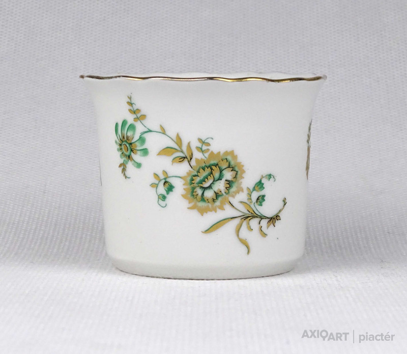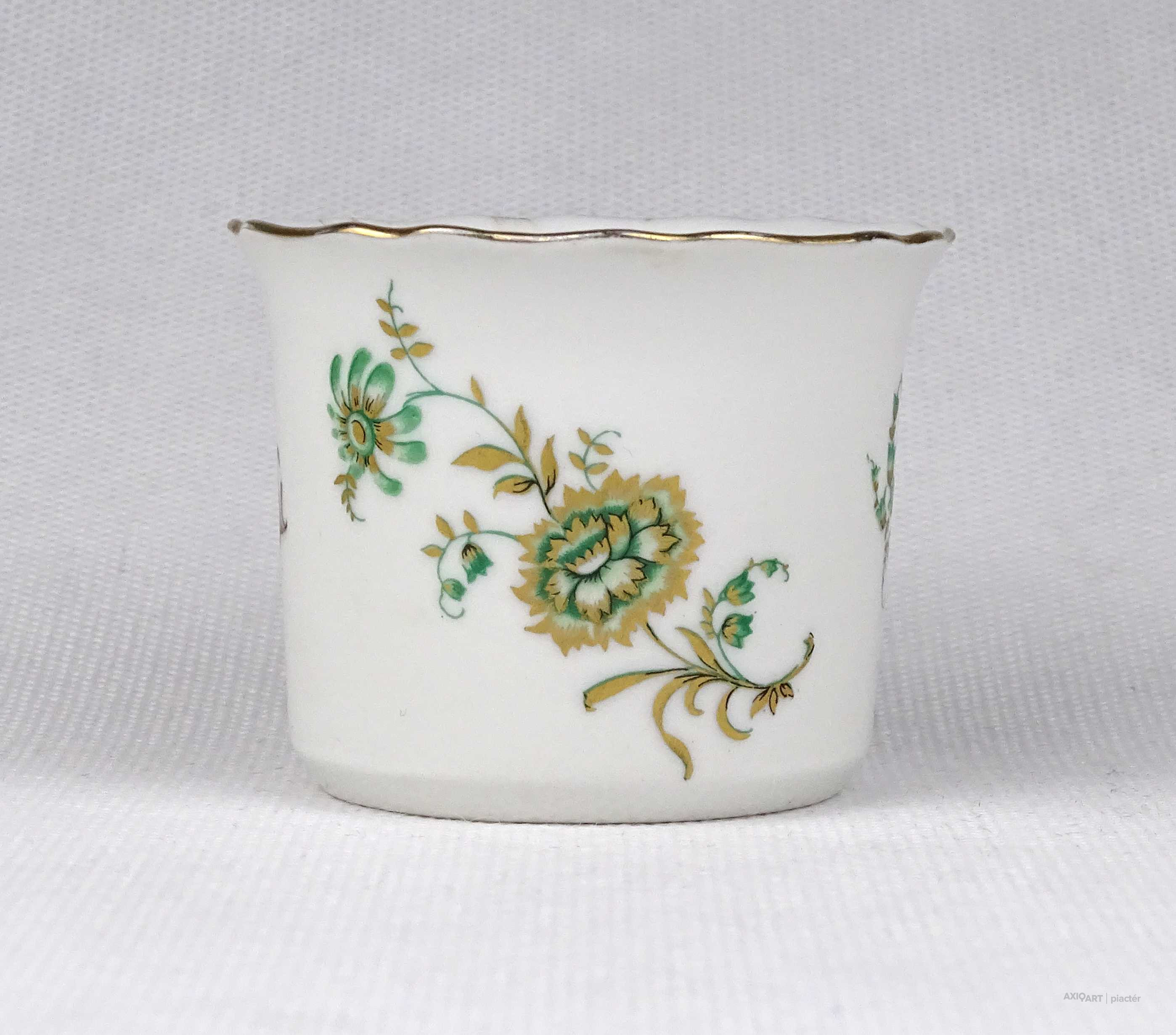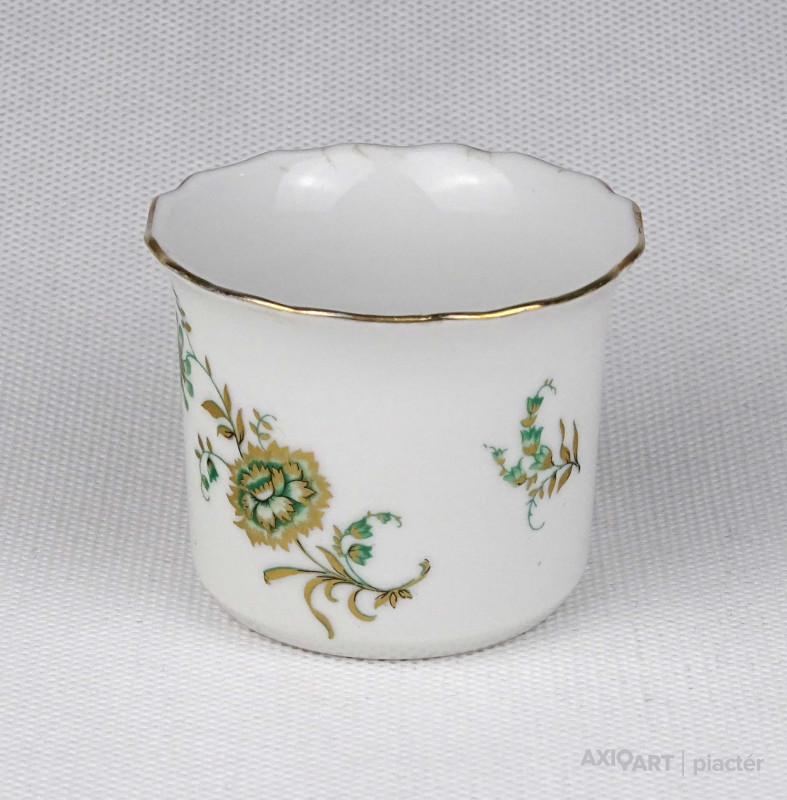 Hibátlan állapotú, jelzett Aquincum porcelán kisméretű kaspó, kézi festéssel és arany szegéllyel díszítve.