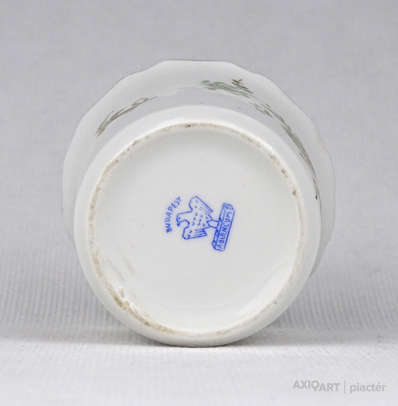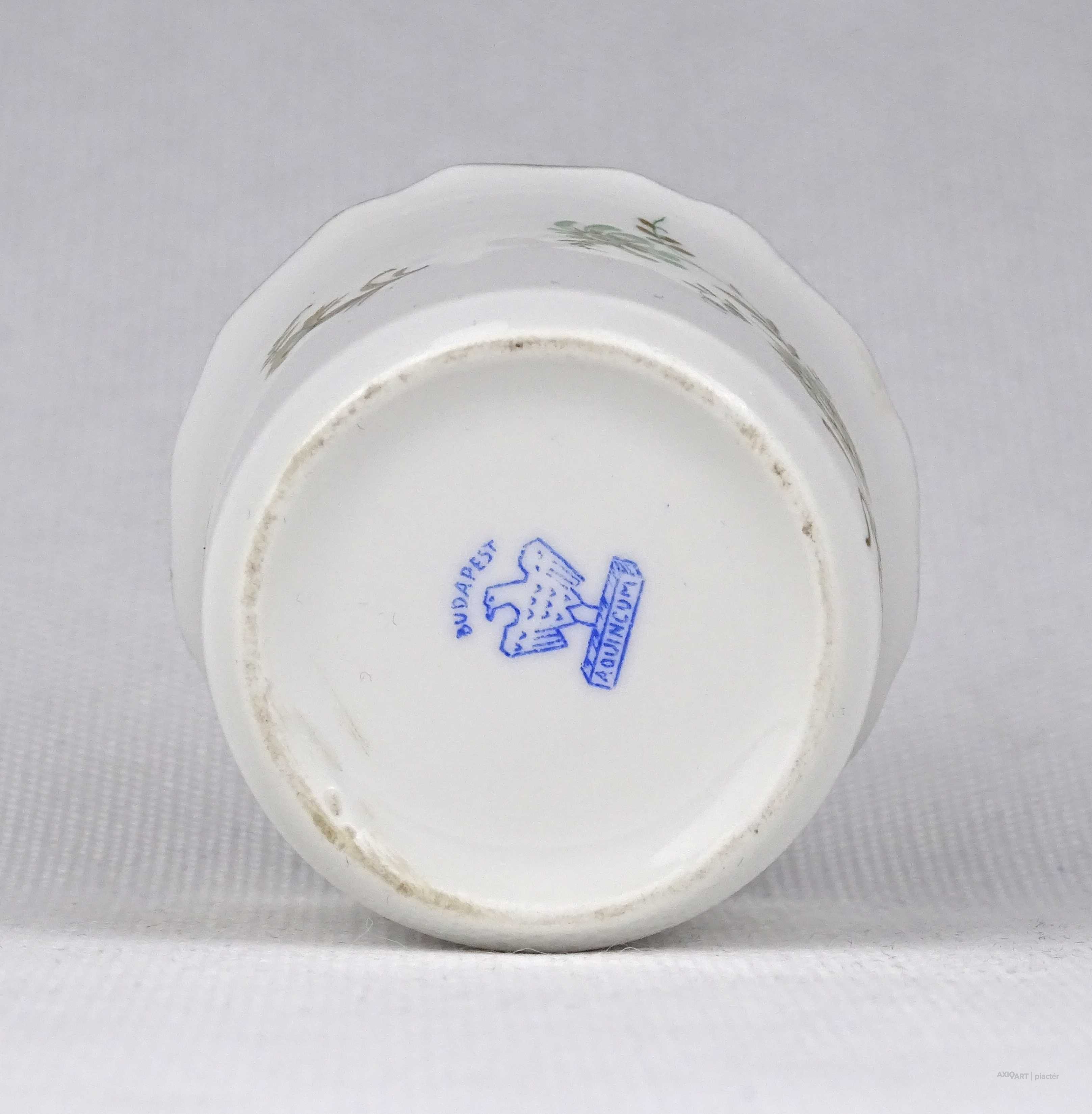 [1U435/X198] Hibátlan állapotú, jelzett Aquincum porcelán kisméretű kaspó, kézi festéssel és arany szegéllyel díszítve. Alján kék jelzés: BUDAPEST AQUINCUM Magasság: 4.7 cm Szélesség: 5.8 cm Súly: 0.06 kg