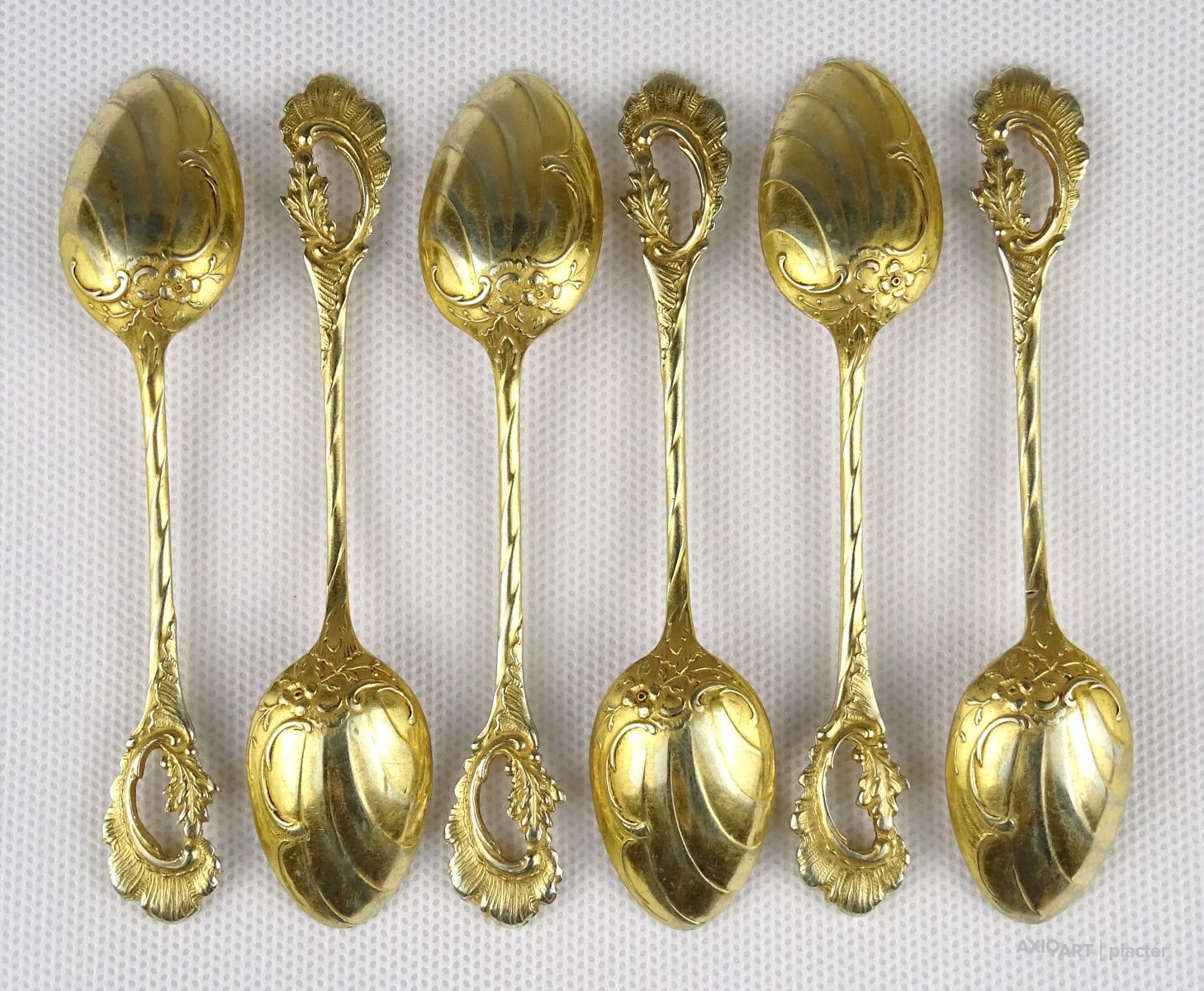 Régi, hat darab egyforma díszes, arany színű barokk kanál, kiskanál. Díszes végű áttört kanalak.