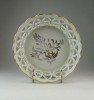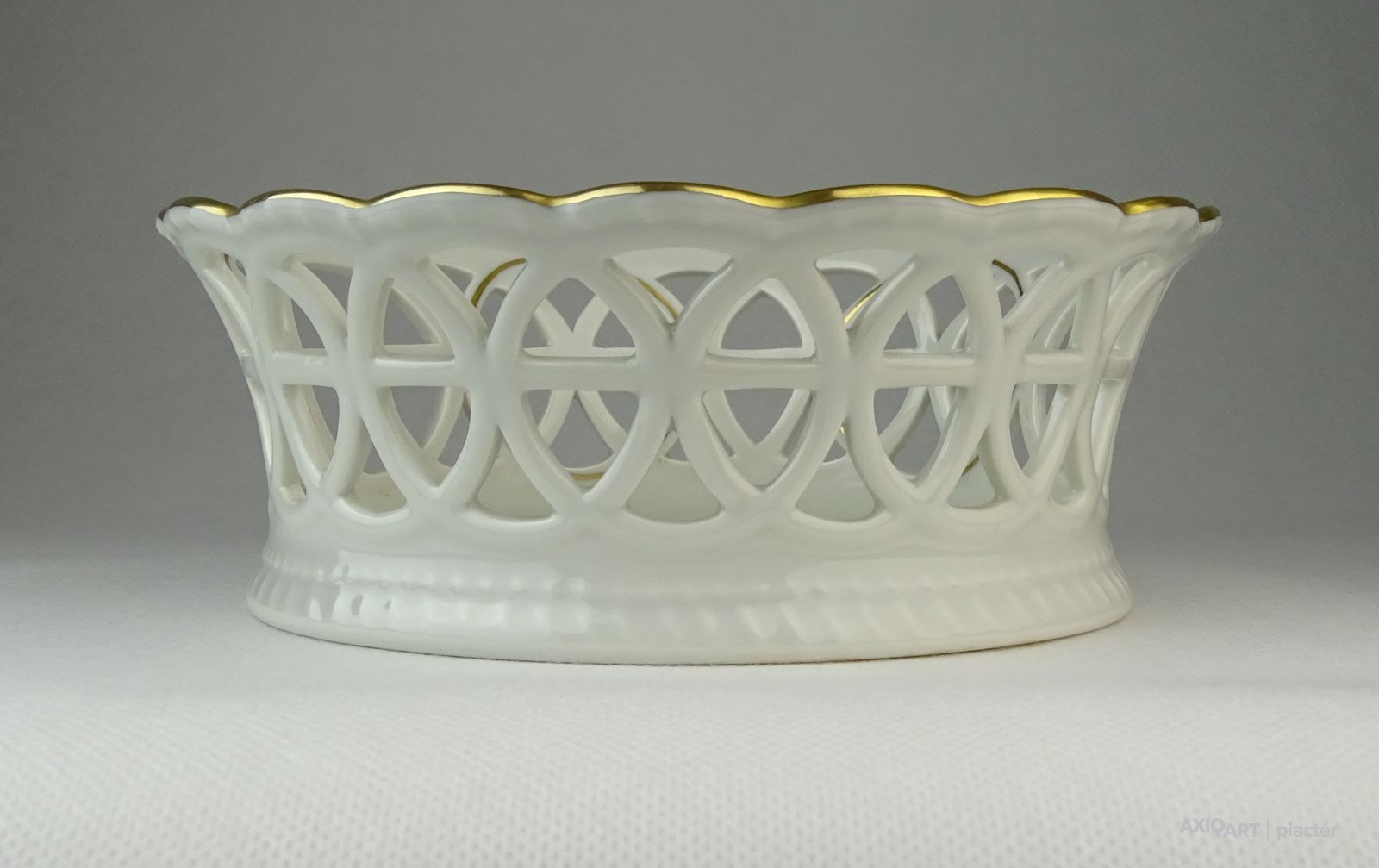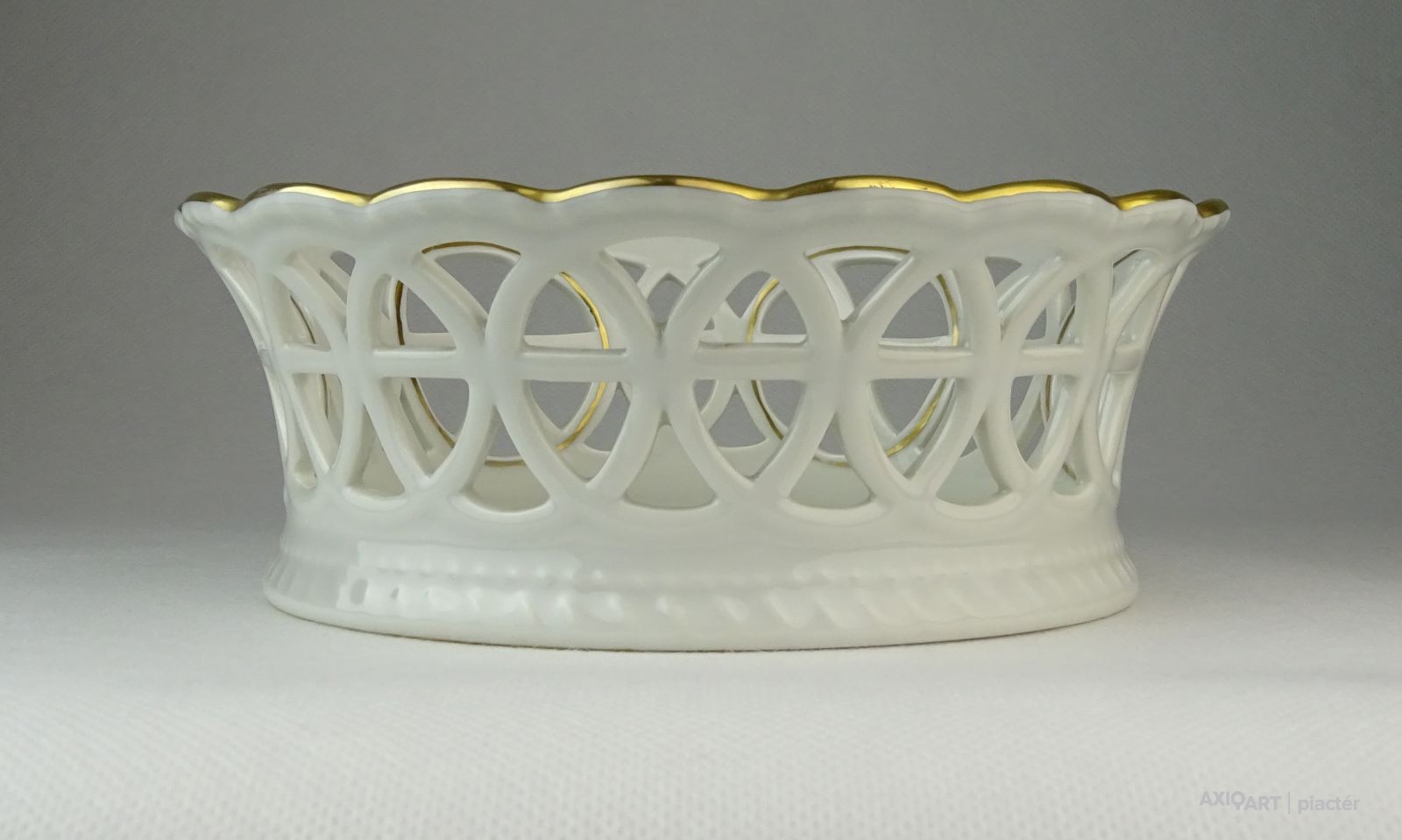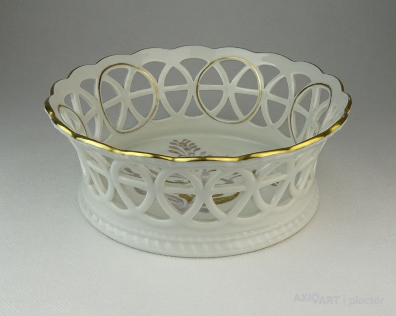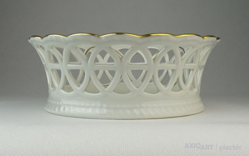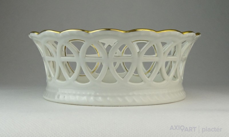 Régi, hibátlan állapotú, arannyal díszített, áttört szélű porcelán kosár, asztalközép kínáló tál.