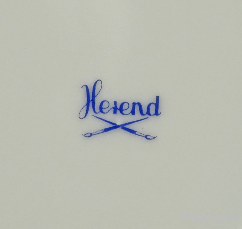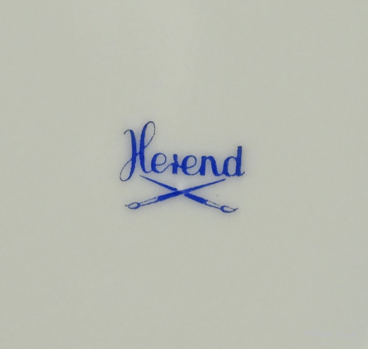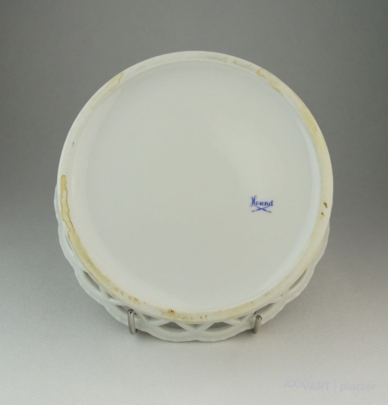 [0Q293/X201] Régi, hibátlan állapotú, arannyal díszített, áttört szélű porcelán kosár, asztalközép kínáló tál. Alján kék ecsetes Herendi jelzés: HEREND Magasság: 7 cm Szélesség: 18.5 cm Súly: 0.43 kg