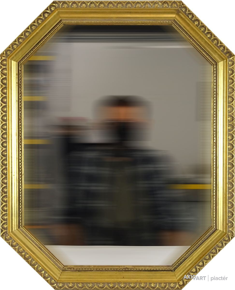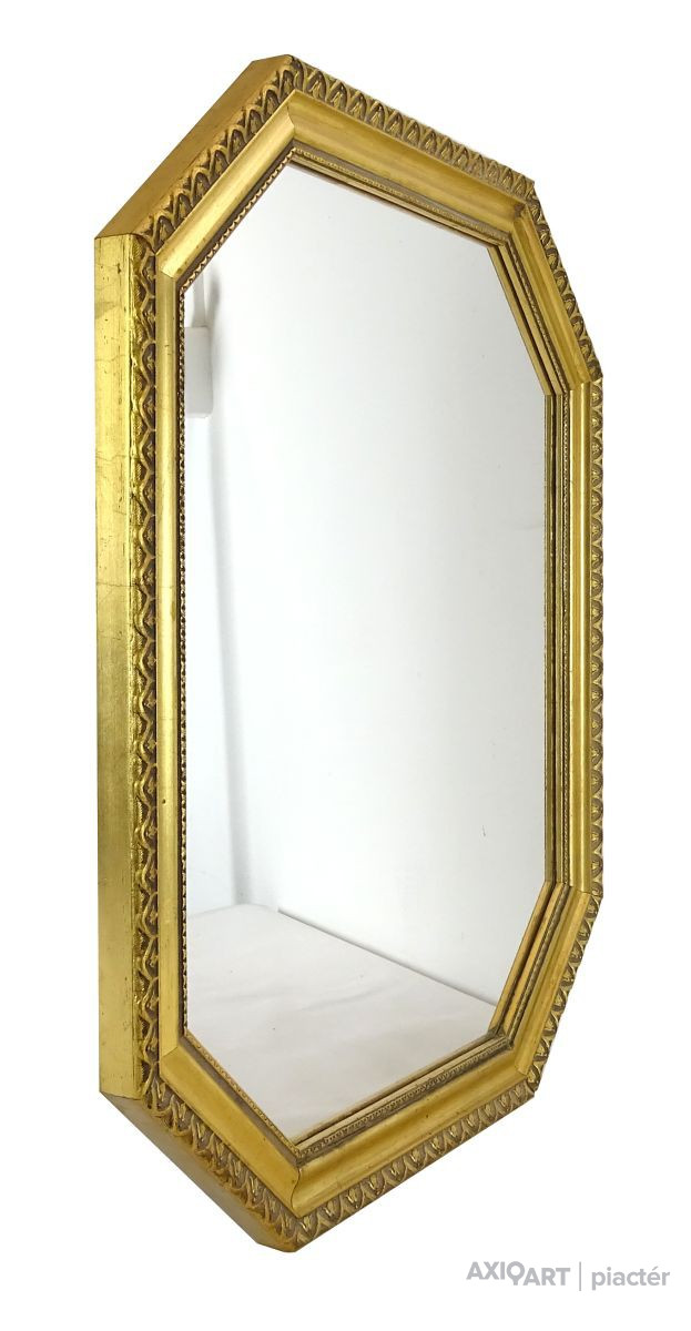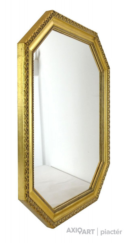[0Z099/037] Régi, szép állapotú, aranyozott keretben található tükör. Nyolcszögletű, oktogon tükör. Hátoldalán falra akasztási lehetőséggel. Magasság: 59 cm Szélesség: 47.5 cm Súly: 2.455 kg