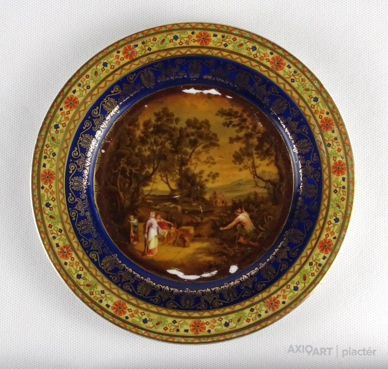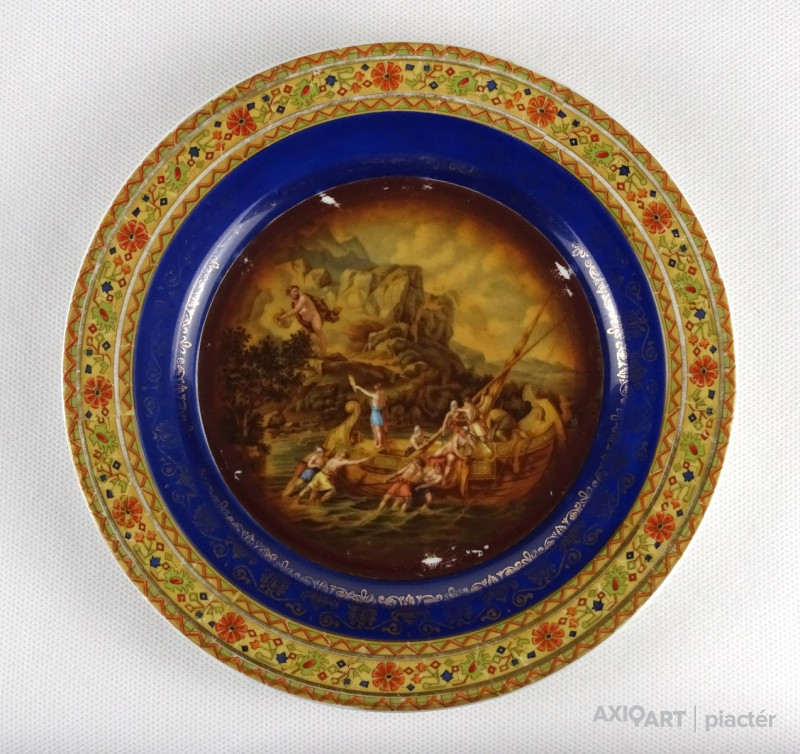 Régi, arannyal gazdagon díszített, fekete színű porcelán süteményes készlet. A tányérokon nagyon szép többalakos allegorikus jelenet látható.