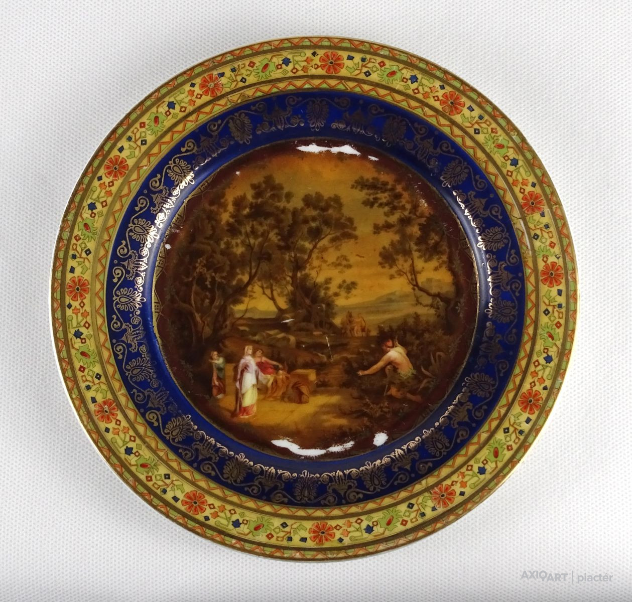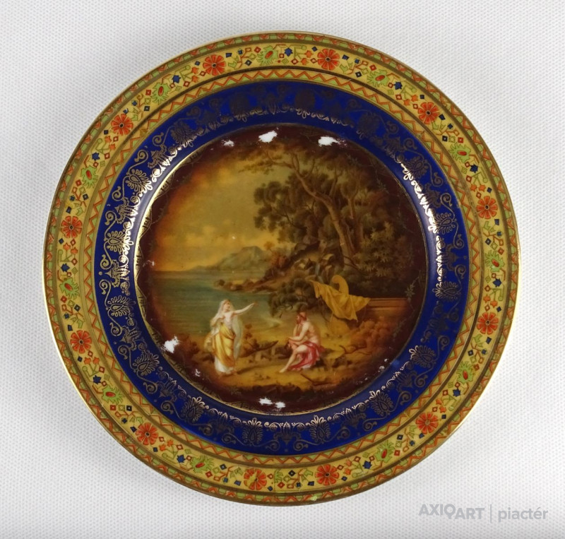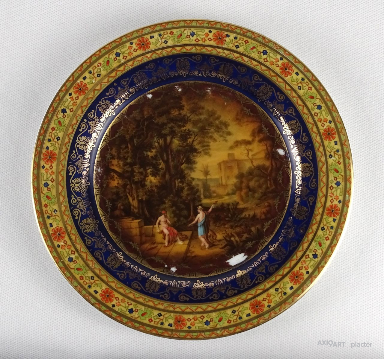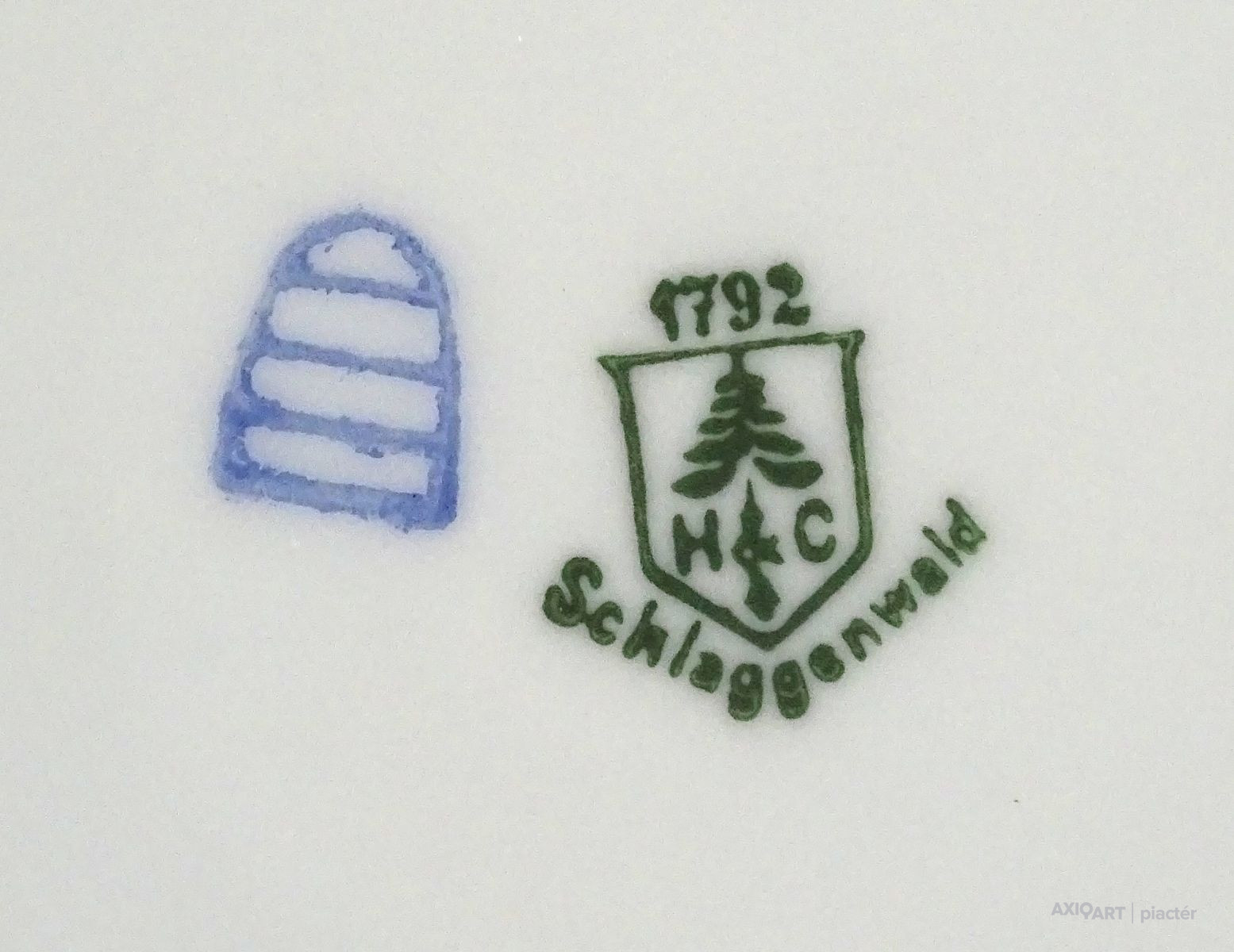 [1O070/Z010] Régi, arannyal gazdagon díszített, fekete színű porcelán süteményes készlet. A tányérokon nagyon szép többalakos allegorikus jelenet látható. Alján zöld márkajelzés: 1792 H&C SCHLAGGENWALD Szélesség: 18.5 cm Súly: 2.09 kg