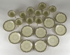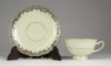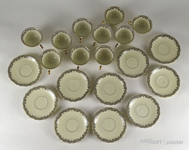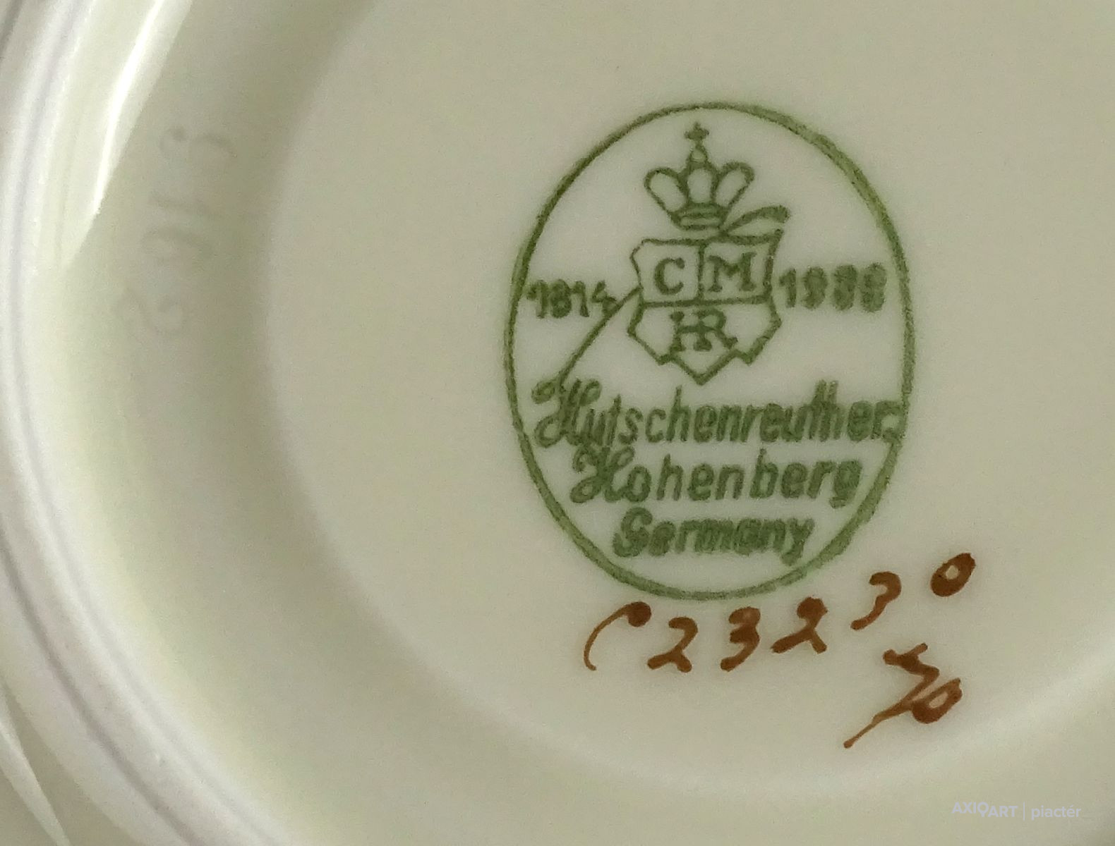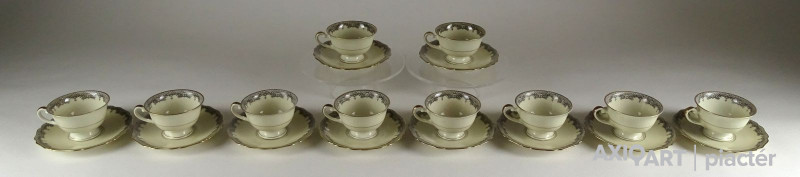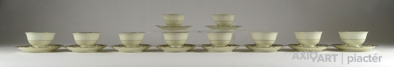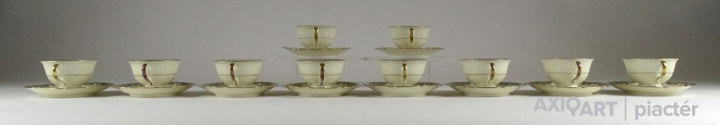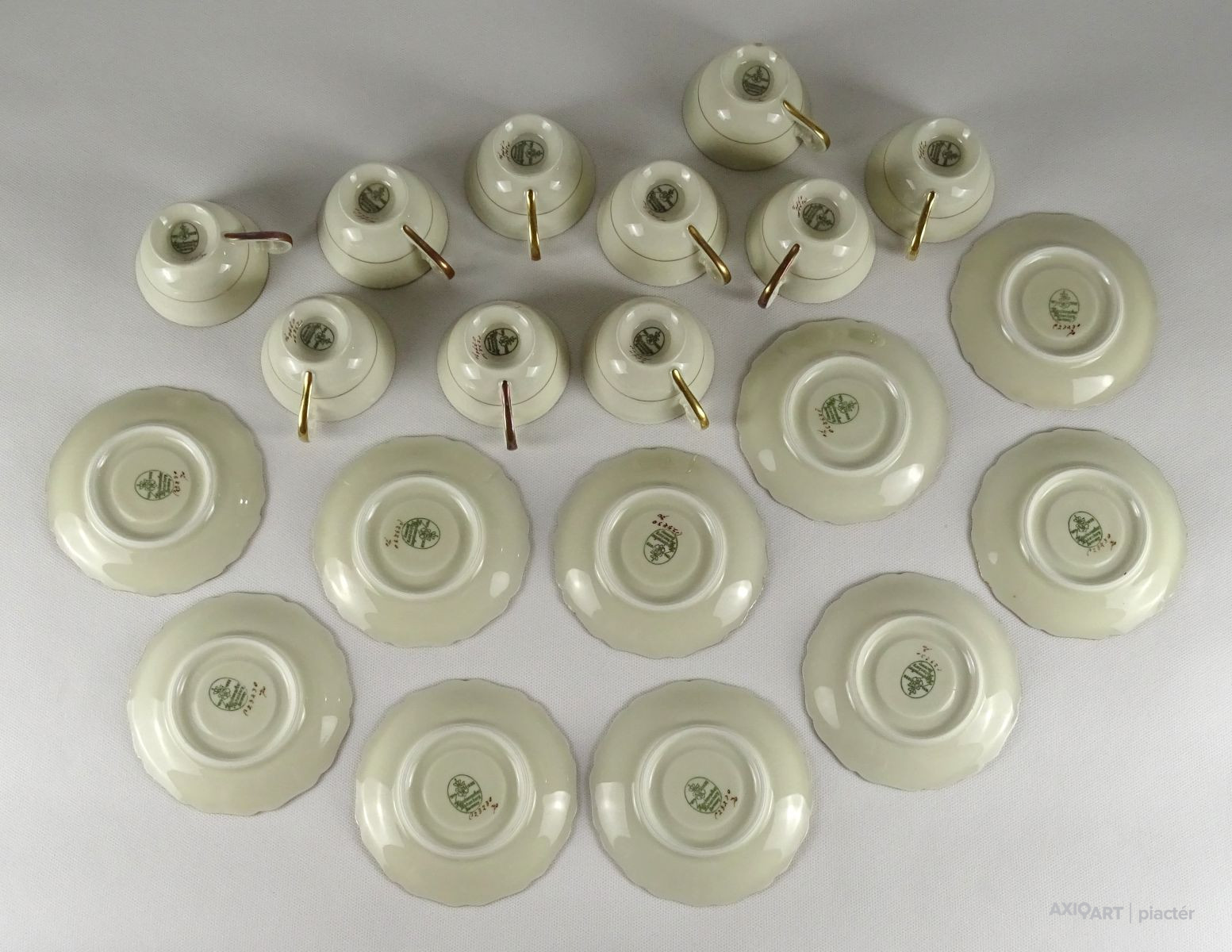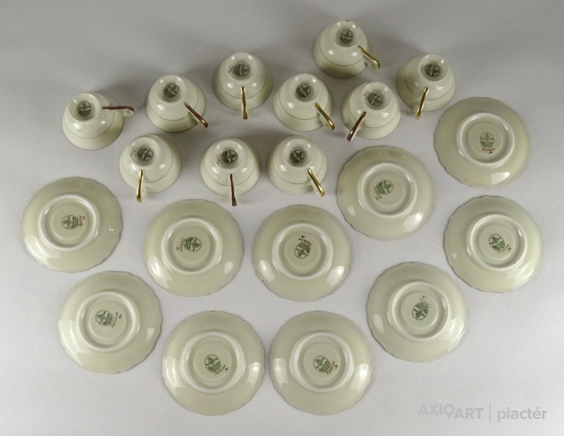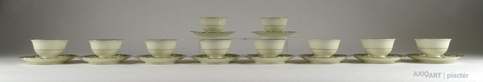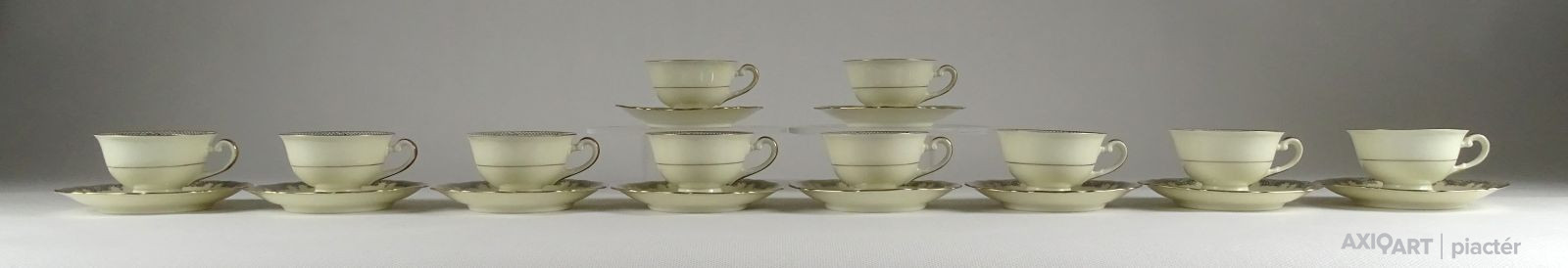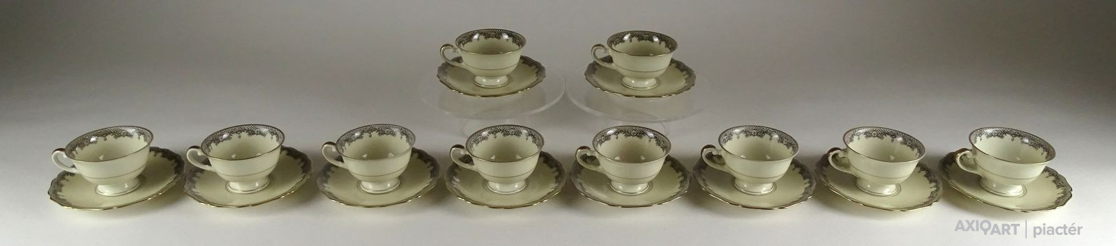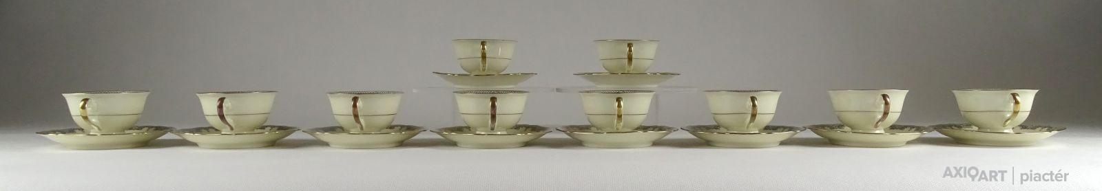 [1S086/X211] Régi, aranyozással és fekete csipke jellegű motívummal díszített, jelzett, hibátlan állapotú, Hutschenreuther porcelán kávéskészlet. Alján zöld koronás márkajelzés: HUTSCHENREUTHER HOHENBERG GERMANY A készlet darabjai: - 10 darab csésze kávéscsésze (4.4 x 7 x 8.5 cm) - 10 darab alátét tányér (11 cm) Súly: 0.98 kg