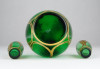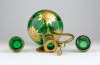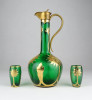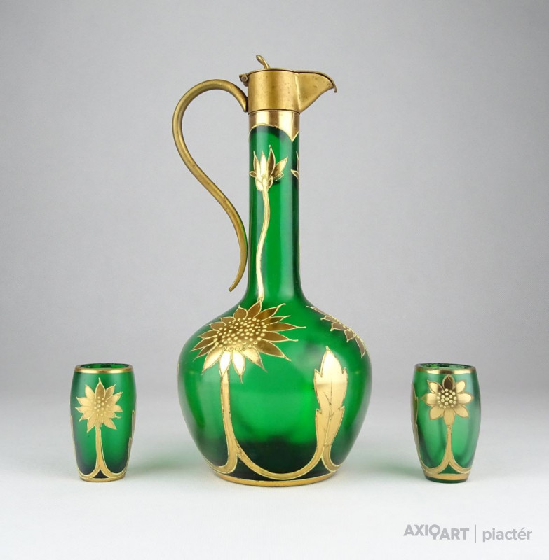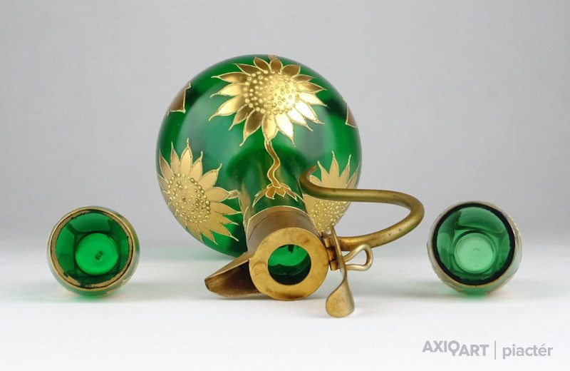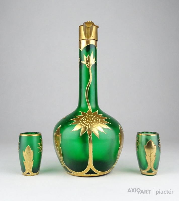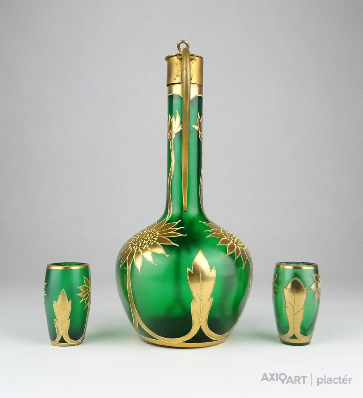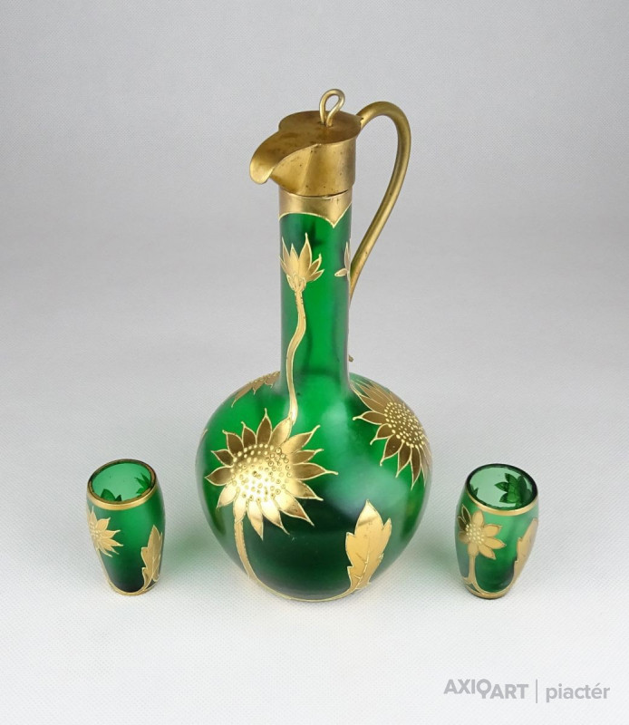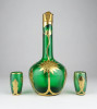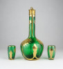 [0X748/X212] Régi, szép állapotú, anyagában zöldre színezett, gazdagon aranyozott üveg italos készlet, pálinkás készlet. A készlet darabjai: - 1 darab réz rátétes üveg kínáló (20.5 x 9 cm) - 2 darab pálinkás pohár (5.3 x 3 cm) Súly: 0.3 kg