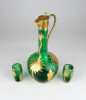 Régi, szép állapotú, anyagában zöldre színezett, gazdagon aranyozott üveg italos készlet, pálinkás készlet.