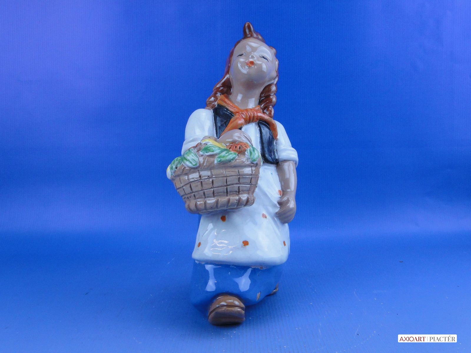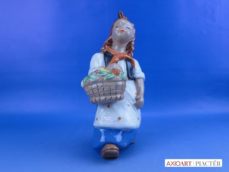 [0D736/BX-9] 25% ÁRENGEDMÉNY MINDEN TERMÉKÜNKRE Dec. 14-ig Jelzetlen Komlós forma, hibátlan állapotú, 40-es évekbeli mázas kerámia, virágkosaras kislány. Szoknyáján egy apró máz lepattanás található. Magasság: 24 cm Szélesség: 13 cm Súly: 1.07 kg
