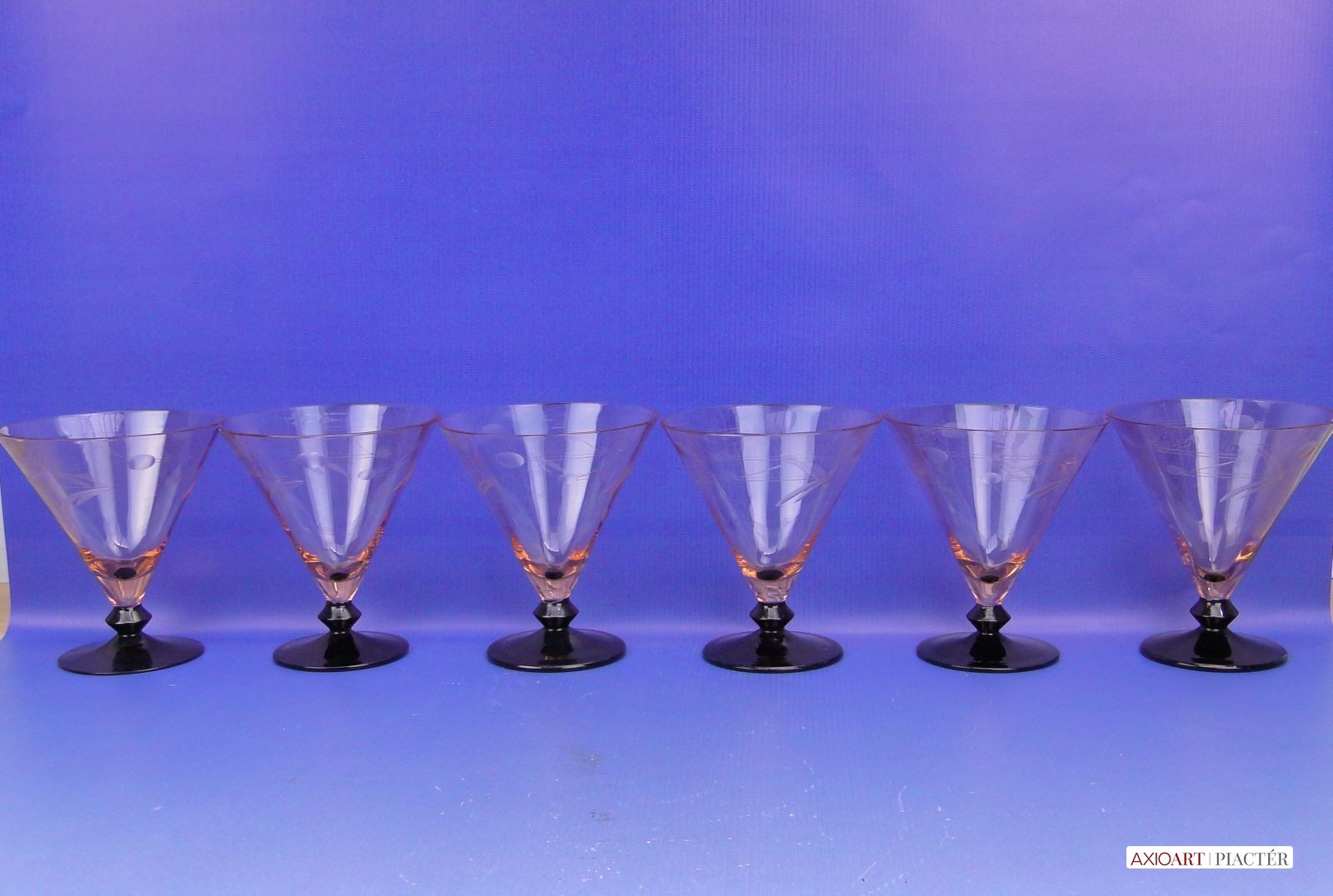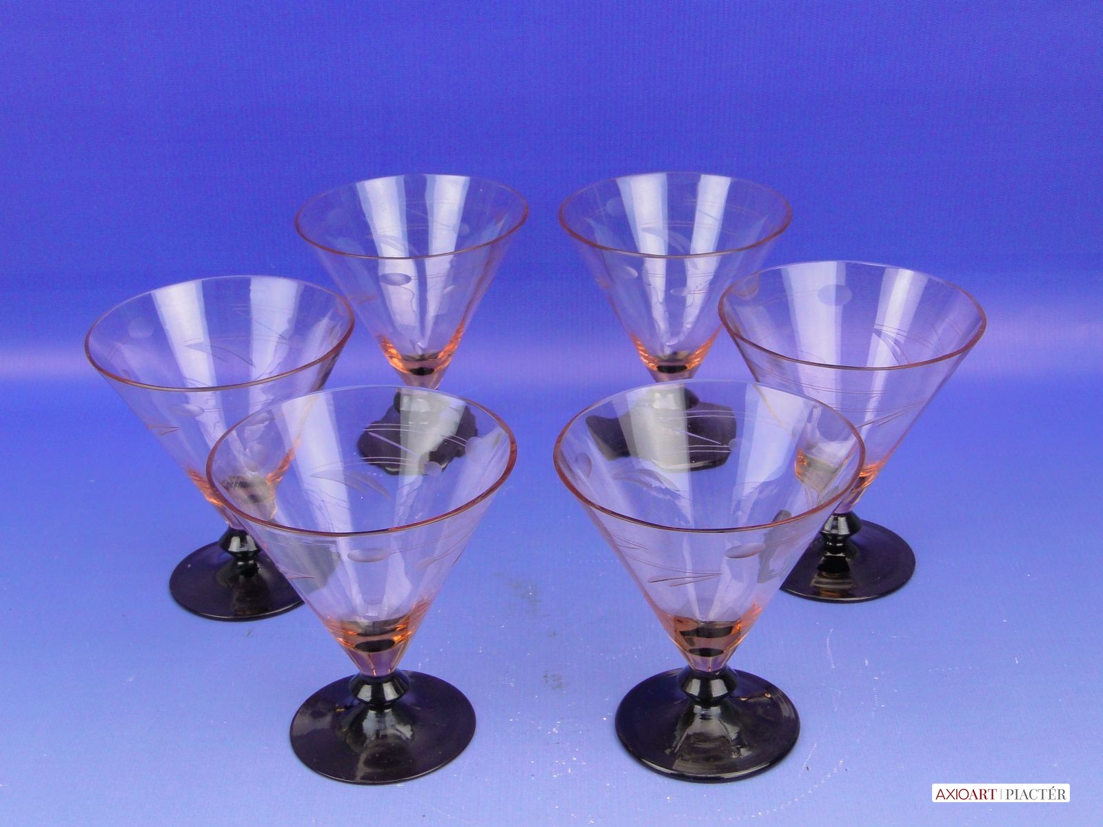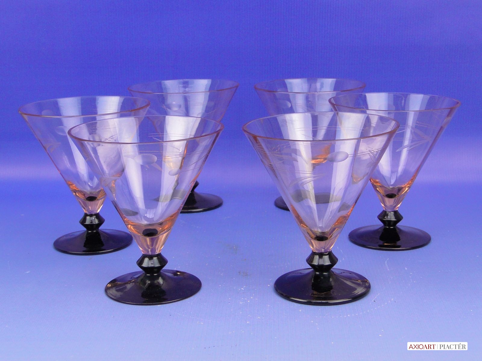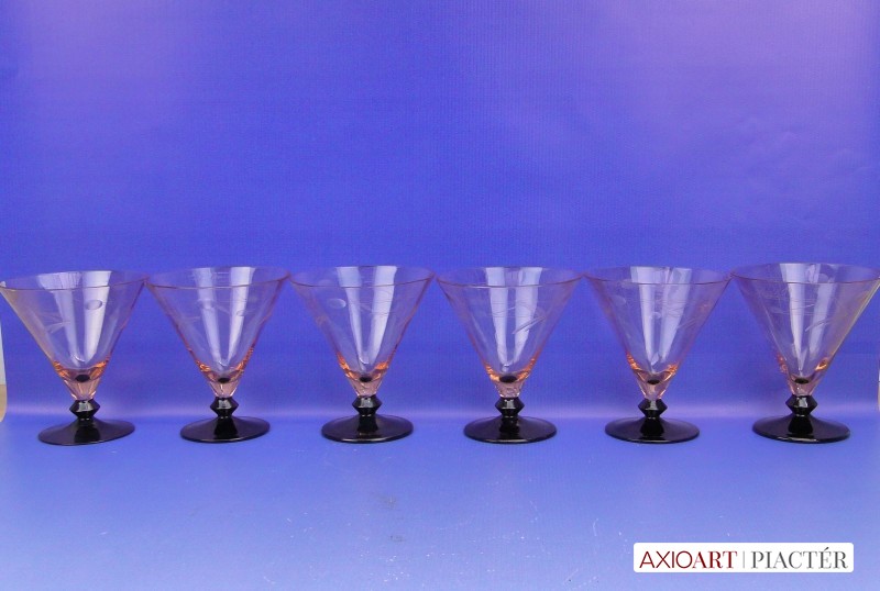 [0B779/X094] Fújt, csiszolt, 30-as évekbeli pohárkészlet, rendkívül ritka, jó állapotban megmaradt darabok. Magasság: 12 cm Súly: 0.8 kg