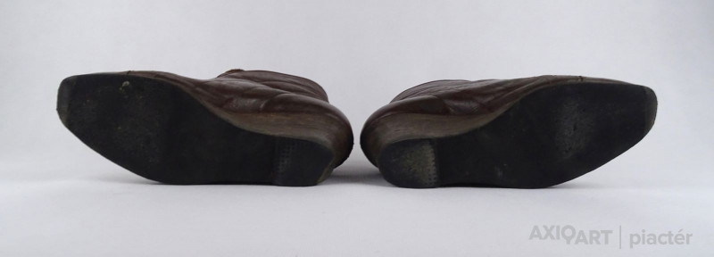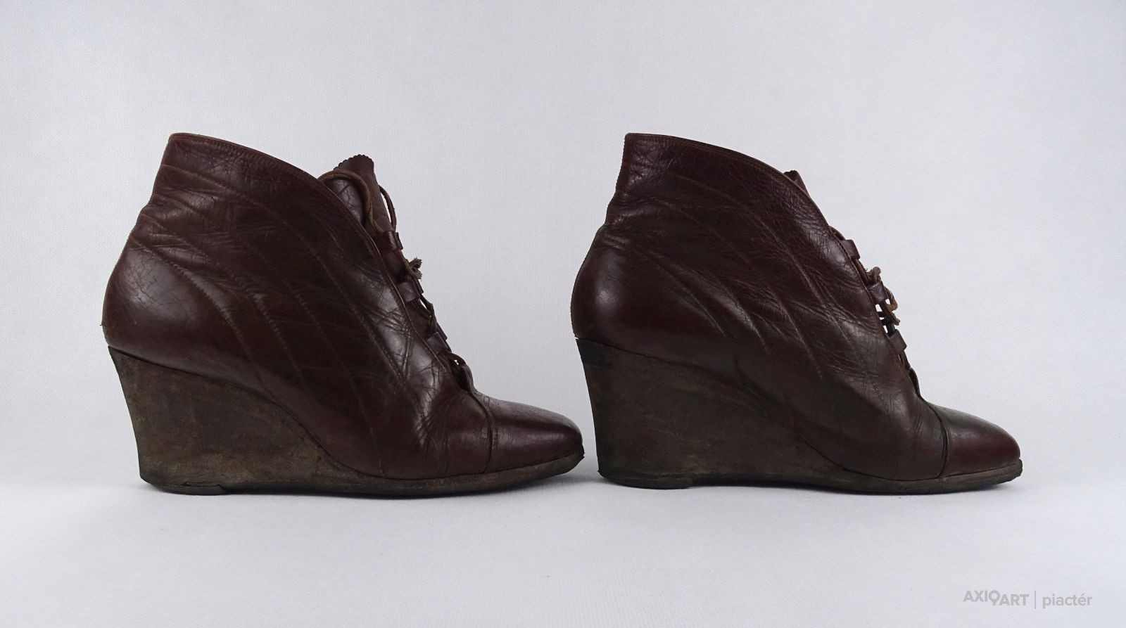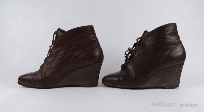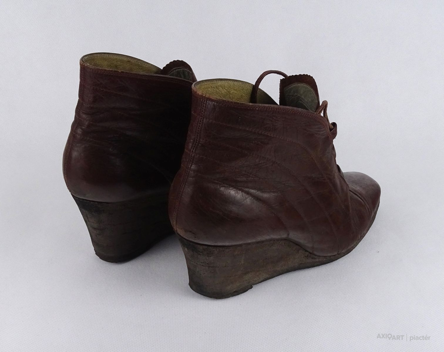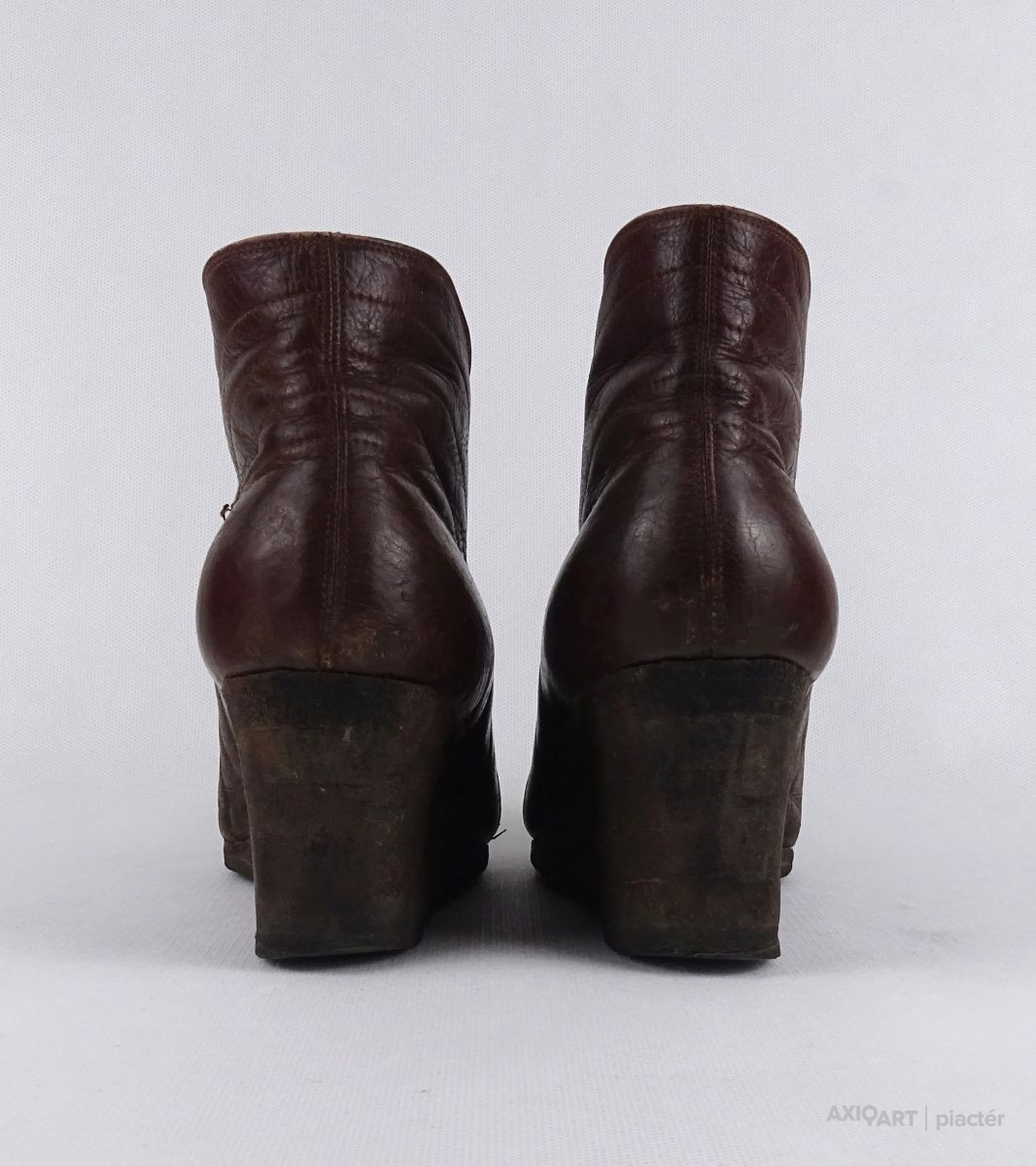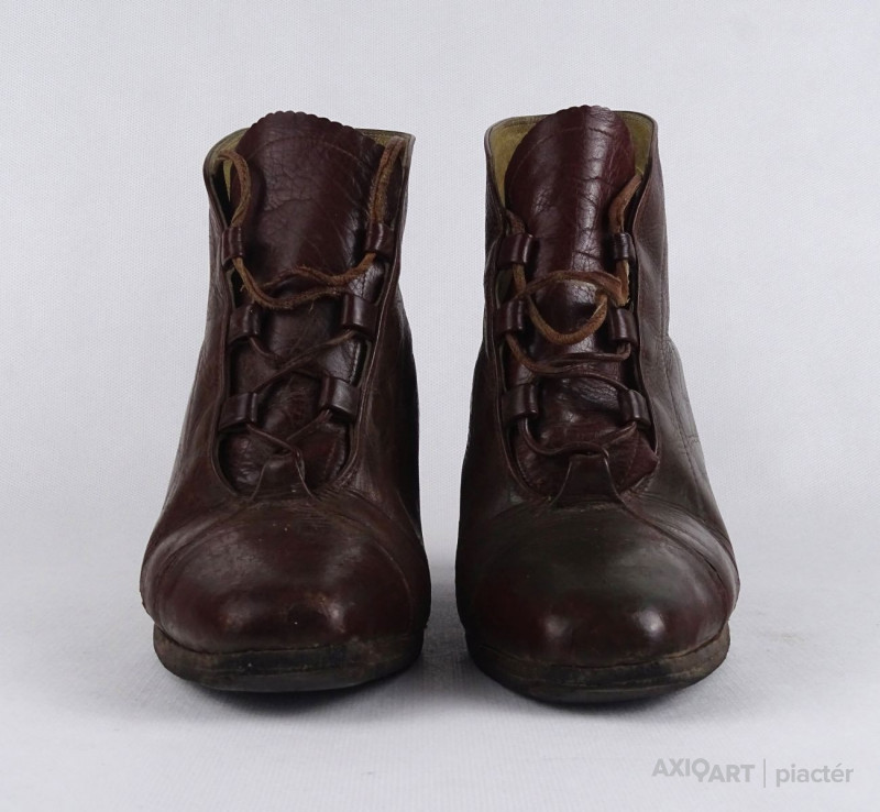 Magas sarokkal rendelkező, háború előtti barna színű, félmagas szárú női bőr cipő. Gyűjteményes darab.
