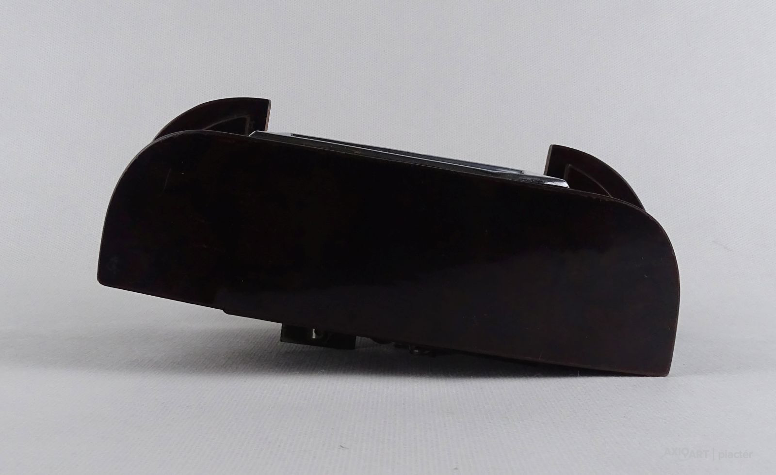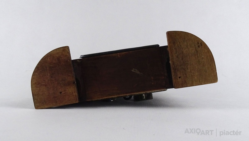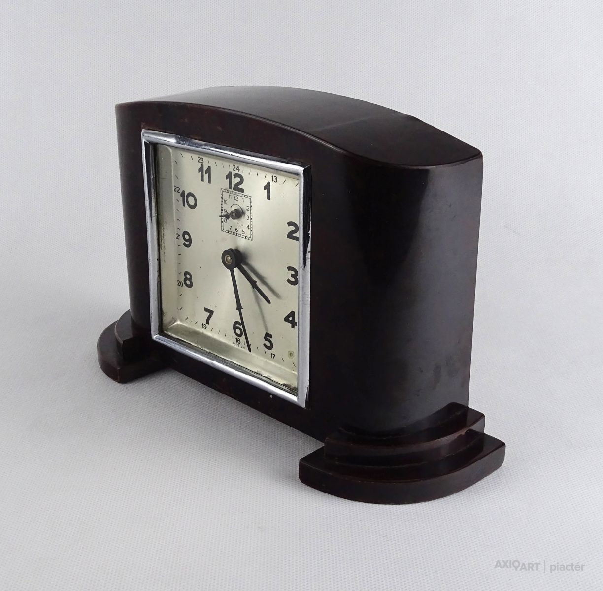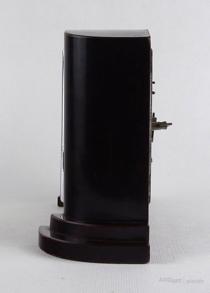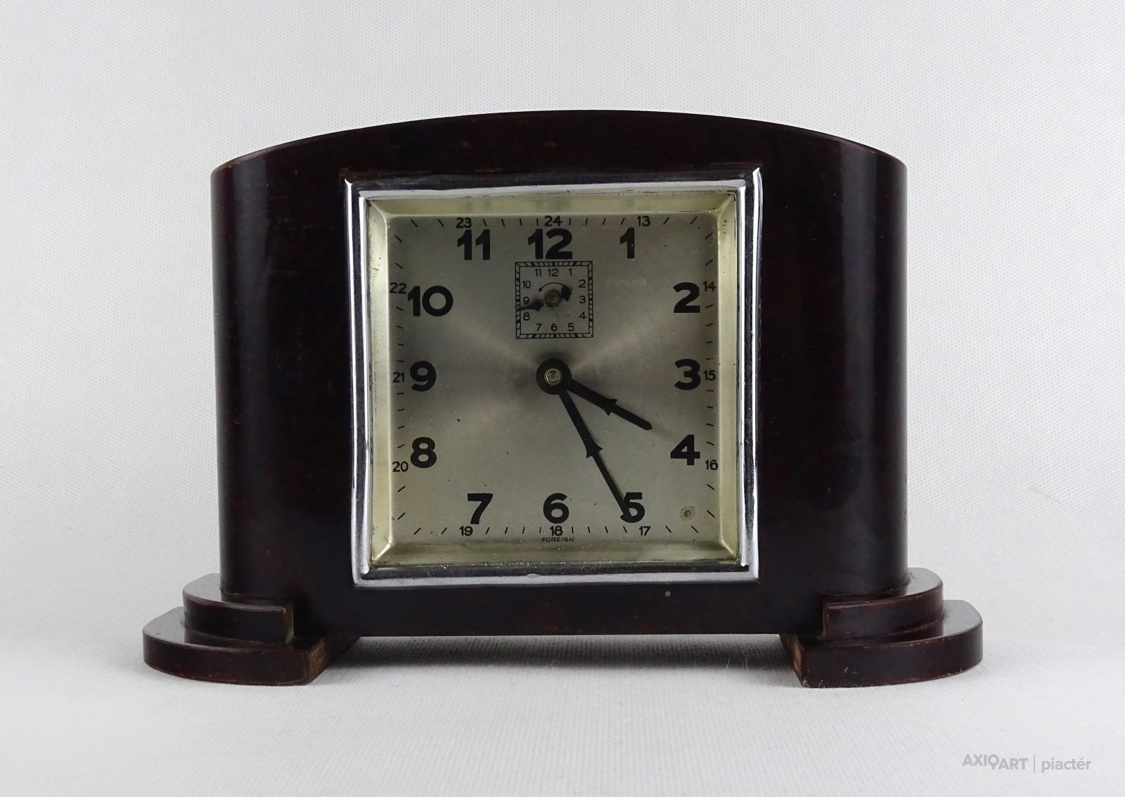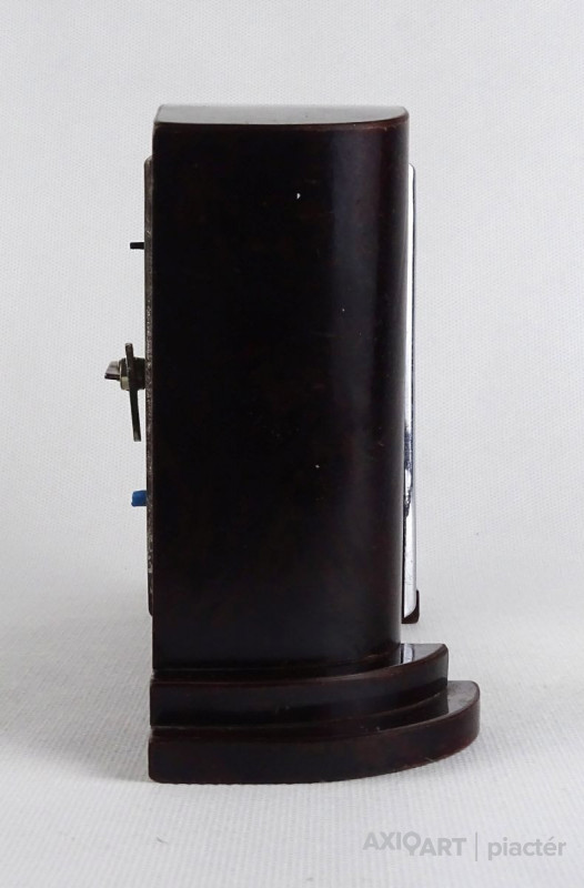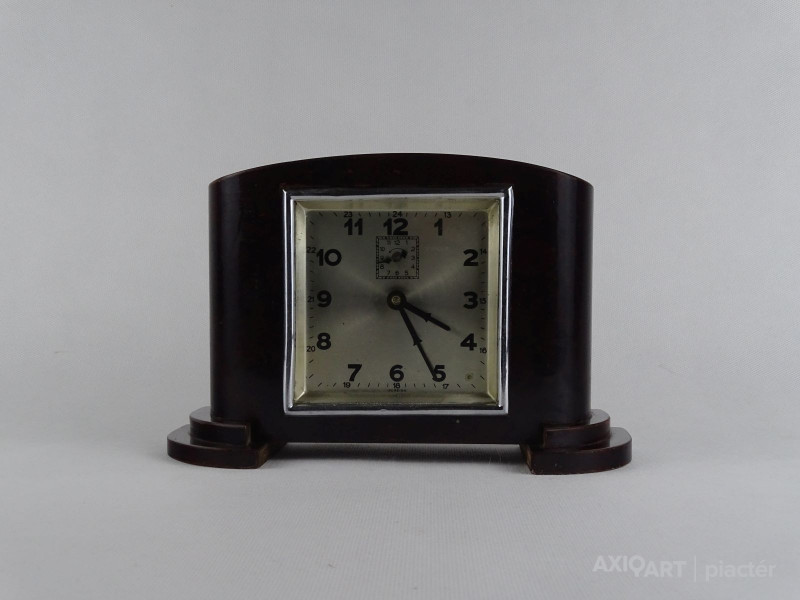 [1T357/X164] Gyönyörű, szép állapotú furnérozott art deco fa óra, működő szerkezettel. CSak kipróbálva lett, hosszasan tesztelve nem. Jár. Kulcsai nincsenek meg. Számlapon felirat: FOREIGN Magasság: 14.5 cm Szélesség: 22.7 cm Súly: 0.815 kg