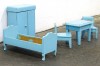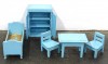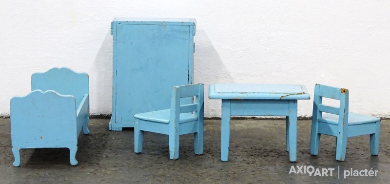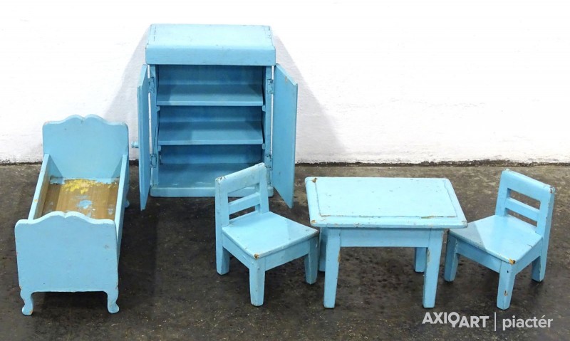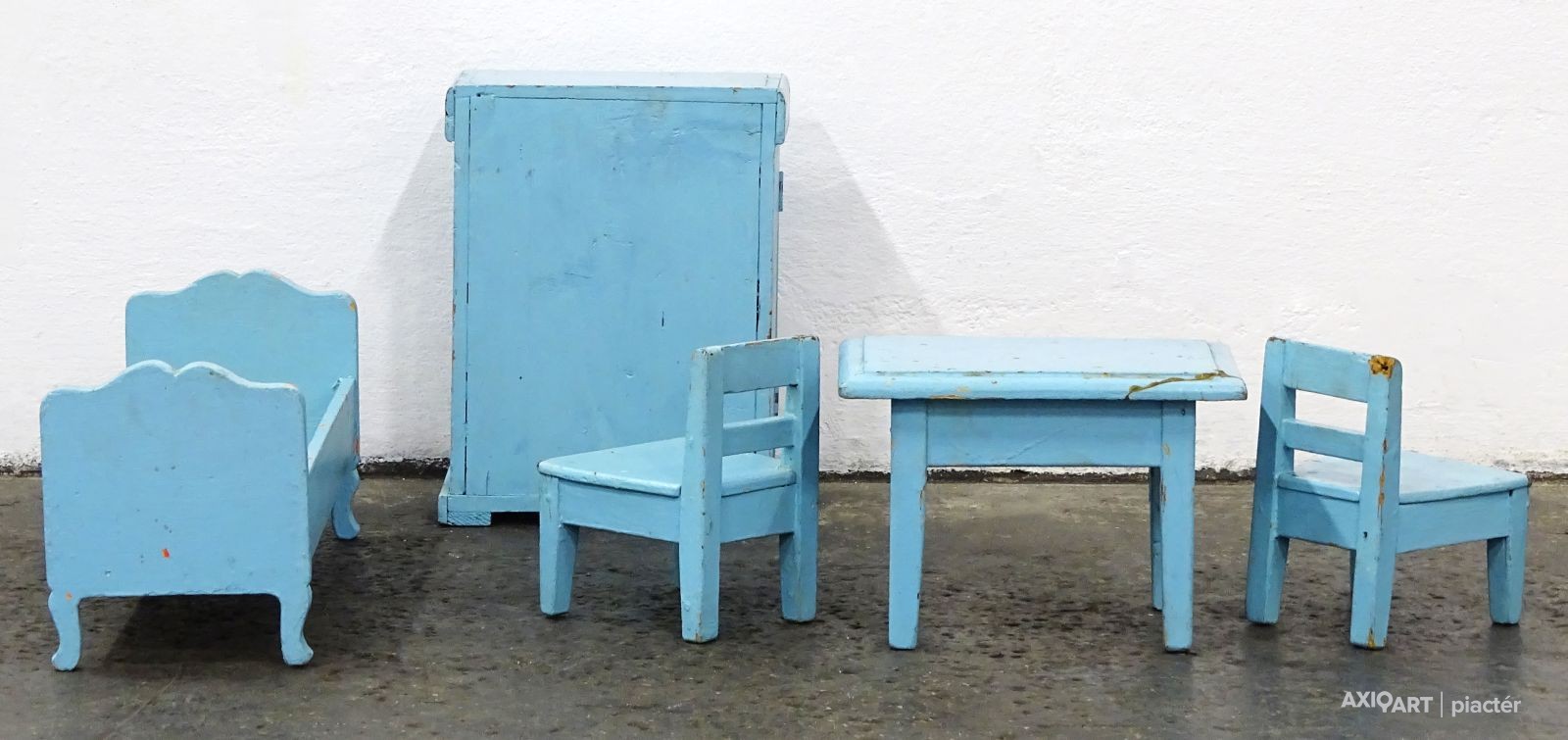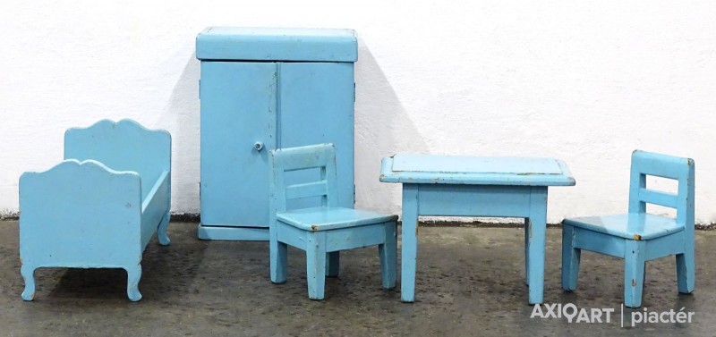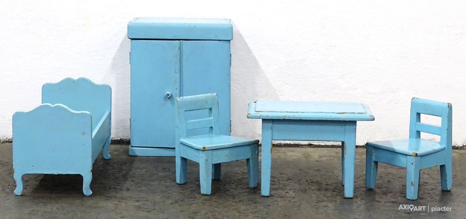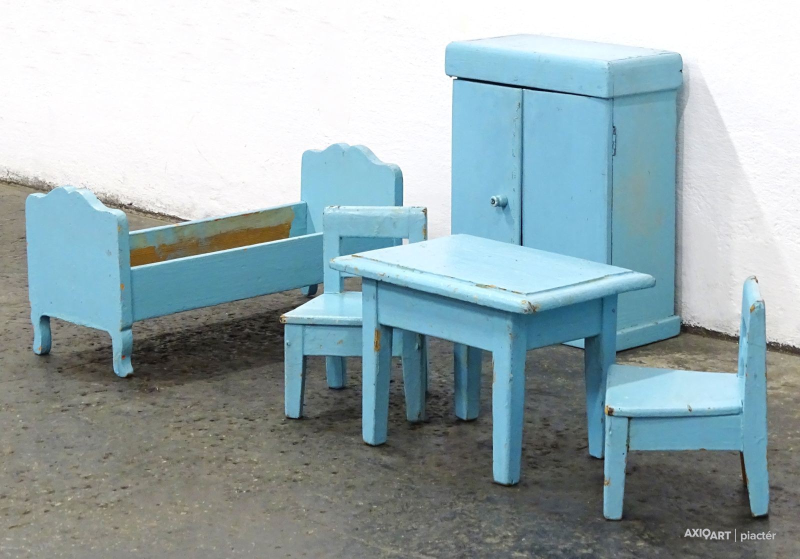[0O872/W016] Nagyon régi, kék színű babaszoba, baba bútor berendezés: - 1 darab polcos szekrény (33 x 25.5 x 12.5 cm) - 1 darab ágy, heverő (16.5 x 20 x 41.5 cm) - 1 darab asztal (18.5 x 18 x 26.5 cm) - 2 darab szék (15 x 14 x 19.5 cm) Súly: 3.79 kg