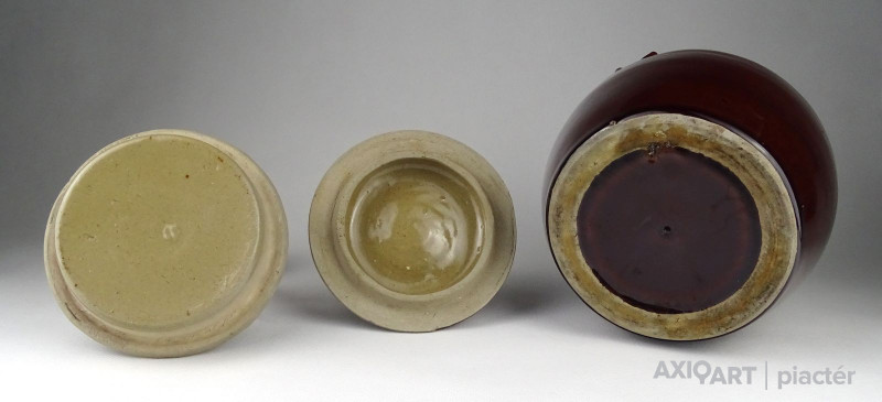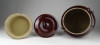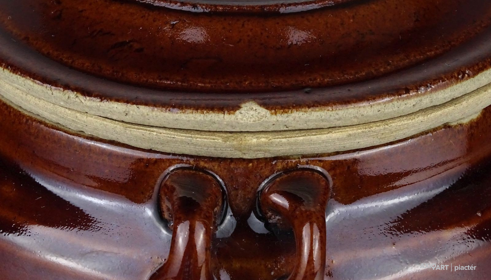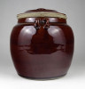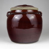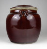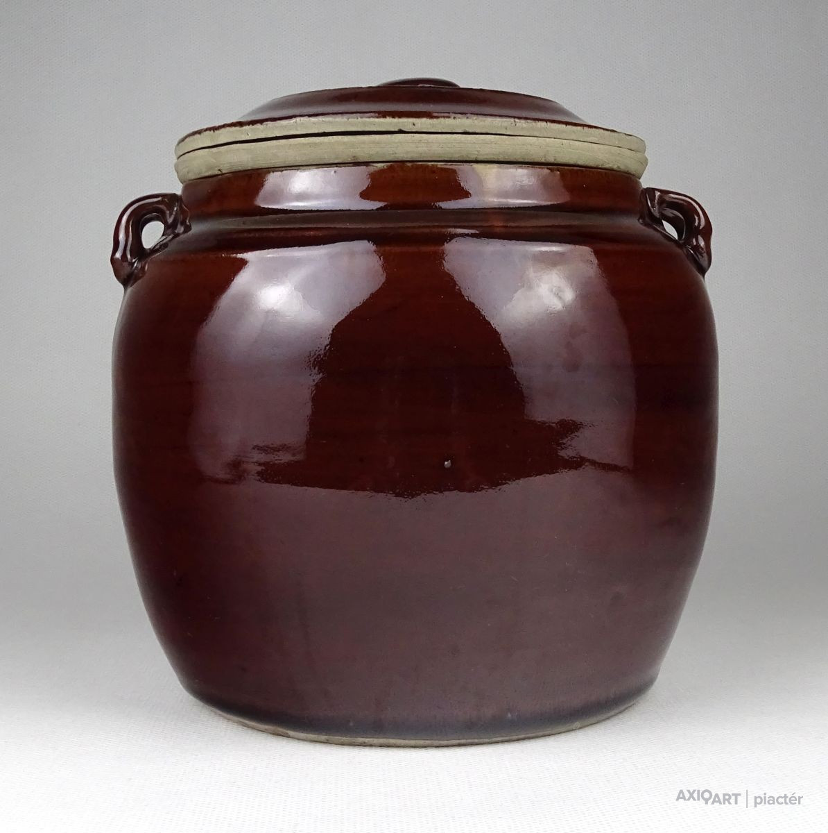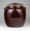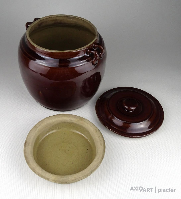 Régi, kis méretű barna mázas fedeles kerámia edény. Keleti néprajzi, népművészeti kerámia edény fülekkel.
