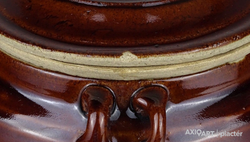 [1J522/X326] 25% ÁRENGEDMÉNY MINDEN TERMÉKÜNKRE Dec. 14-ig Régi, kis méretű barna mázas fedeles kerámia edény. Keleti néprajzi, népművészeti kerámia edény fülekkel. Magasság: 16 cm Szélesség: 20 cm Hosszúság: 29.3 cm Súly: 1.115 kg