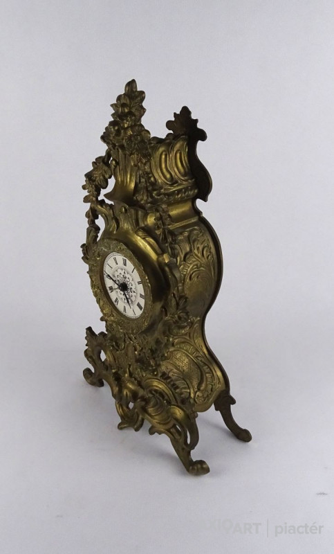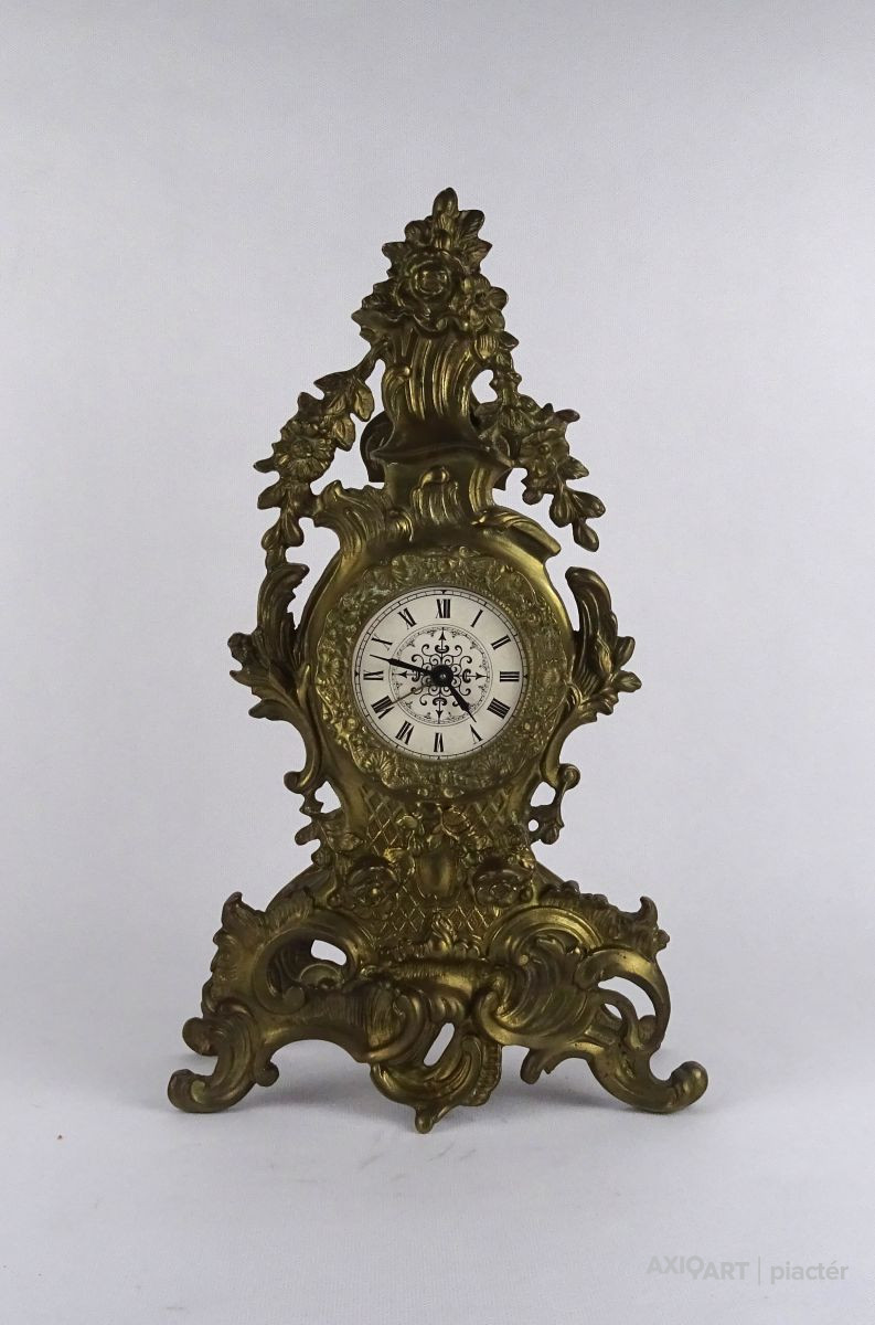 Nagyméretű réz, asztali óra, kandalló óra. Plasztikus virágokkal gazdagon díszített impozáns darab.