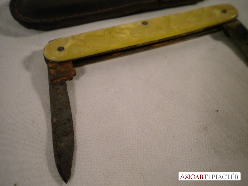 [V317/X032/1] Színes kagyló berakás díszítéses nyéllel, Bőr tokban található . A zsebkés kora cca. két világháború közötti. A pengéken rozsdafoltok láthatóak. Hosszúság: 9.5 cm
