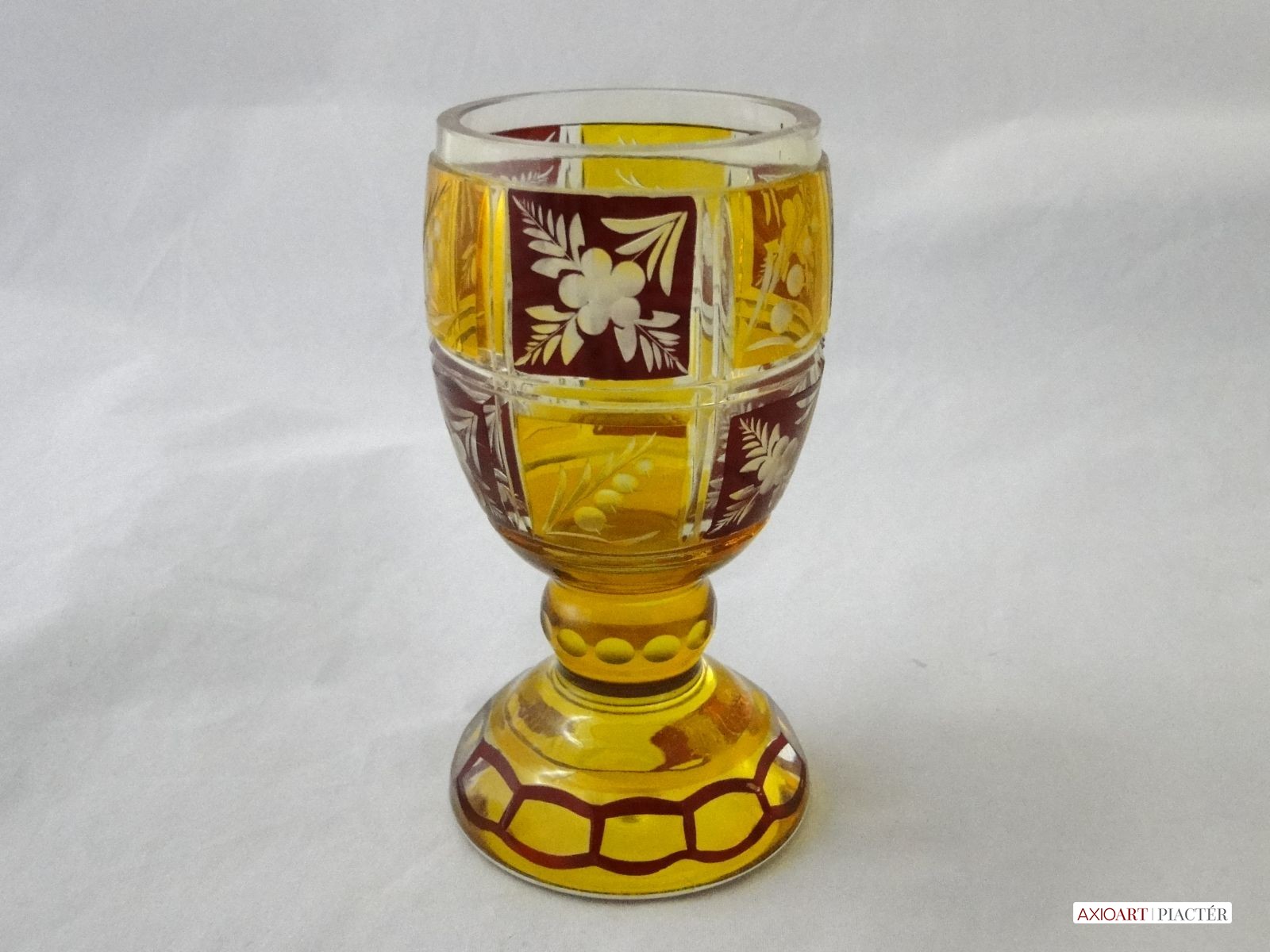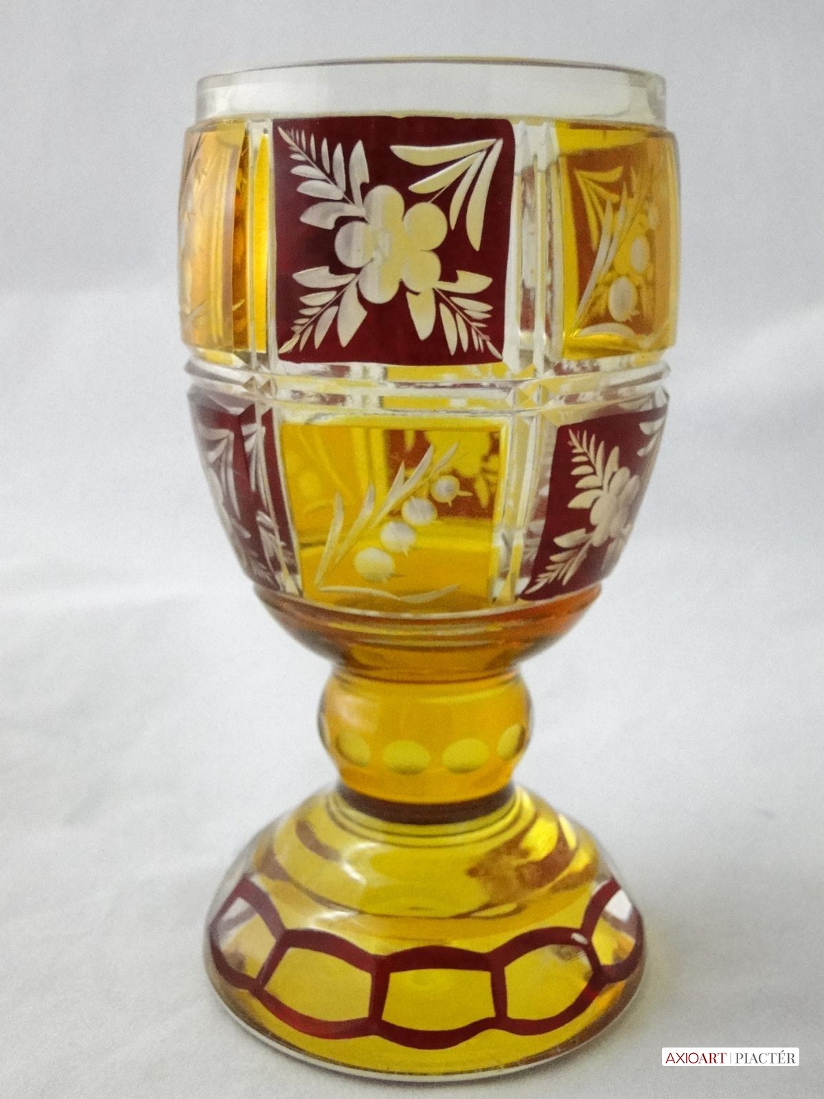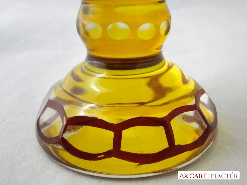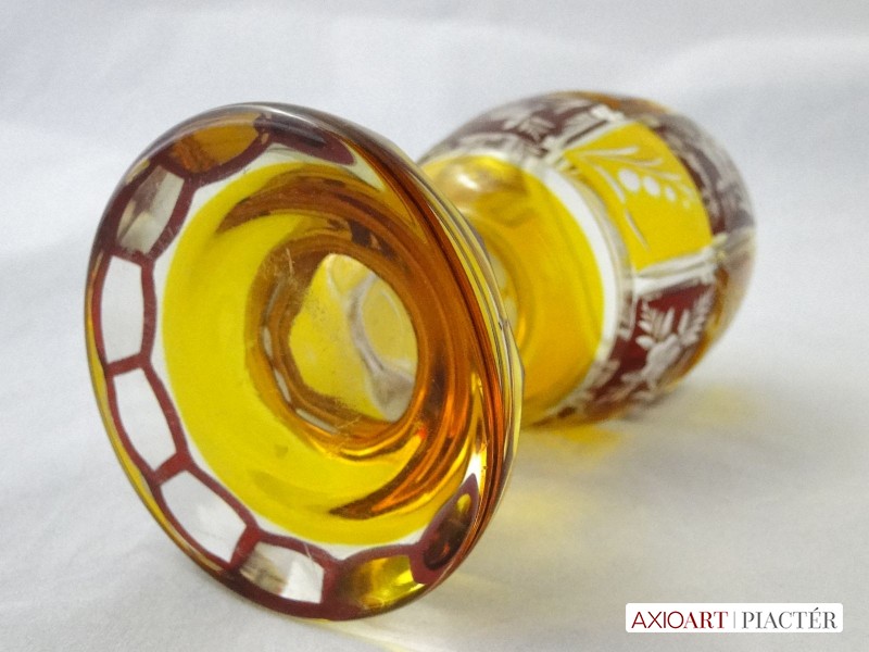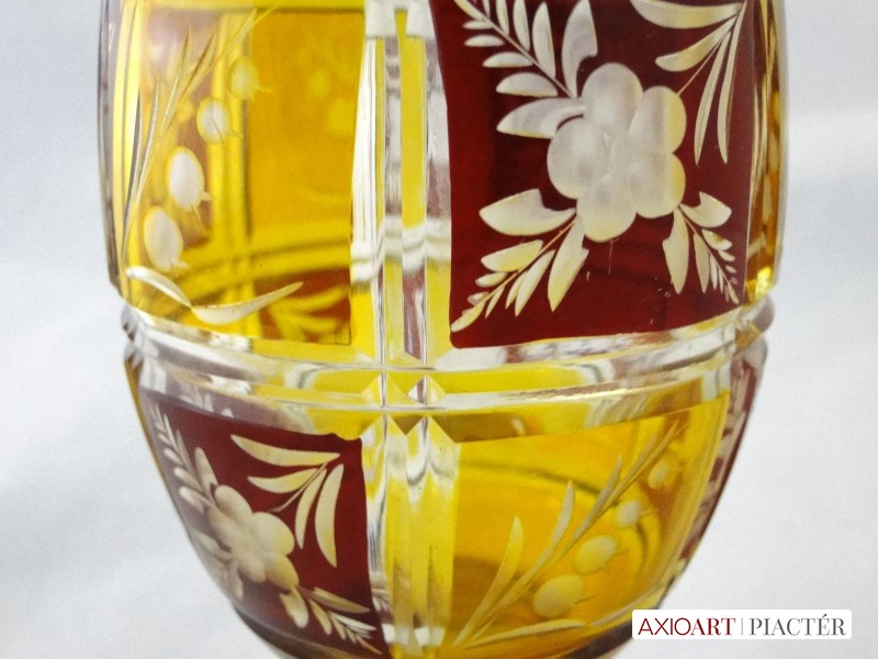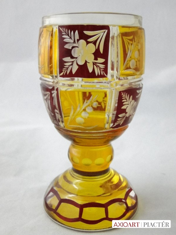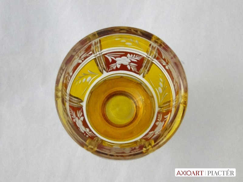 Kazettás csiszolt díszítéssel. Az antik pohár teste 12 kazettára van megcsiszolva. A pohár talpa és törzse is 12 oldalra csiszolt. Sárga, bordó színű a darab.