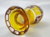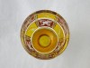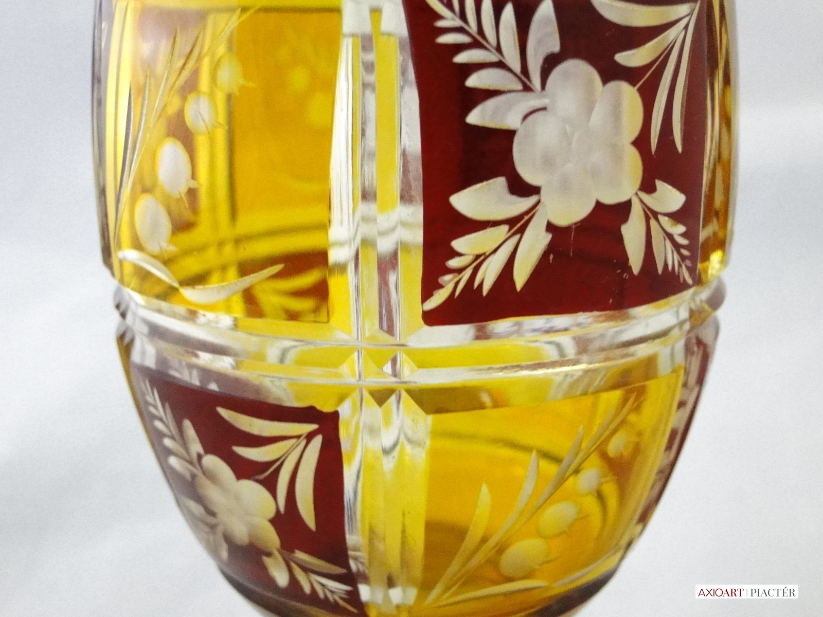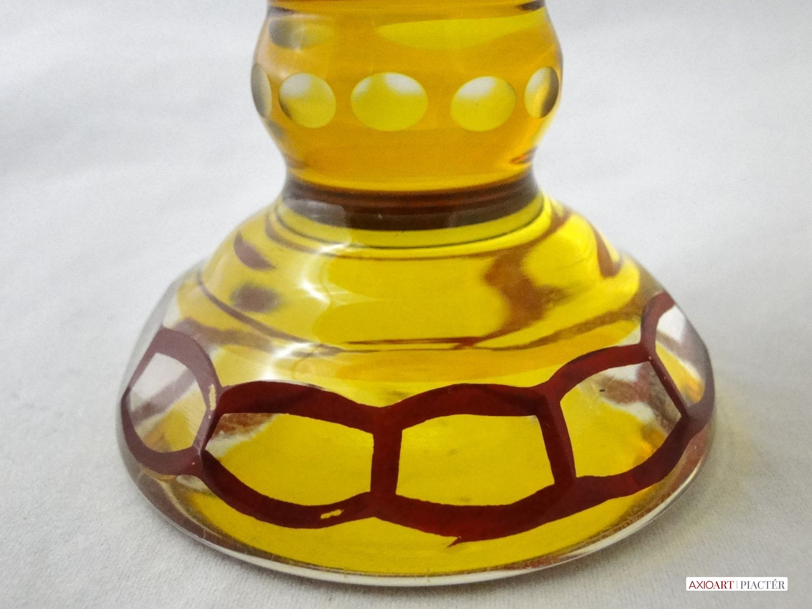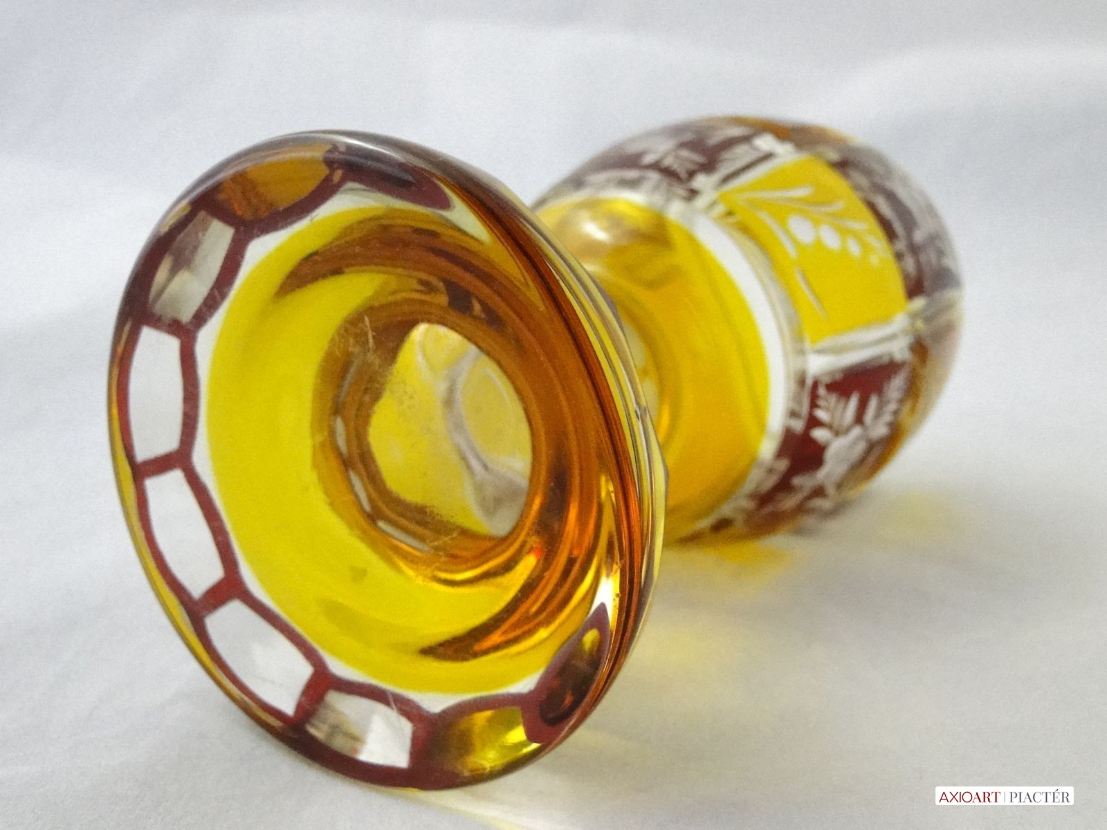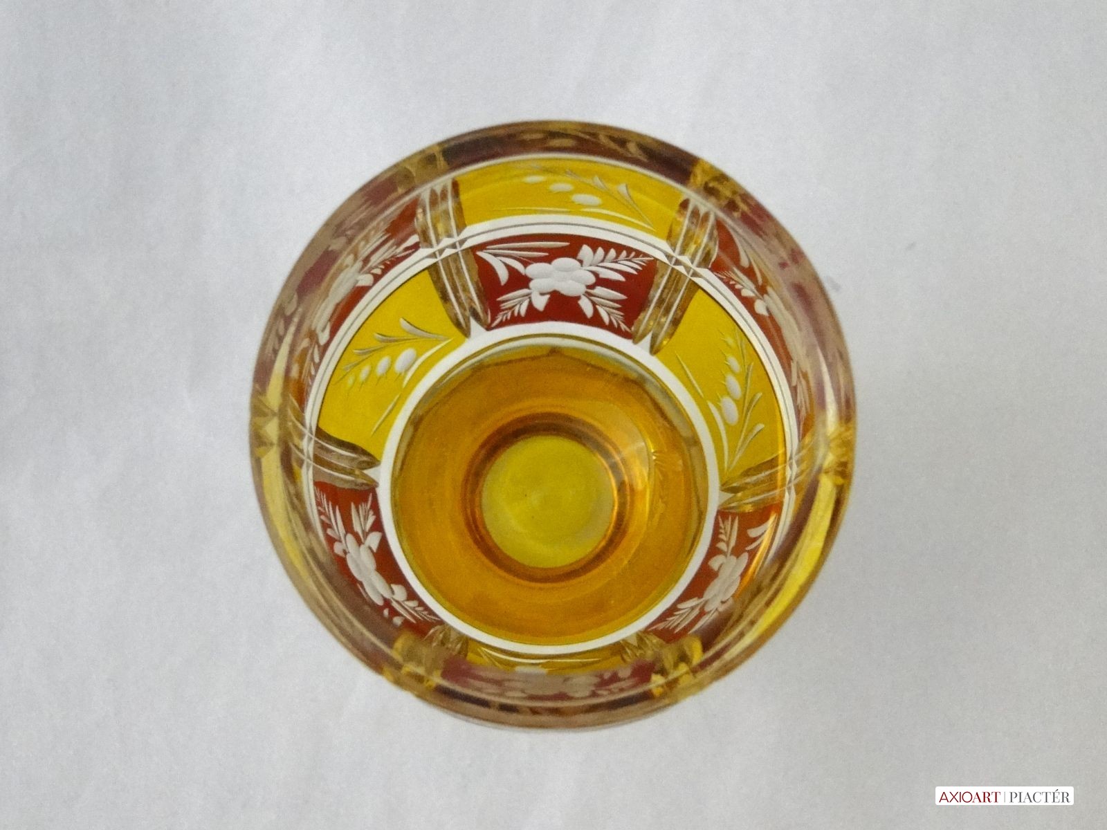 Kazettás csiszolt díszítéssel. Az antik pohár teste 12 kazettára van megcsiszolva. A pohár talpa és törzse is 12 oldalra csiszolt. Sárga, bordó színű a darab.