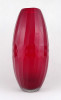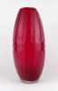 [1Y076/Z041] Hibátlan állapotú, nagyméretű, bordóra színezett, bordásra csiszolt és geometrikus mintákkal díszített, vastagfalú, art deco fújtüveg design váza, díszváza. Alján a fújás és szakítás nyoma szépen csiszolással lett eltüntetve. Látványos, gyűjteménybe illő darab. Magasság: 31.5 cm Szélesség: 14.5 cm Súly: 1.495 kg   Magassága 37 cm, átmérője 17 cm. Súlya: 1668 g