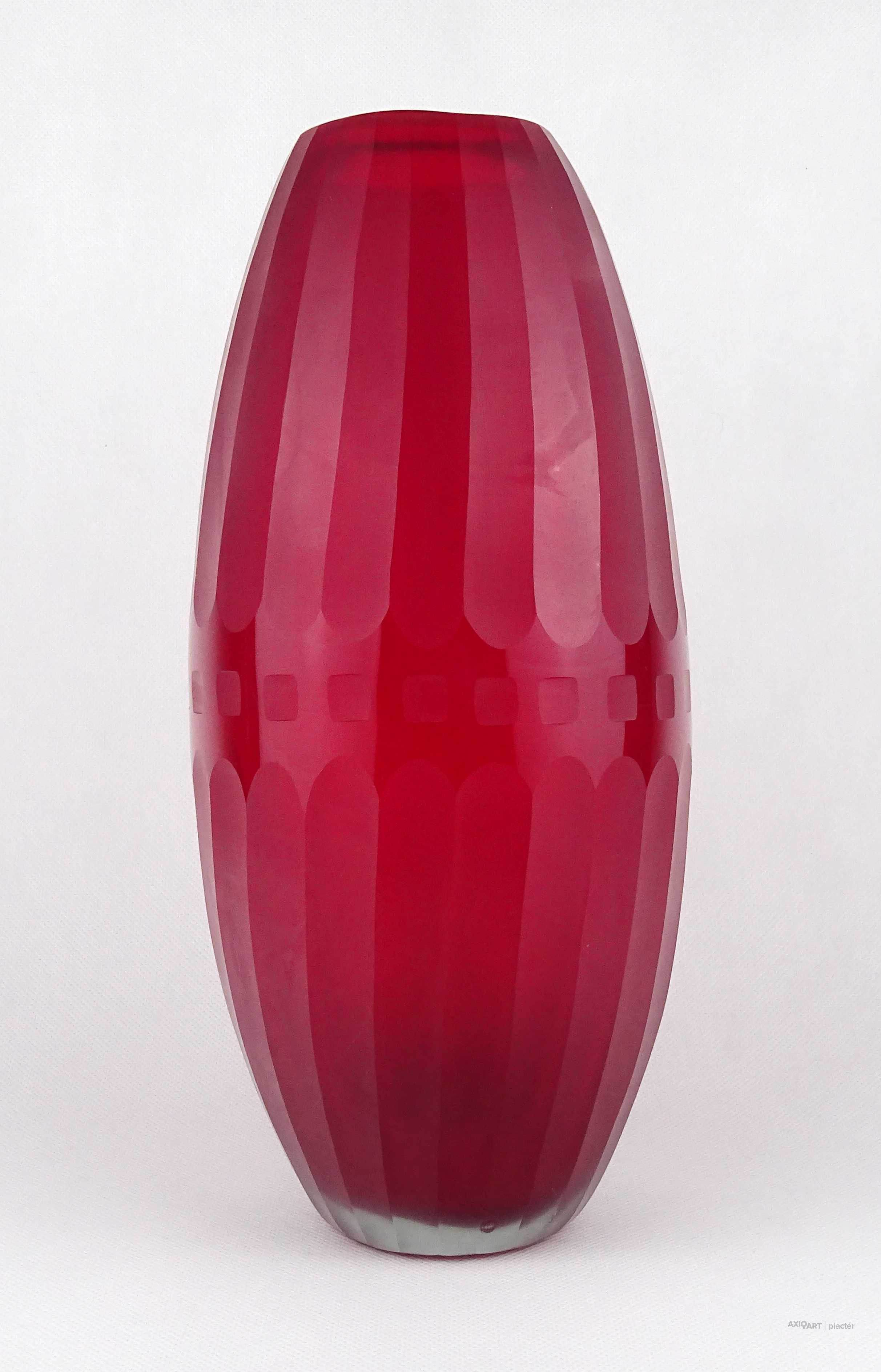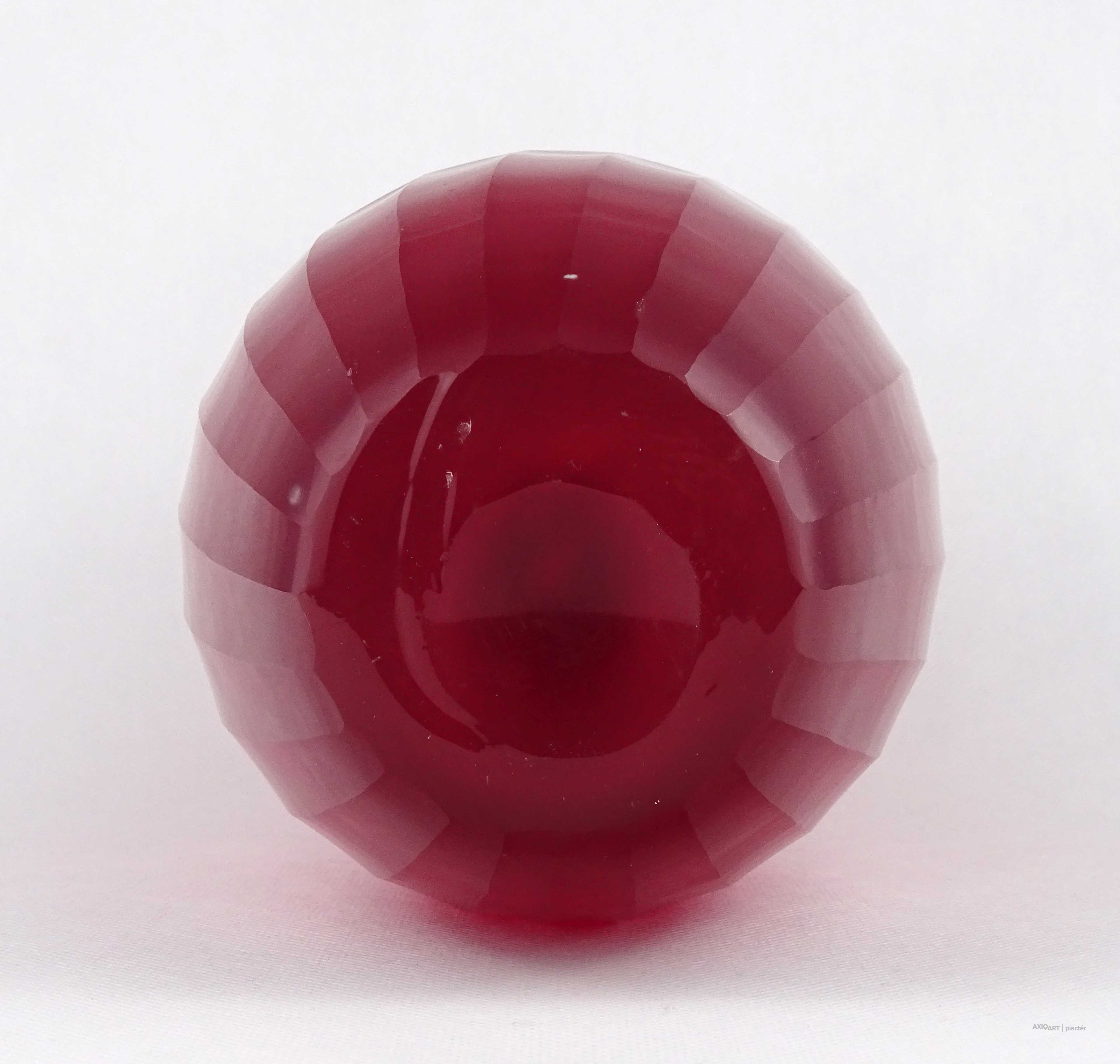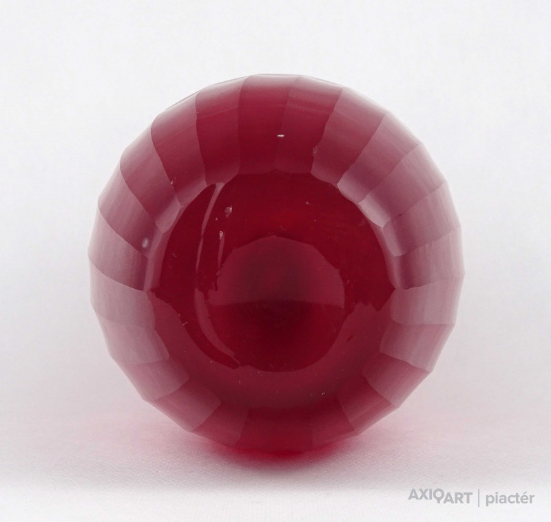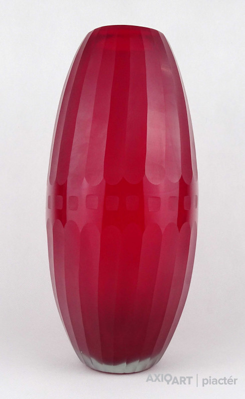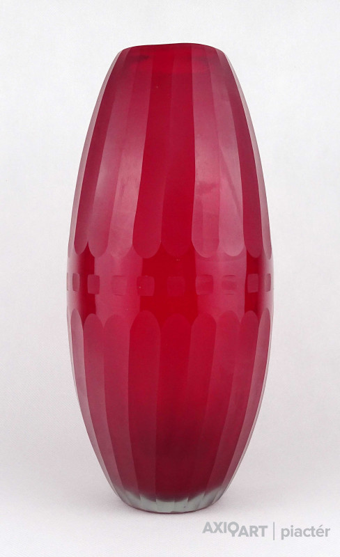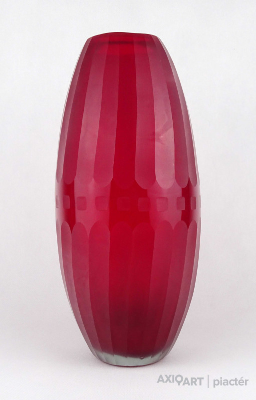 Hibátlan állapotú, nagyméretű, bordóra színezett, bordásra csiszolt és geometrikus mintákkal díszített, vastagfalú, art deco fújtüveg design váza, díszváza. Alján a fújás és szakítás nyoma szépen csiszolással lett eltüntetve. Látványos, gyűjteménybe illő darab.